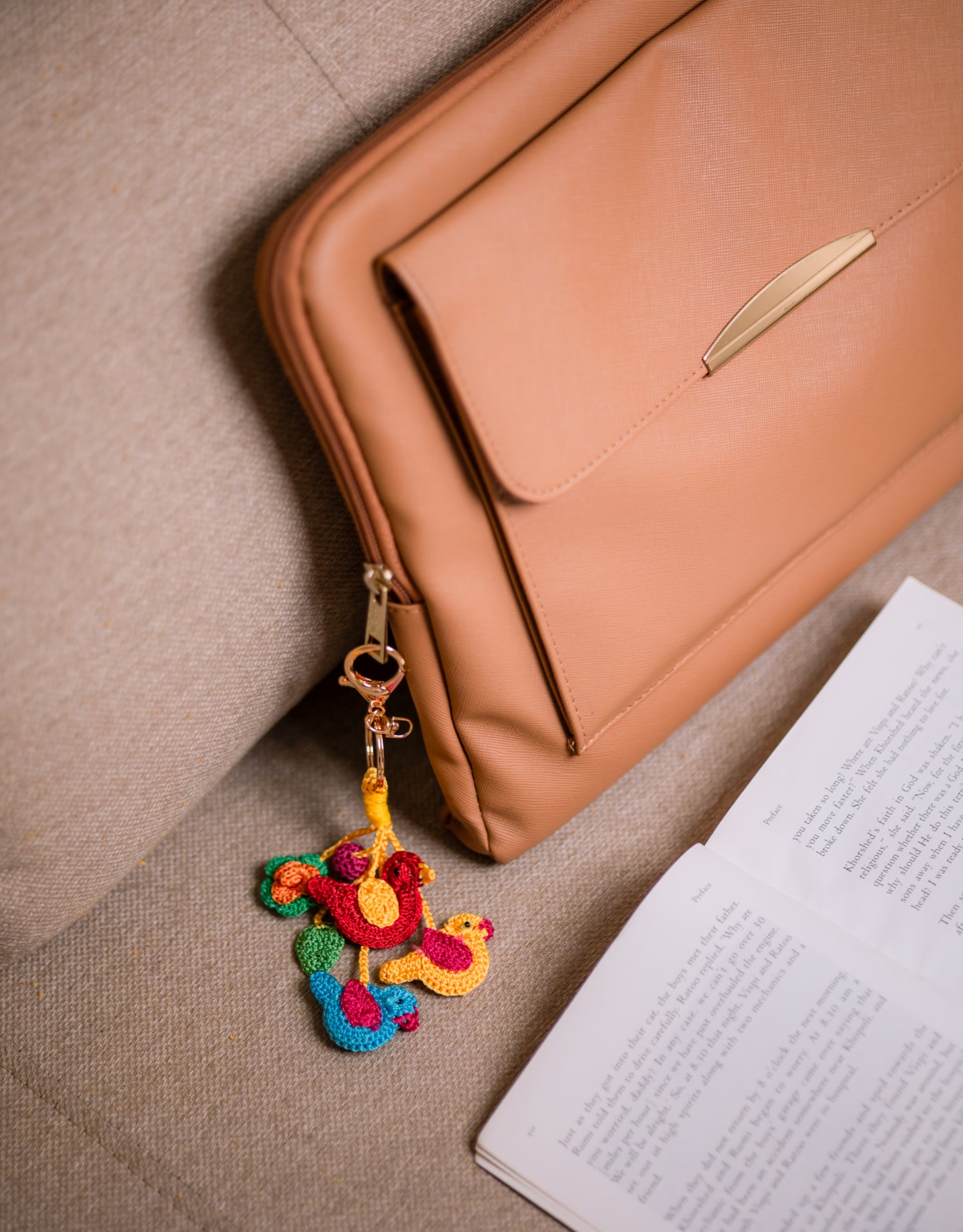 Material: Viscose Thread, Wooden Beads, Metal Keychain Hook, Glass Beads