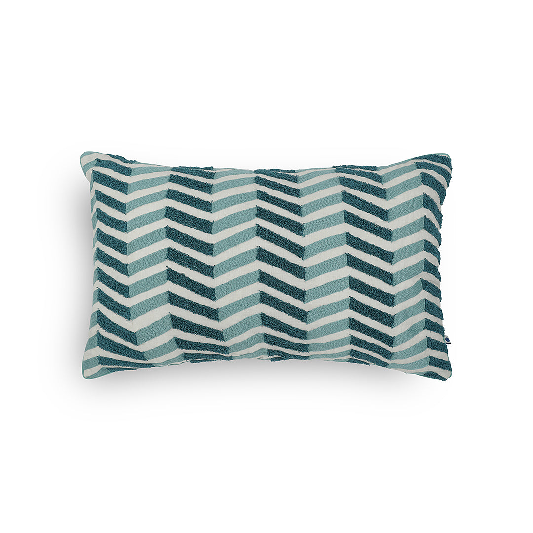 Elegance meets artistry in this exquisite cushion, meticulously crafted using toweling and crewel hand embroidery techniques. A mesmerizing zigzag pattern dances across a linen metallic base, adding a touch of subtle opulence. Tonal blue and turquoise hues delicately grace the off-white canvas, creating a harmonious symphony of colors, making it a sophisticated centerpiece for any space