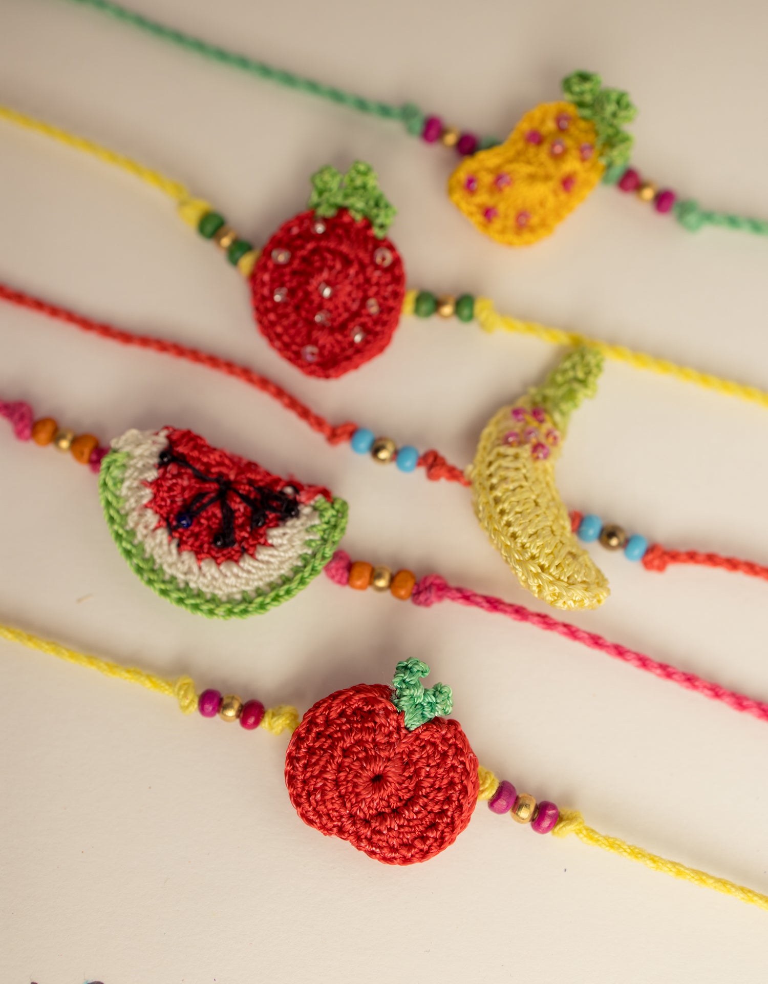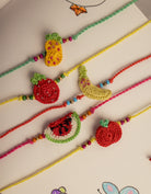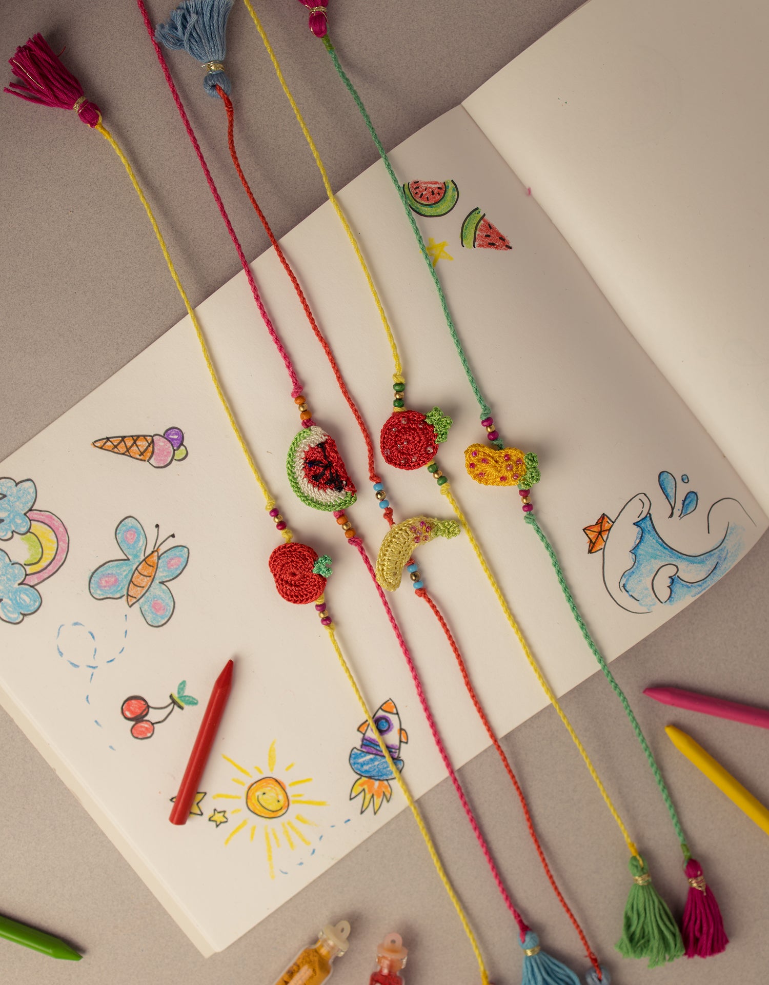 Bring joy, colour, and playfulness to your little one’s Raksha Bandhan with our handcrafted Kids Rakhis. Made with love by women artisans from Gaya, each Rakhi features vibrant crochet motifs—from animals and fruits to playful swirls—designed to delight children and celebrate the magic of sibling bonds. These Rakhis are: safe, soft, and skin-friendly, perfect for delicate wrists, and a blend of fun and tradition, created to last as keepsakes. Every Rakhi is packed in a handcrafted pouch with kumkum, rice, and sweet treats, making it a complete festive bundle. Add a personal note to make your little ones feel even more special.
