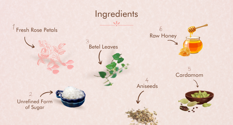 This Gulkand is made from fresh rose petals, betel leaves, aniseeds, elaichi, raw honey, and mishri (an unrefined form of sugar), which has their own medicinal values.