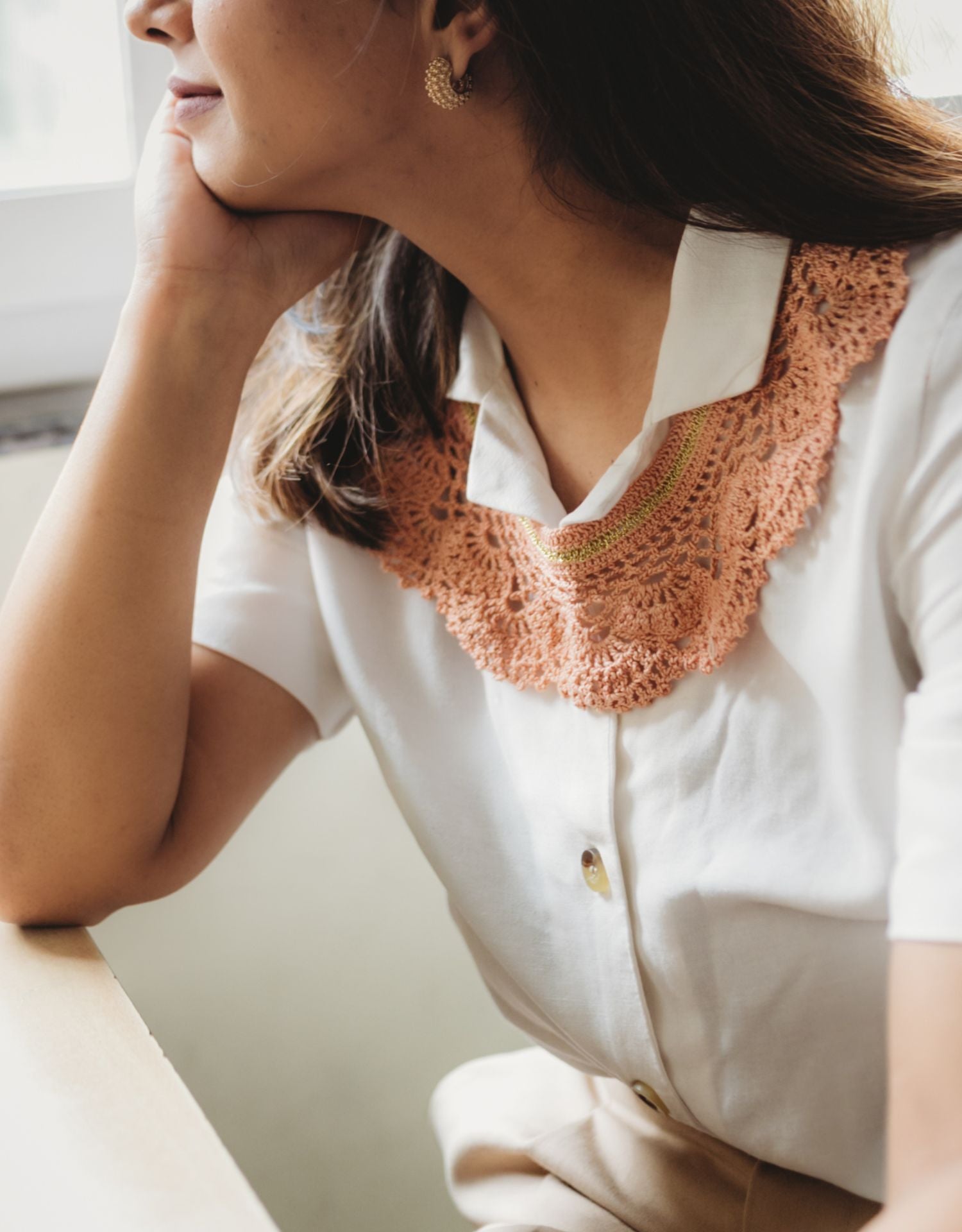 Cotton and zari, crocheted laces to adorn. A classic addition to your most basic styles, inspired from the vintage crocheted collars. These handmade accessories are minimal yet a statement of art. Either pair it with similar tones or form a contrast, it will always play the magic!!