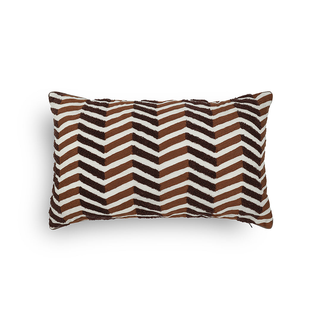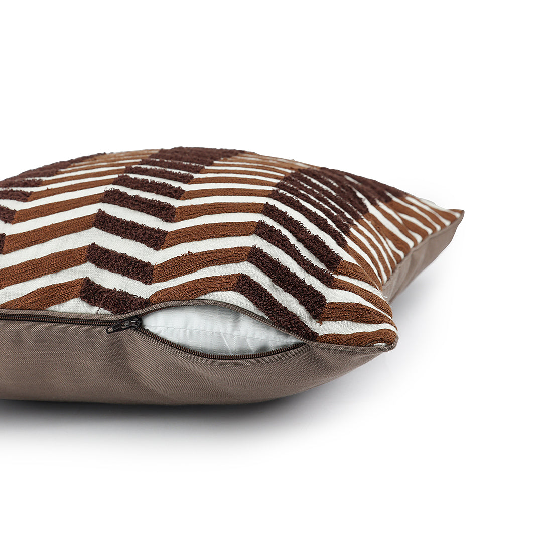 Elegance meets artistry in this exquisite cushion, meticulously crafted using toweling and crewel hand embroidery techniques. A mesmerizing zigzag pattern dances across a linen metallic base, adding a touch of subtle opulence. Tonal brown hues delicately grace the off-white canvas, creating a harmonious symphony of colors, making it a sophisticated centerpiece for any space