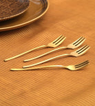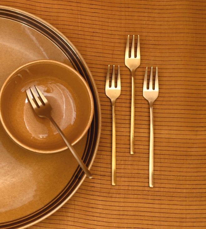 This set of 4 stunning Gold Mryda Desert Fork from Courtyard is perfect for your home. The shimmering brass finish is eye-catching and will add a contemporary and sophisticated touch to any dining table. The comfortable handle fits securely in your hand as you serve up your favourite meals. Perfect for special occasions or as an everyday accessory. Disclaimer: All other items in the image are only for display purposes and will not be a part of the delivery content. Product colour may slightly vary due to photographic lighting sources. Country of Origin - India.