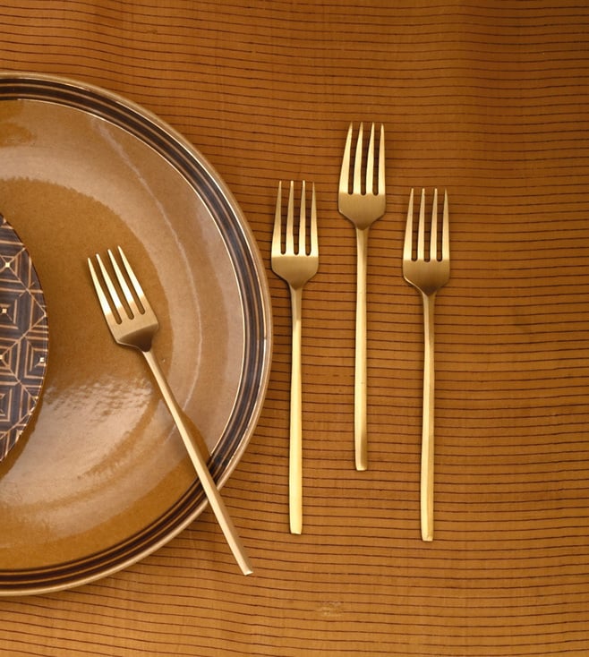 Upgrade your kitchenware collection with the Courtyard Gold Mryda Tea Fork Set. These durable and stylish forks come in a set of 4 and are perfect for special occasions or everyday use. Crafted from high-quality Brass, the gold-plated forks are easy to hold, making them ideal for grabbing a bite or stirring your cup of tea. Disclaimer: All other items in the image are only for display purposes and will not be a part of the delivery content. Product colour may slightly vary due to photographic lighting sources. Country of Origin - India.