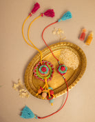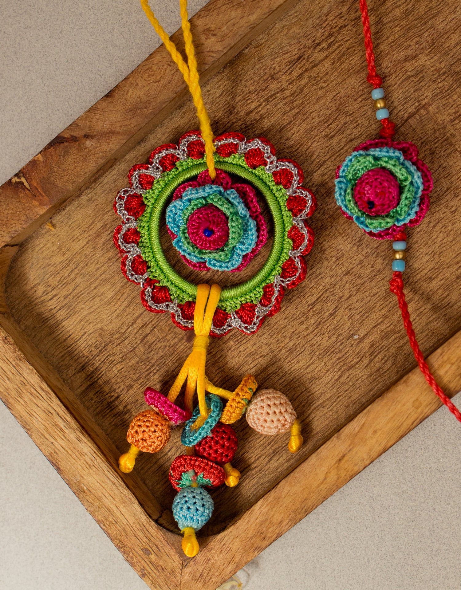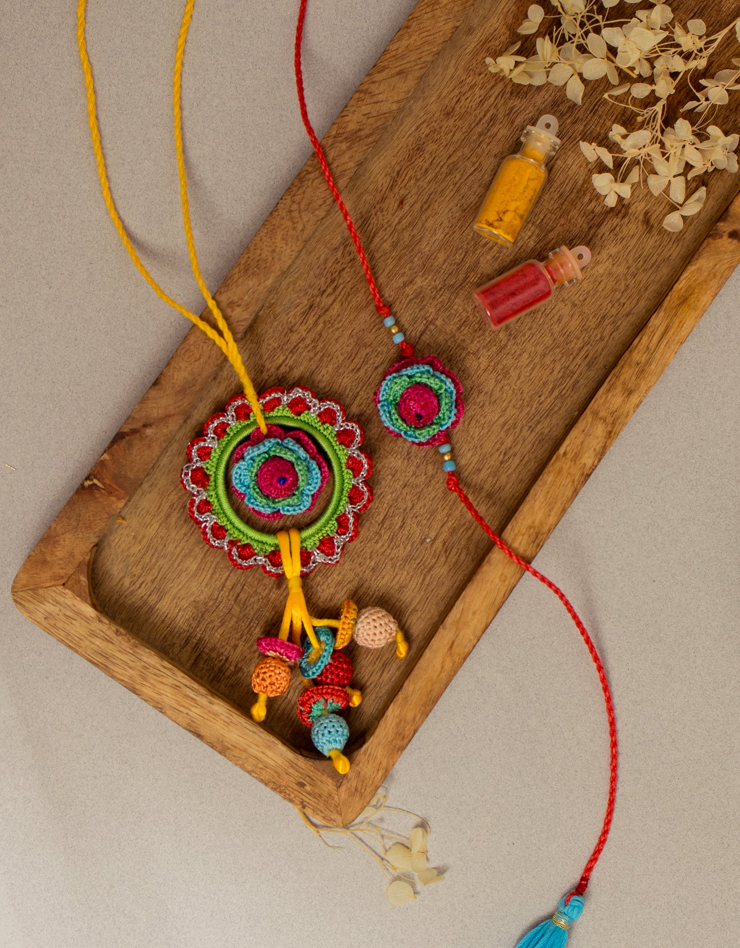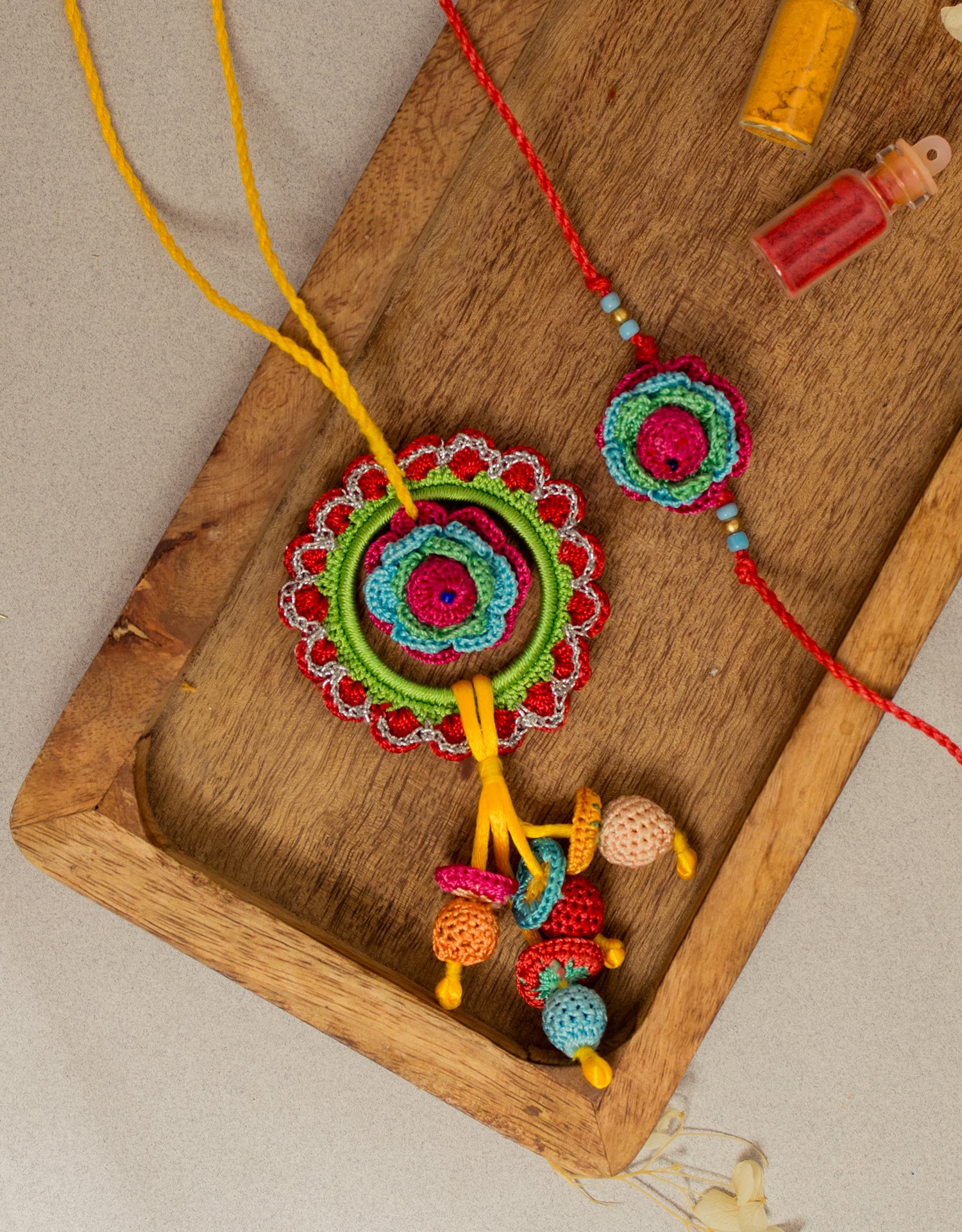 Celebrate the duo that makes your family complete with our handcrafted Rakhi-Lumba sets. Lovingly crocheted by skilled women artisans from Gaya, these sets feature delicate zari work, vibrant threads, and elegant tassels, blending traditional aesthetics with a modern, eco-conscious soul. Packed in a hancrafted pouch with kumkum, rice, and sweets, this set is ready to gift. Add a custom message to share your love in your own words.
