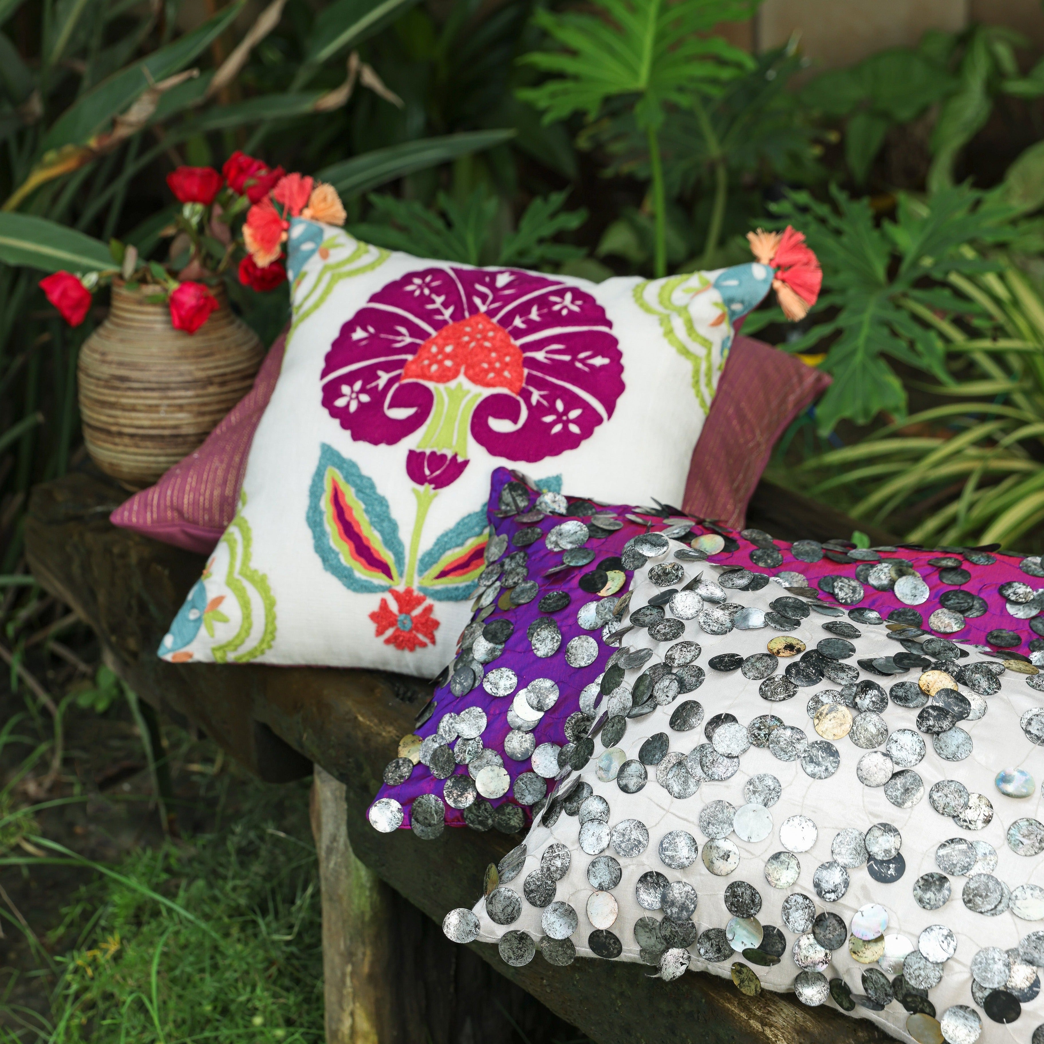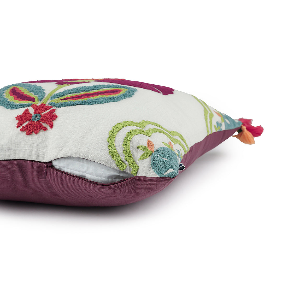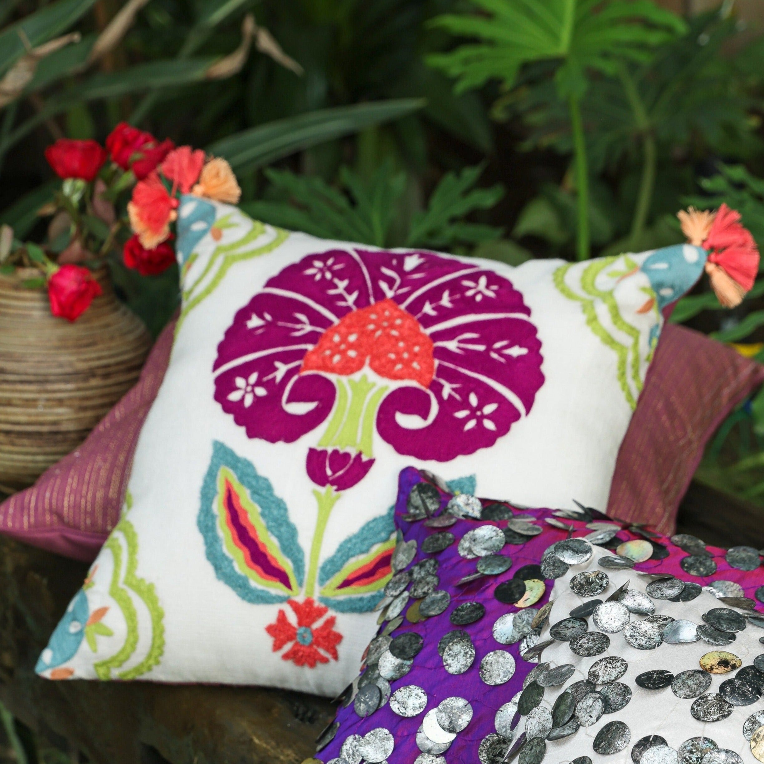Experience the essence of Indian artistry with this masterfully crafted cushion. Intricate crewel and towelling techniques converge to form a traditional 'boota' pattern, a testament to skilled hands and storied heritage. Against a linen backdrop, a hint of metallic imparts an elegant shimmer. This cushion is more than decor; it's a work of art, embodying India's cultural legacy. The purple colour of this cushion along with the pinks and green makes this a statement piece.