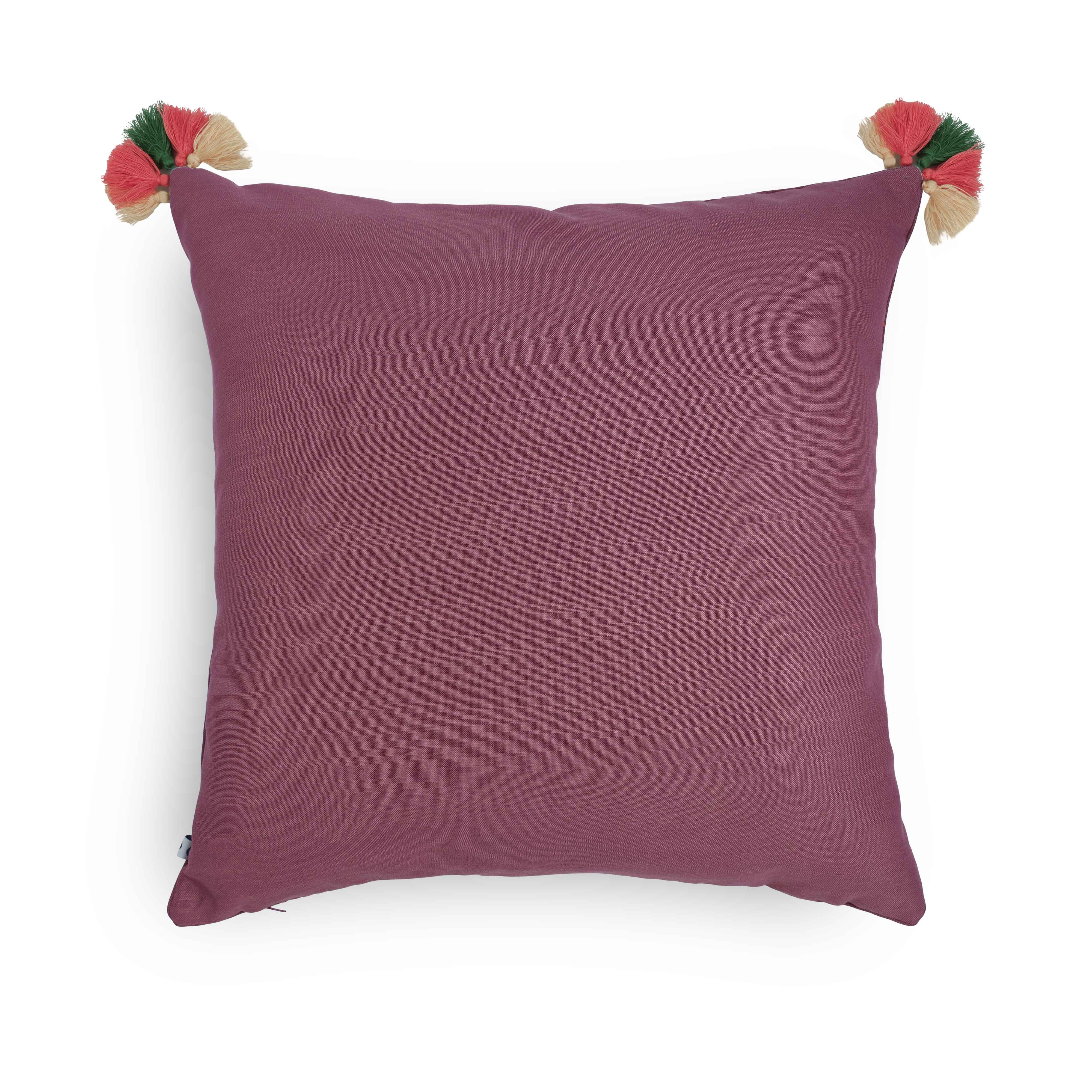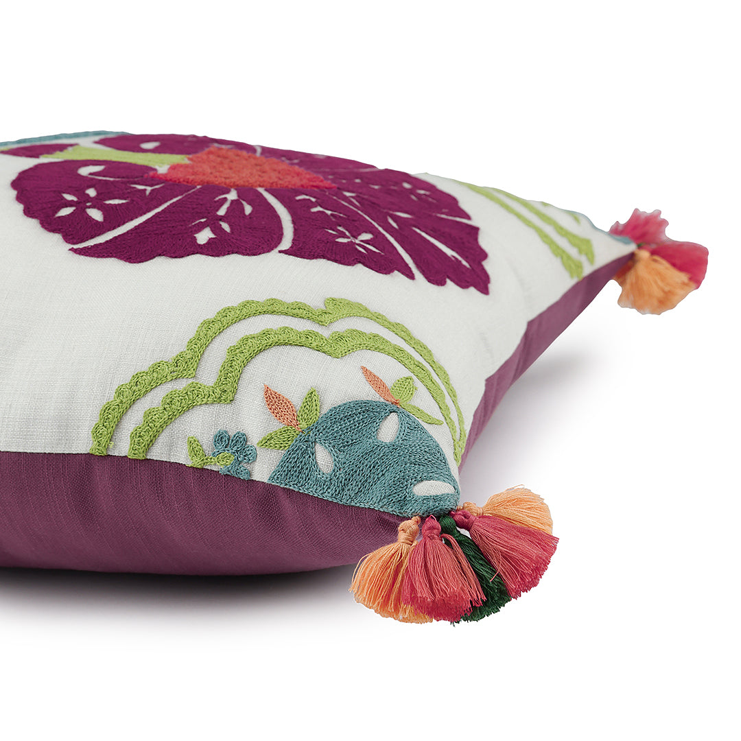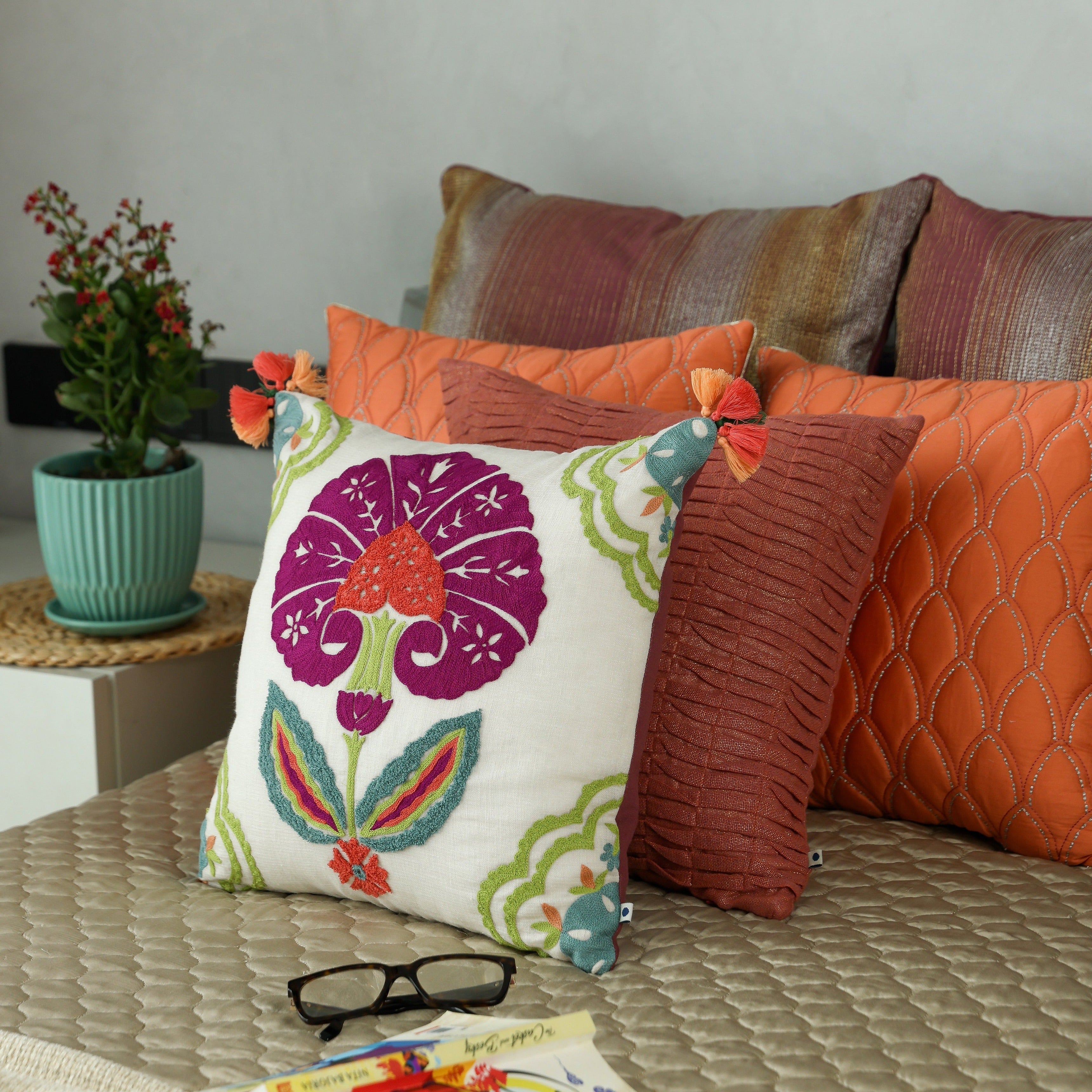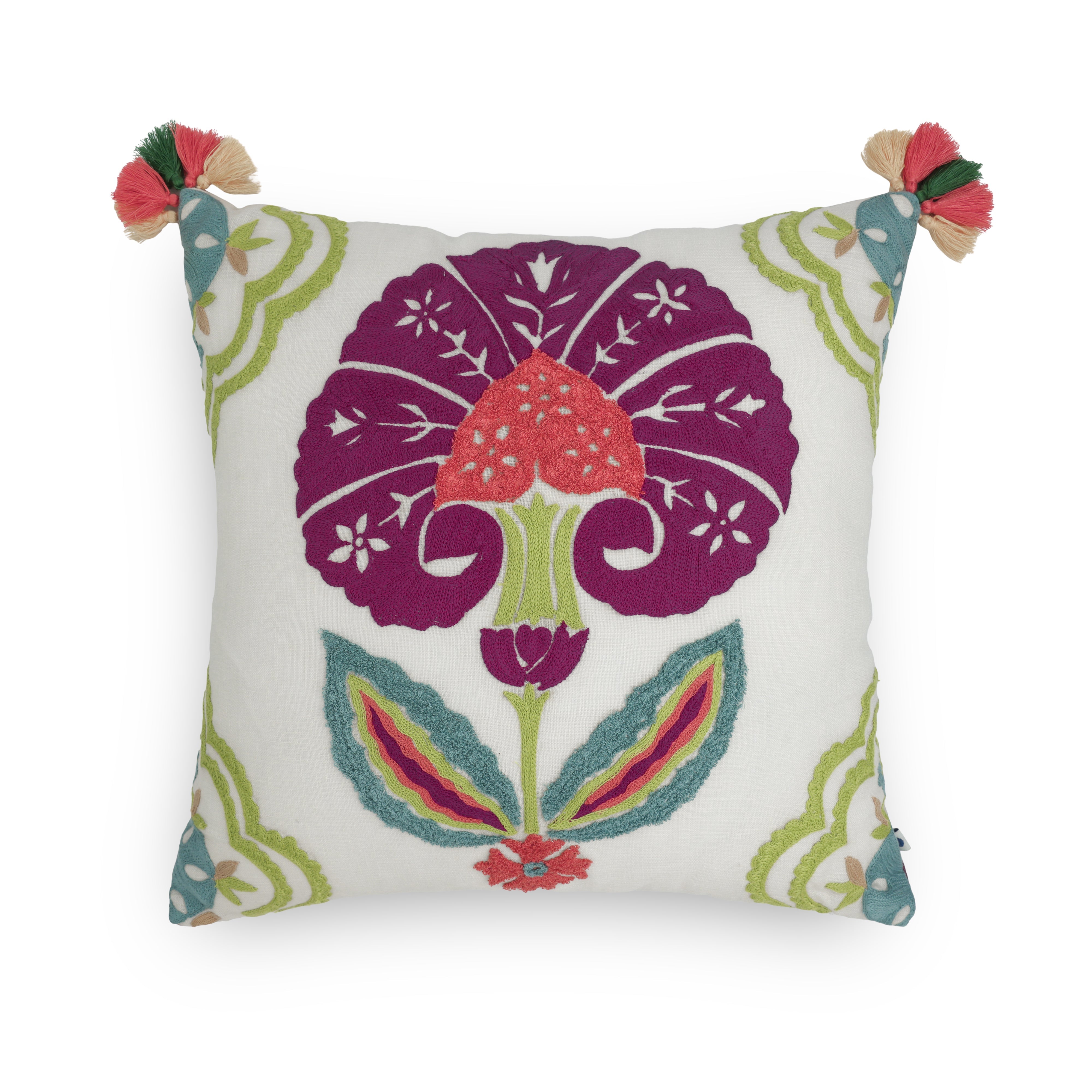 Experience the essence of Indian artistry with this masterfully crafted cushion. Intricate crewel and towelling techniques converge to form a traditional 'boota' pattern, a testament to skilled hands and storied heritage. Against a linen backdrop, a hint of metallic imparts an elegant shimmer. This cushion is more than decor; it's a work of art, embodying India's cultural legacy. The purple colour of this cushion along with the pinks and green makes this a statement piece.
