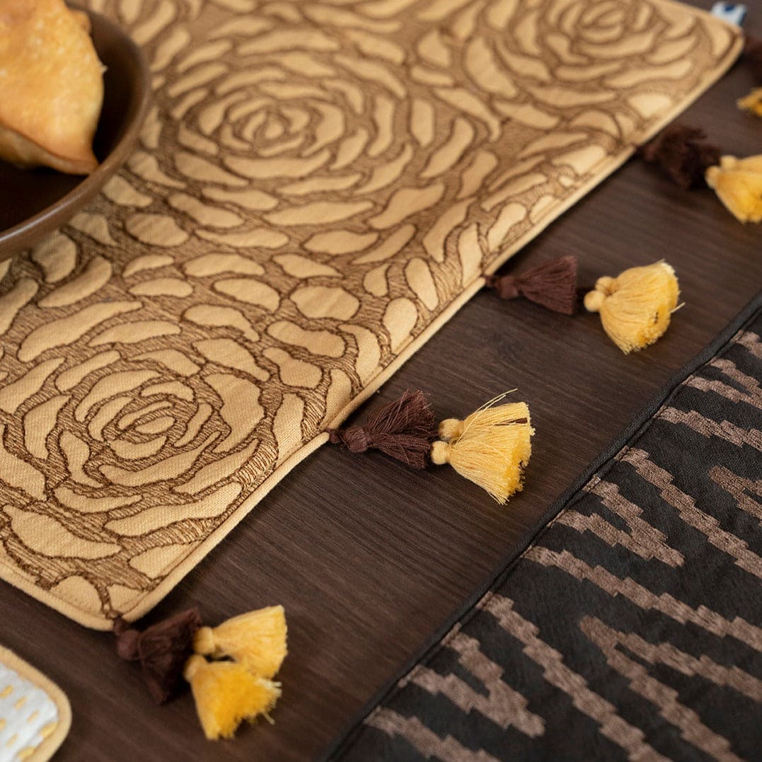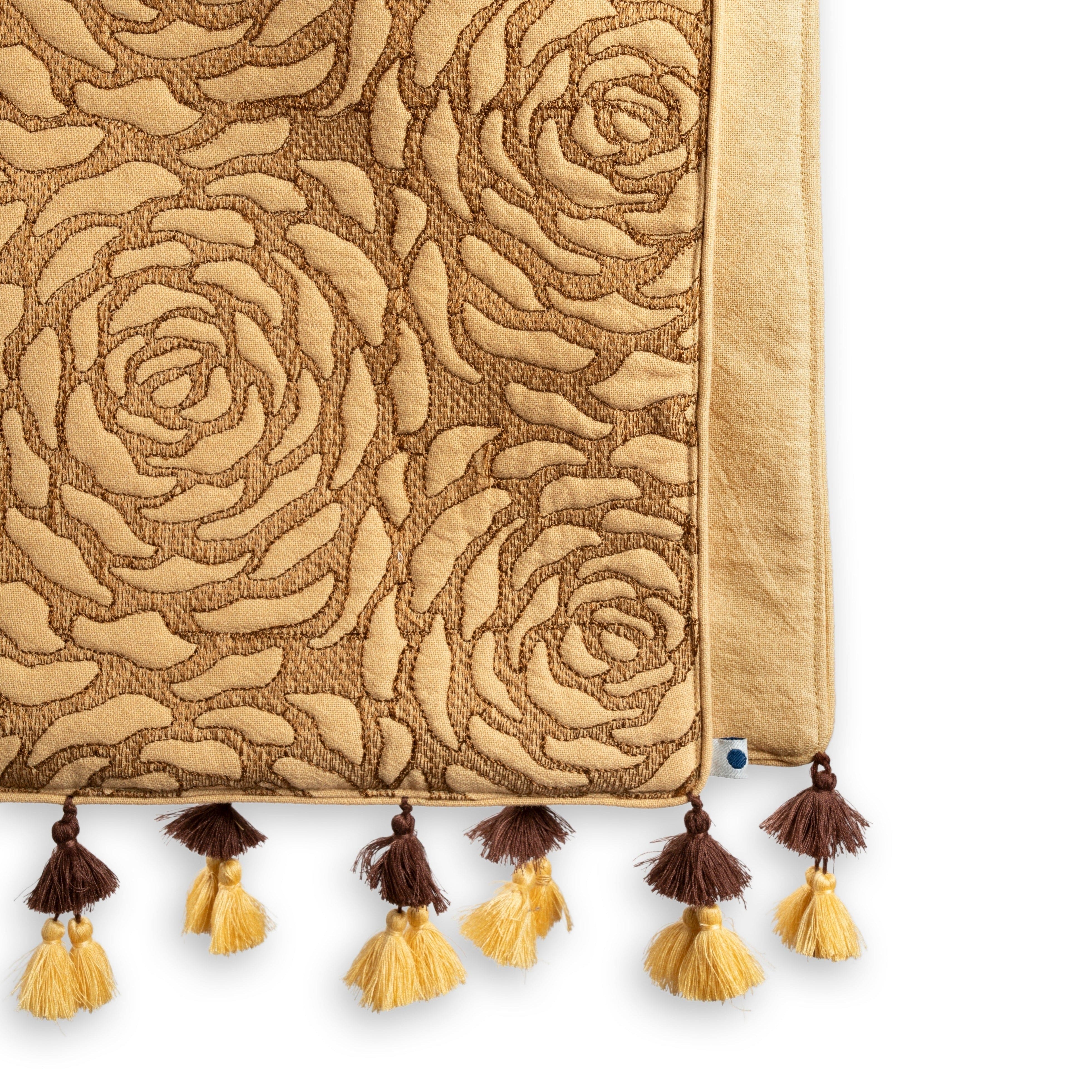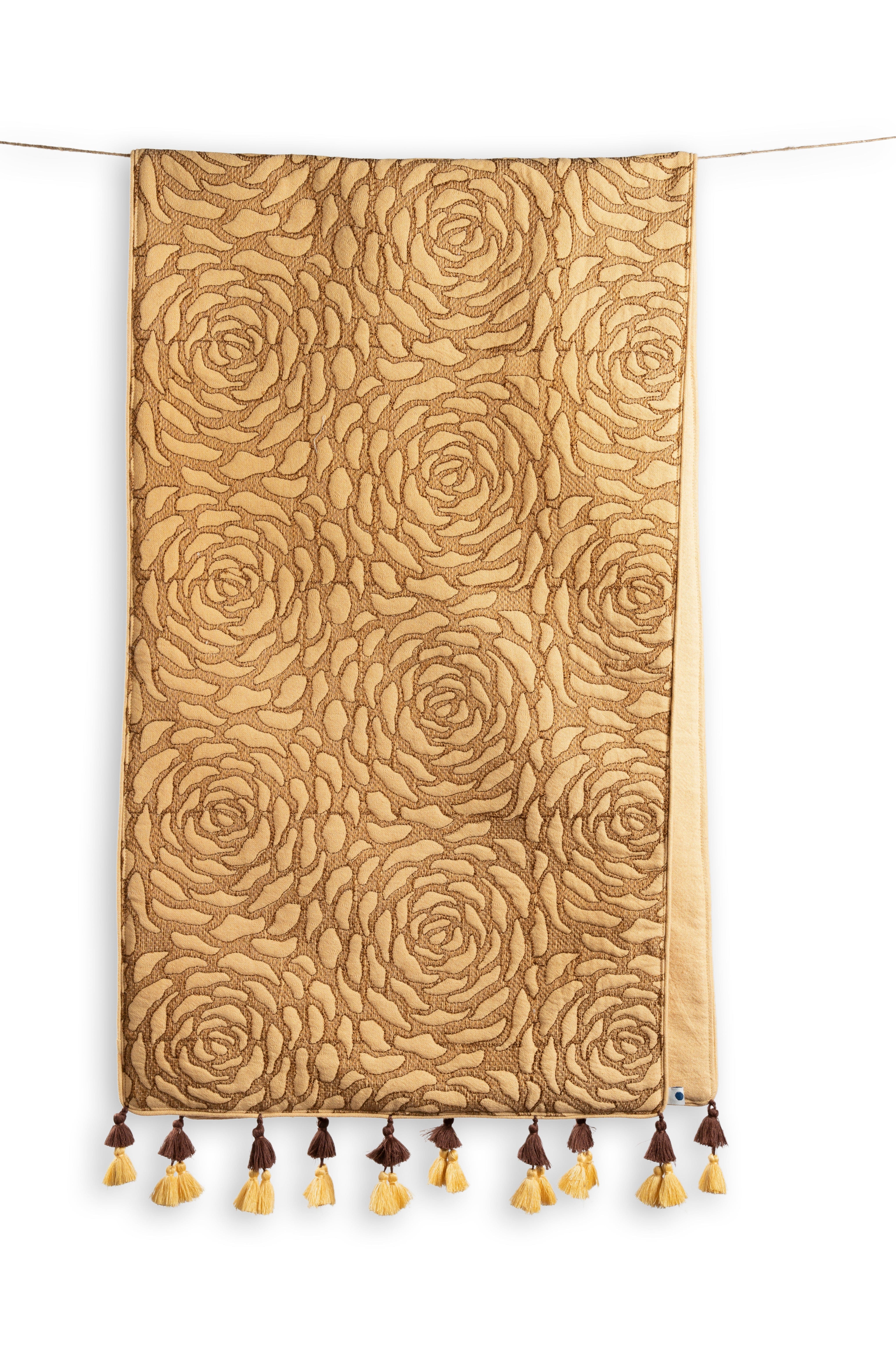 A dense rose landscape blooms over the surface of our Rose Garden Table Runner, bringing a refined and elegant edge to both everyday meals and special occasions. Quilt embroidery on cotton gives this runner a beautiful 3D texture, while a row of pompoms adds an interesting trim on either end.
