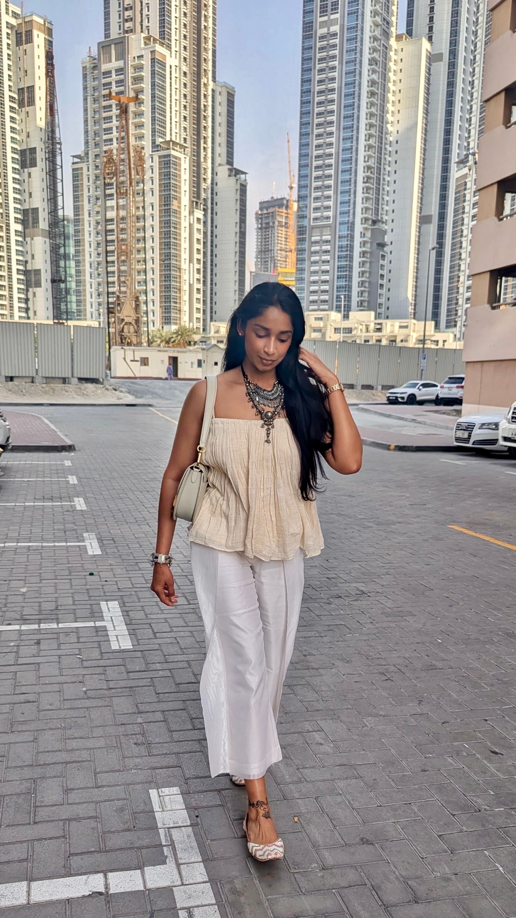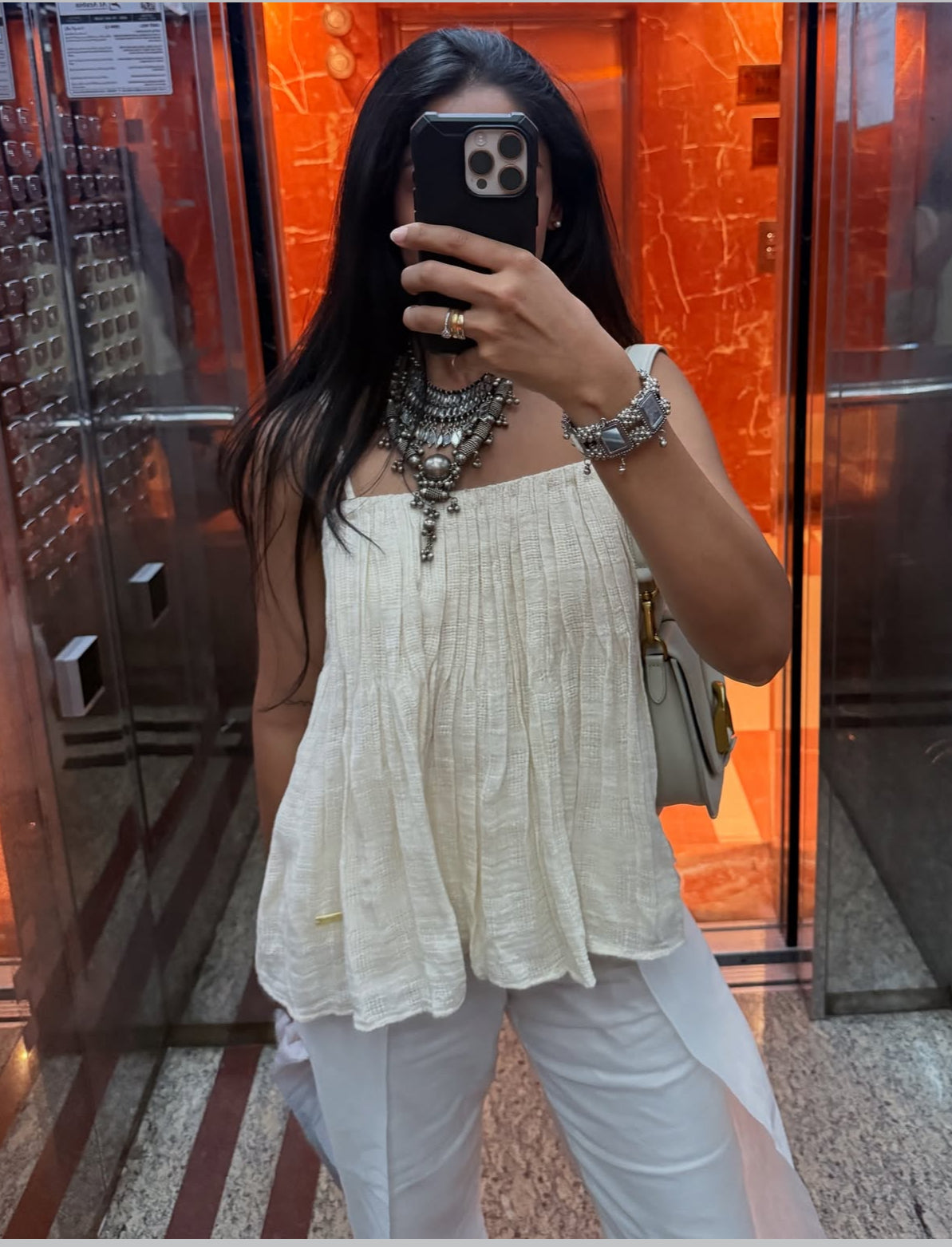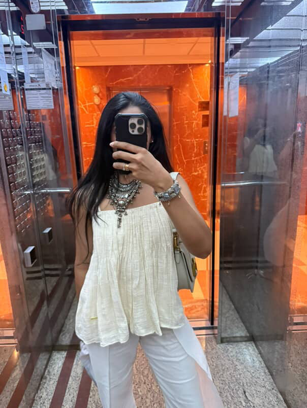 A flowy gathered top with adjustable straps, designed to give you both comfort and versatility. The soft gathers add movement, while the adjustable straps let you customize the fit just the way you like it—perfect for everything from casual days to dressed-up evenings.