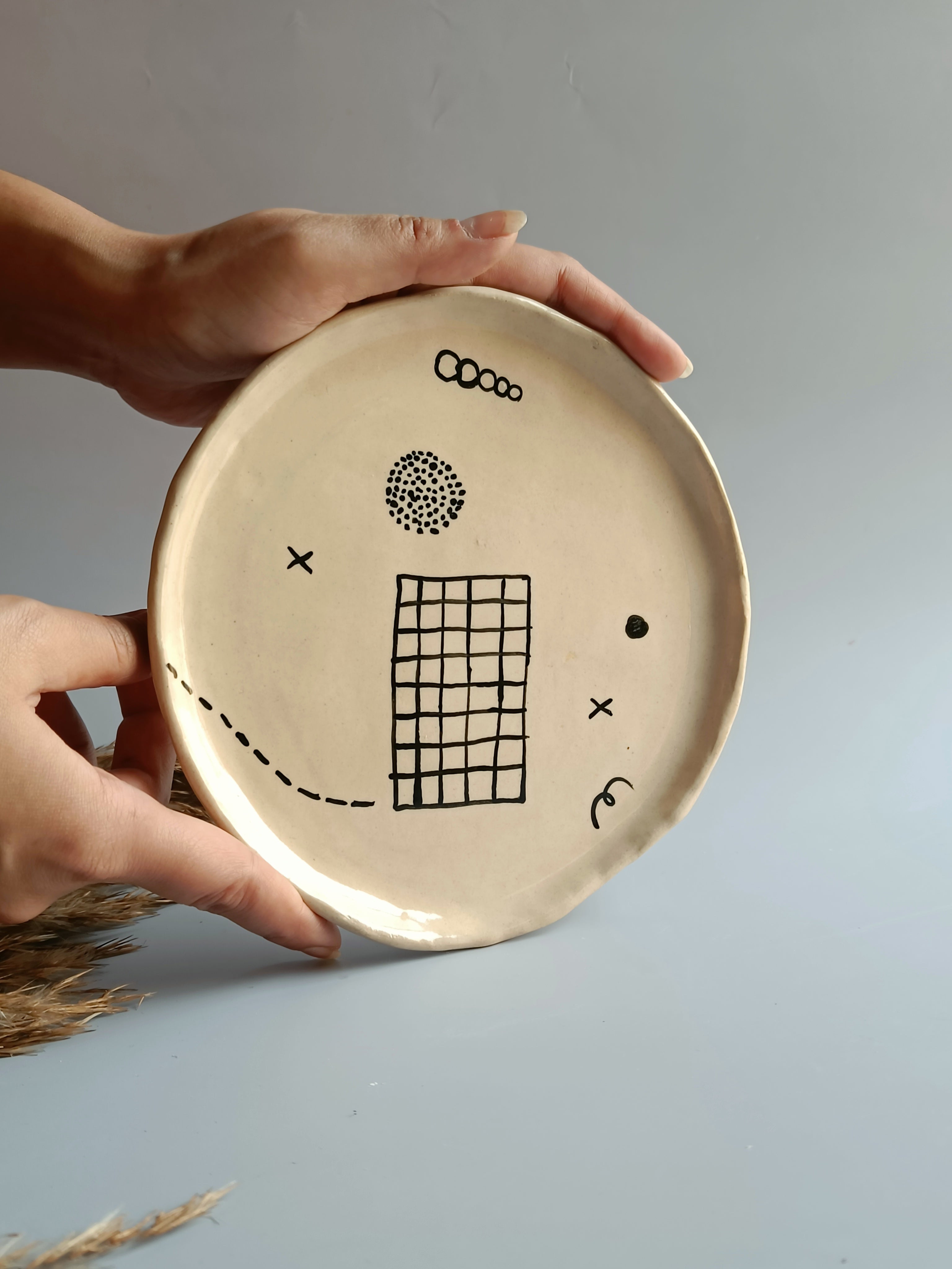 Where bold ink meets raw ceramic, the Ink & Earth Plate is a tribute to modernist design and handcrafted artistry. Its abstract details are hand-drawn with precision, making each plate a one-of-a-kind creation. Perfect for those who love minimal yet striking designs, this plate serves as both, a functional dish and a collector’s item. Its monochrome design makes it a versatile addition to any table setting, bringing a contemporary touch to your snack or dessert moments.