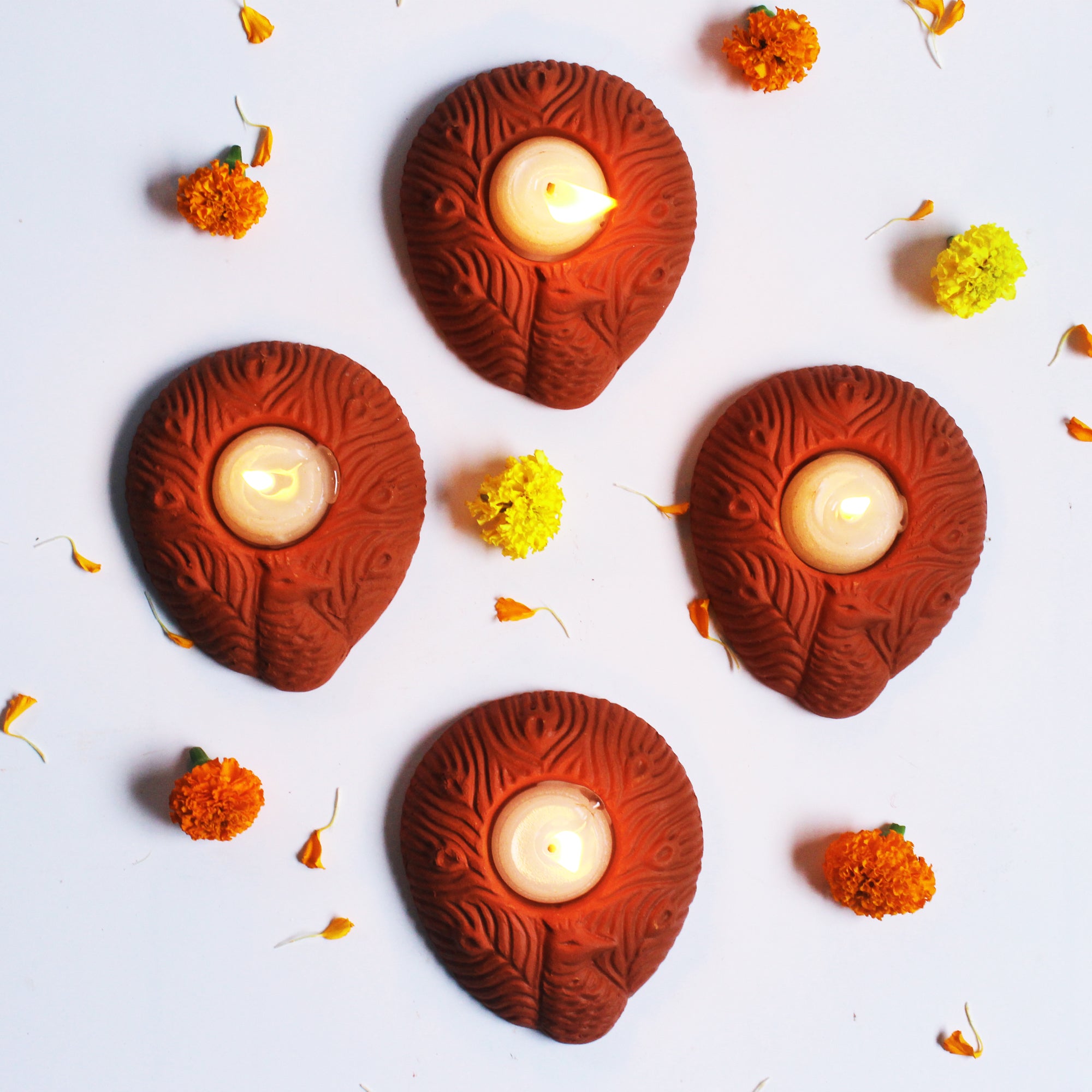 Terracotta Clay "PEACOCK" Candle Pot / Holder : Set of 6 + Complimentary Candles / Tealights 6 pcs