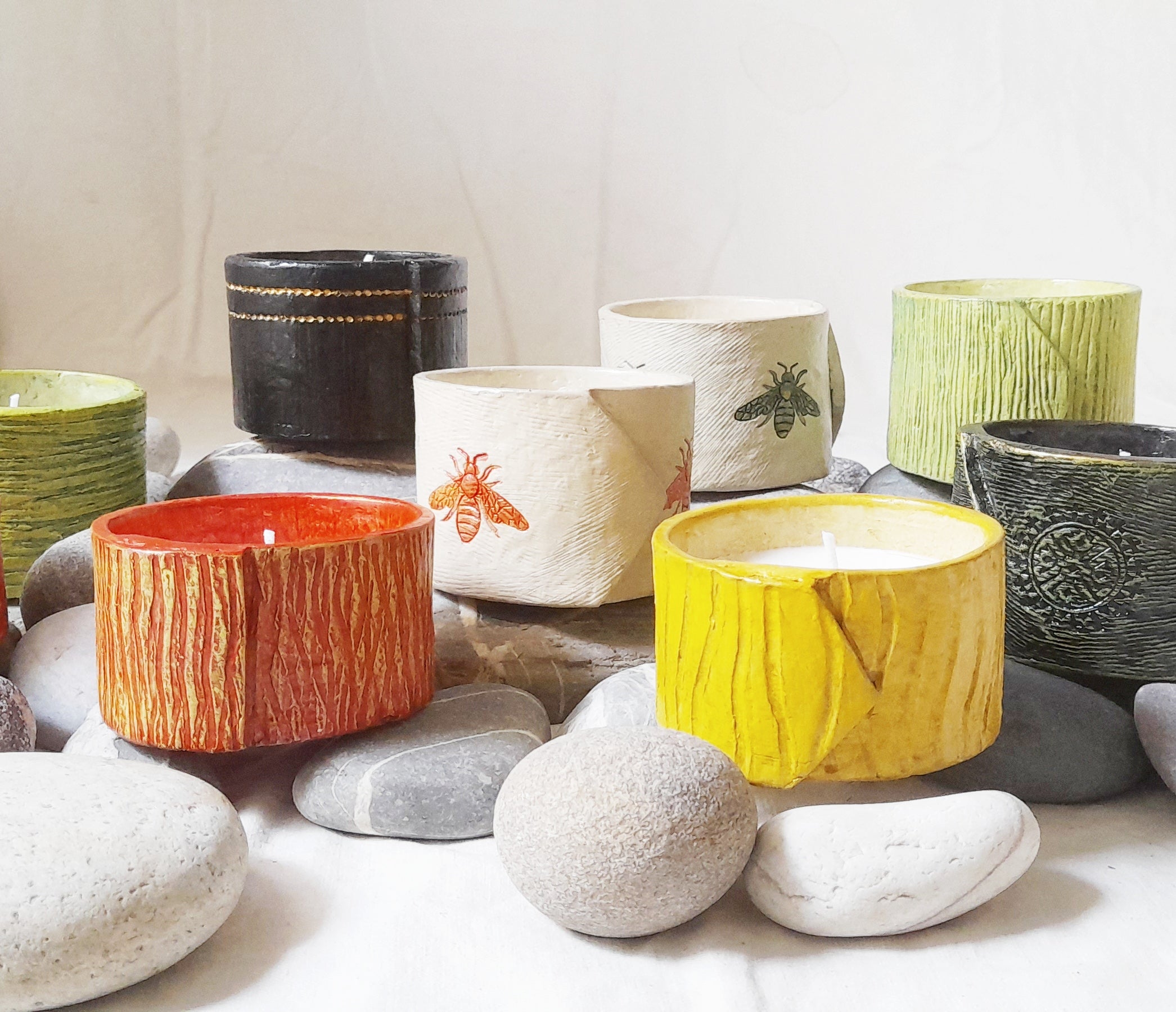 Handcrafted papiermache candle holder, While we were planning to make papiermache candle holders, we have had many doubts. We are using soy wax and natural lemon grass essential oil. We ensure to bring joy through sustainable products. We are a team of artists, creating some interesting arty products (made of papiermache) which are environment friendly. We the founders, Dr. Vivek Prasad & Preeti Gupta, started this setup to design and create environment-friendly designer/arty products in 2005. We started this initiative under the name Aranya Earthcraft, with a great concern towards saving our environment and being sustainable in every way possible; also reviving the age old papier-mache craft which has become limited to very few varieties in today's time, whereas this material has been explored vastly in 18th century. Contemporary Art is the main theme of expression in every product we create, may it be in the form of sculpture, patterns, texture and drawing. We try and infuse them with the utility as well as decor/fashion products. An initiative to conserve the aesthetic of nature in art and exhibit one's creative approach. The designs are inspired by nature & Human forms/moods. Having experience of working in the field of design and art, has helped us learn the various forms and techniques of designs. At the core, our belief is ‘Nature as the source of inspiration for our creativity. We started creating with the age-old material papier-mache, the process to make this dough, we follow Rajasthani technique, using khadiya mitti (white clay), paper pulp and natural resin of babool tree (acacia nilotica). This very flexible material is easy to use, consumes zero electricity, bio degradable and zero waste.