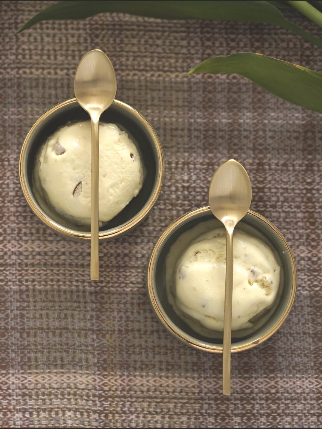 Enhance your desert crockery by opting for this beautiful Dogri dessert bowl and spoon set by Courtyard. It contains a set of two bowls and two spoons. The set is hand-crafted with precision using dual tone hand-cast ceramic, pure gold plating and cast-brass and stainless steel and imparts a smooth finished look that is sure to catch your fancy.