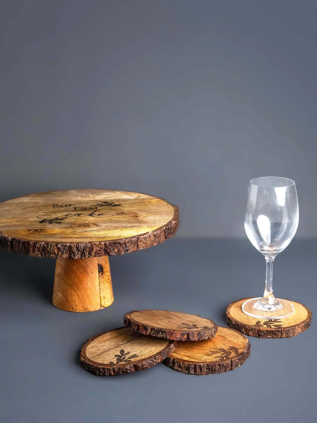 - This cake stand would be a go-to for all your celebrations, made in mango wood with bark edges, and engraved in a fun mood-setting text.