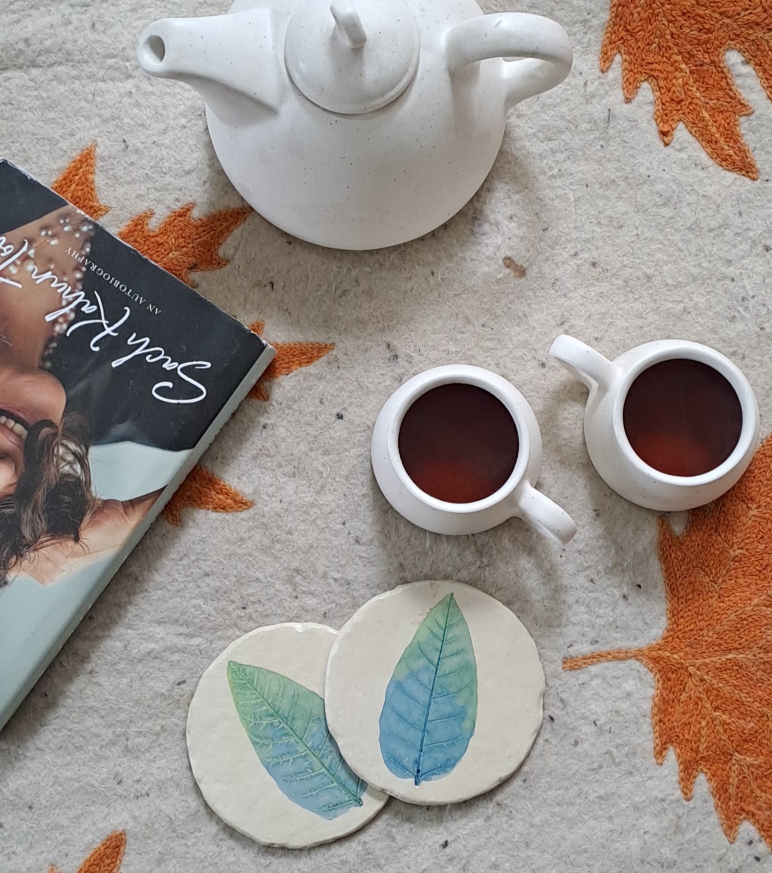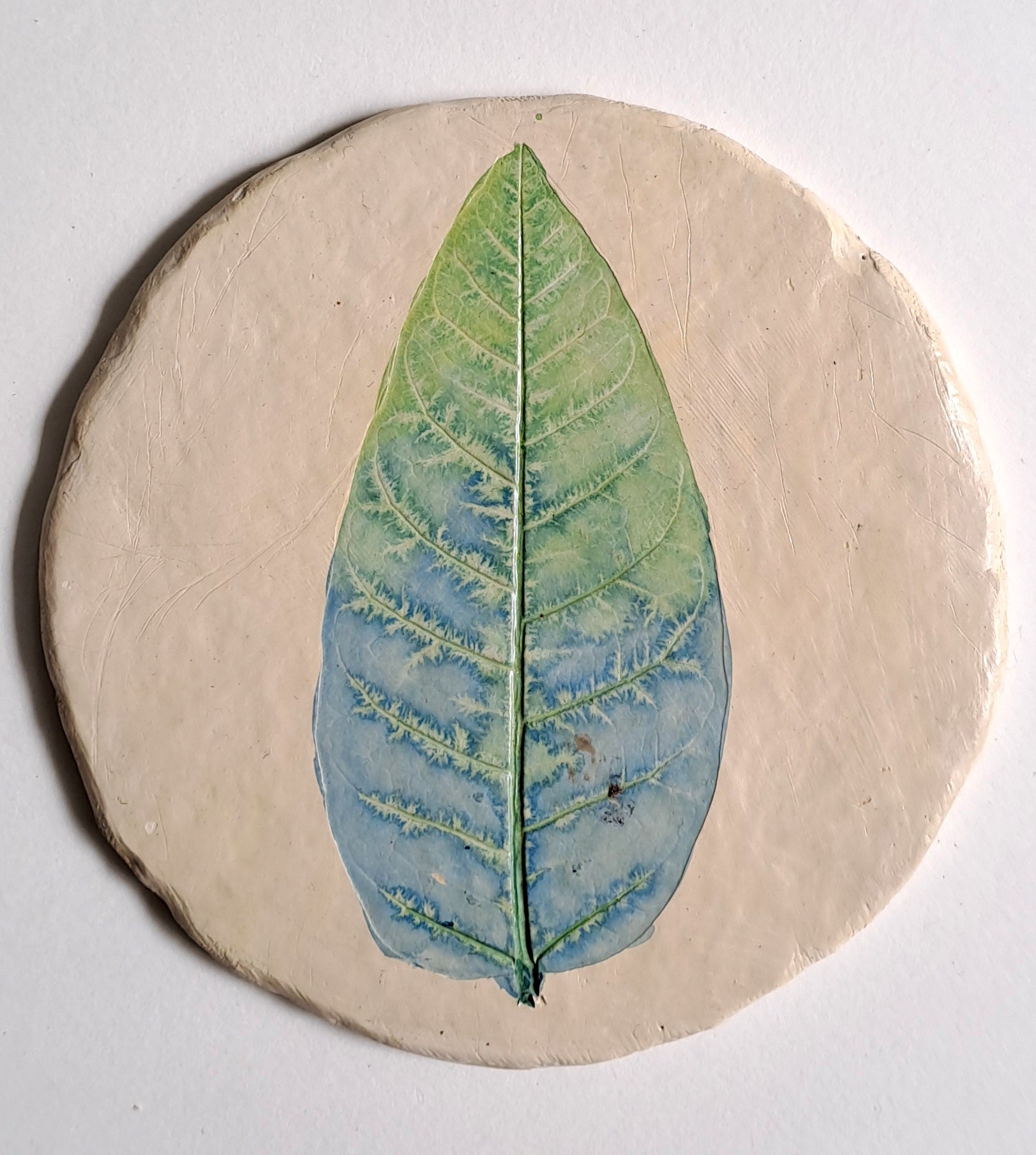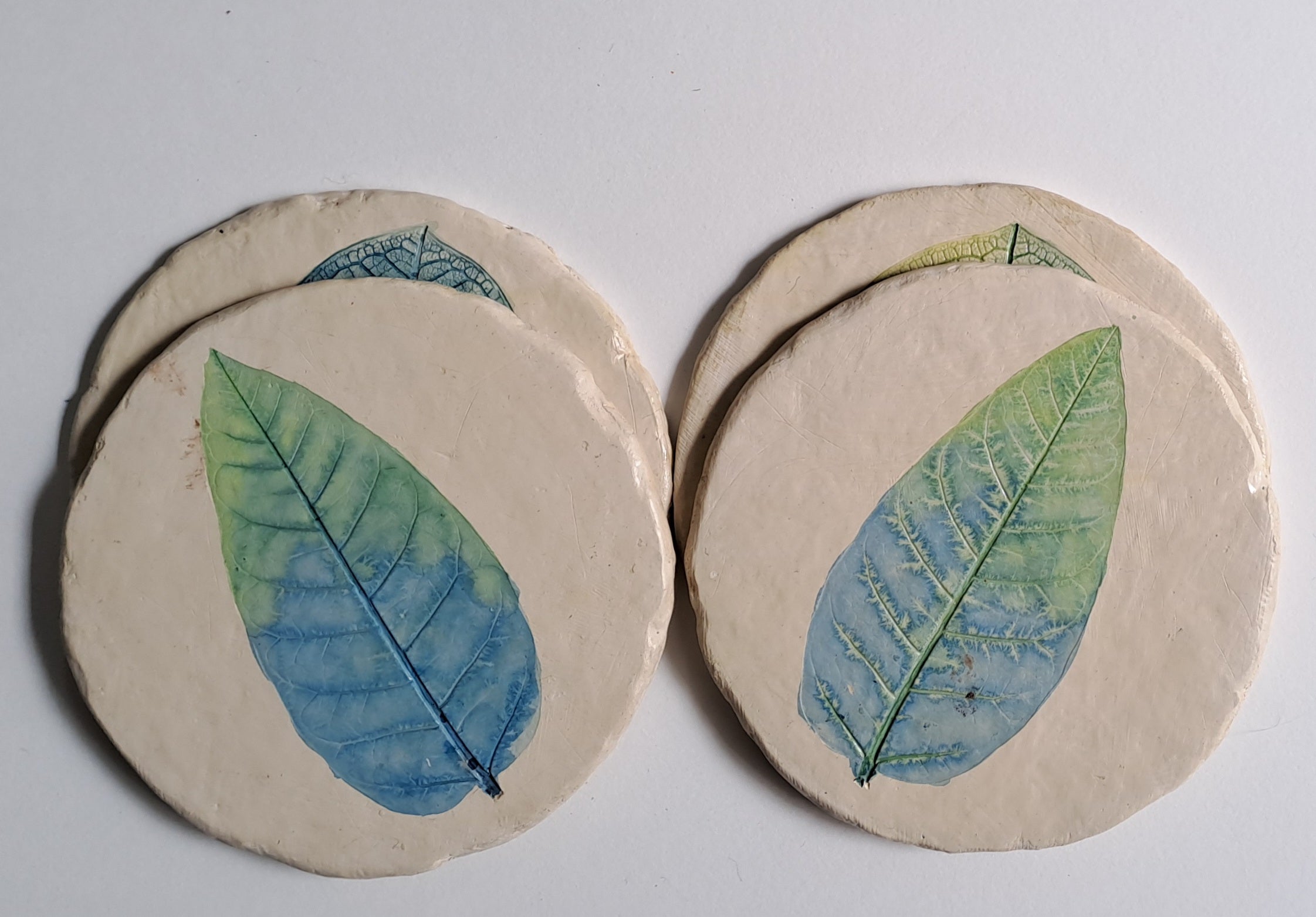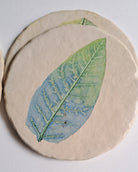 PILKHAN LEAF IMPRINTED, HANDPAINTED COASTERS. Each piece is handcrafted, and then hand painted. Each piece is coated with lacquer to prevent from water and has a cork sticker base to avoid scratch on table.