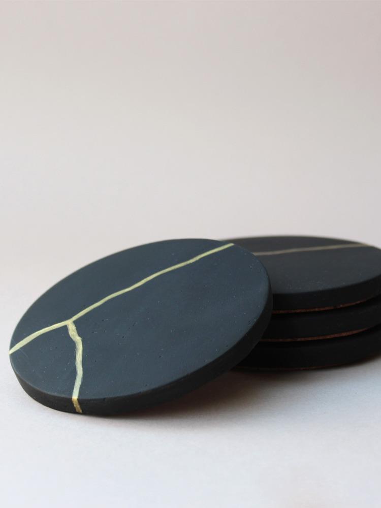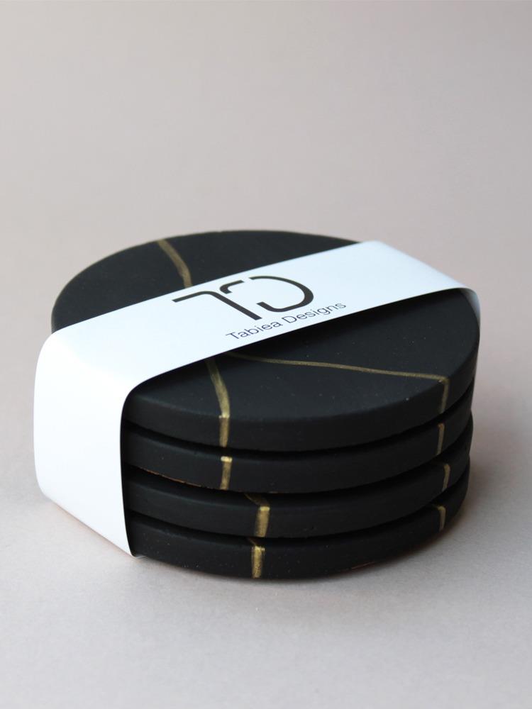 Tabiea Designs Circular Cement Coasters, Black and Gold, Set of 4