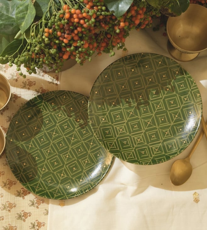 Introducing the Courtyard Green Sindhari Quater Snack Plate (Set of 2)! Perfect for a home-style snack, this ceramic set features traditional intricate details with vibrant, eye-catching colors. Great for hosting or everyday use, each plate is decorated with raised floral detailing and delicate hand-painted floral designs. Disclaimer: All other items in the image are only for display purposes and will not be a part of the delivery content. Product colour may slightly vary due to photographic lighting sources. Country of Origin - India.