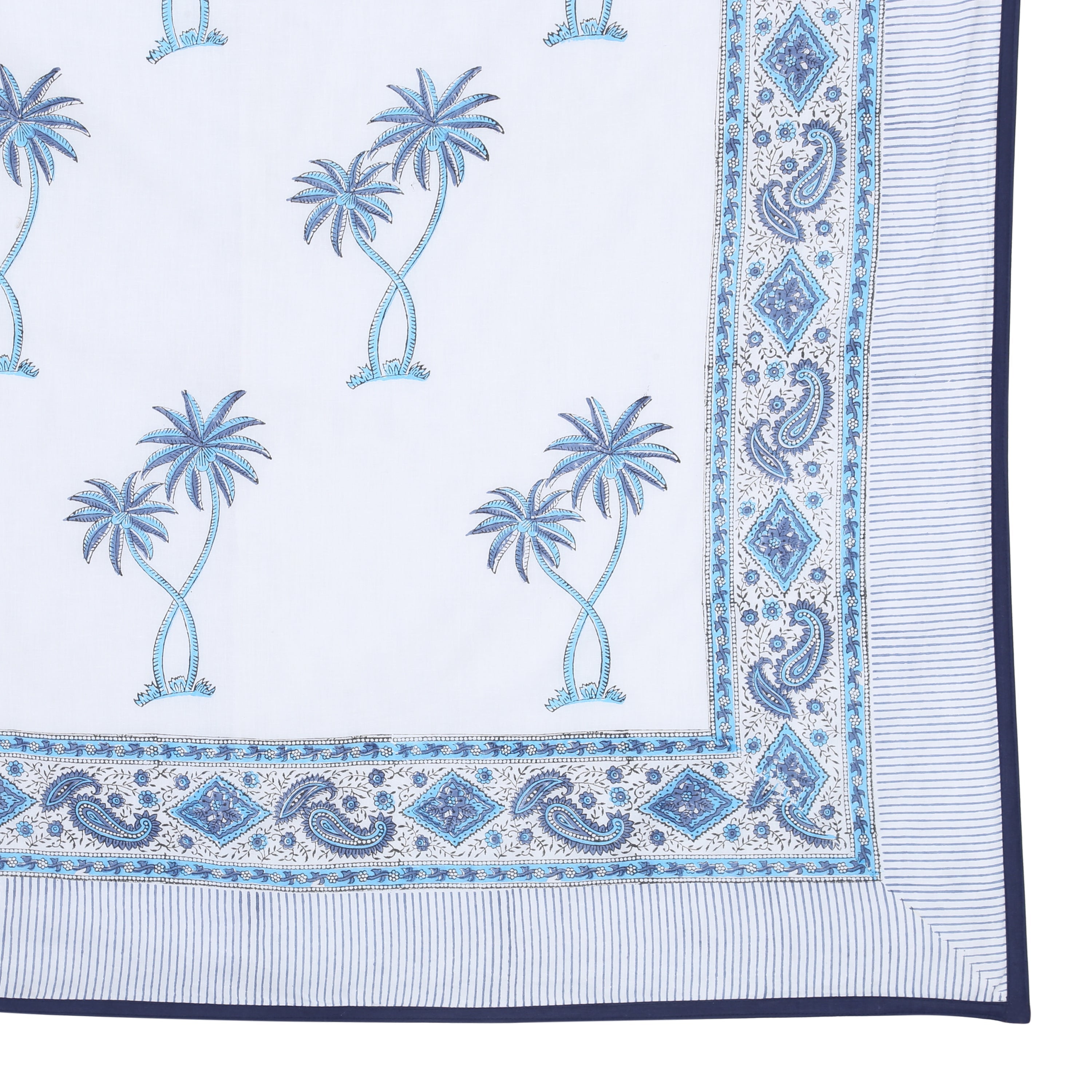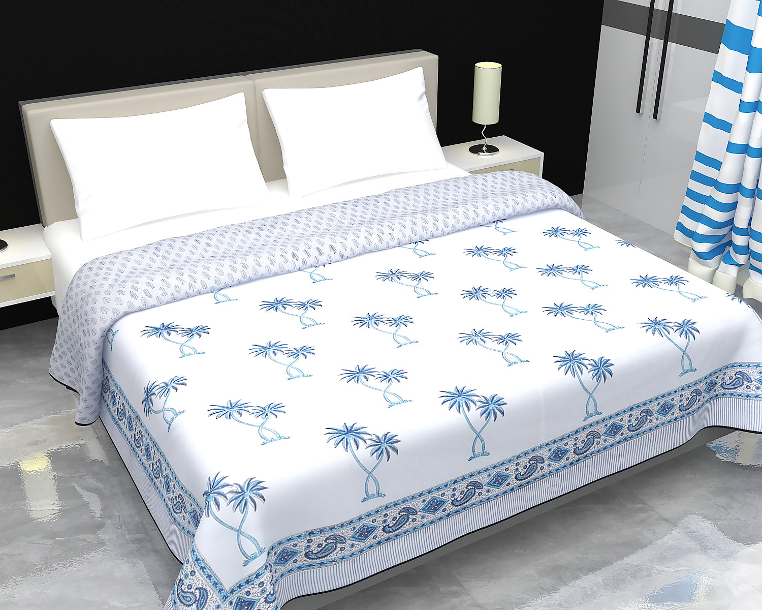 Block Printed Cotton Blanket - Double Dohar ( 90 x 108 Inches) - Blue Coconut Tree