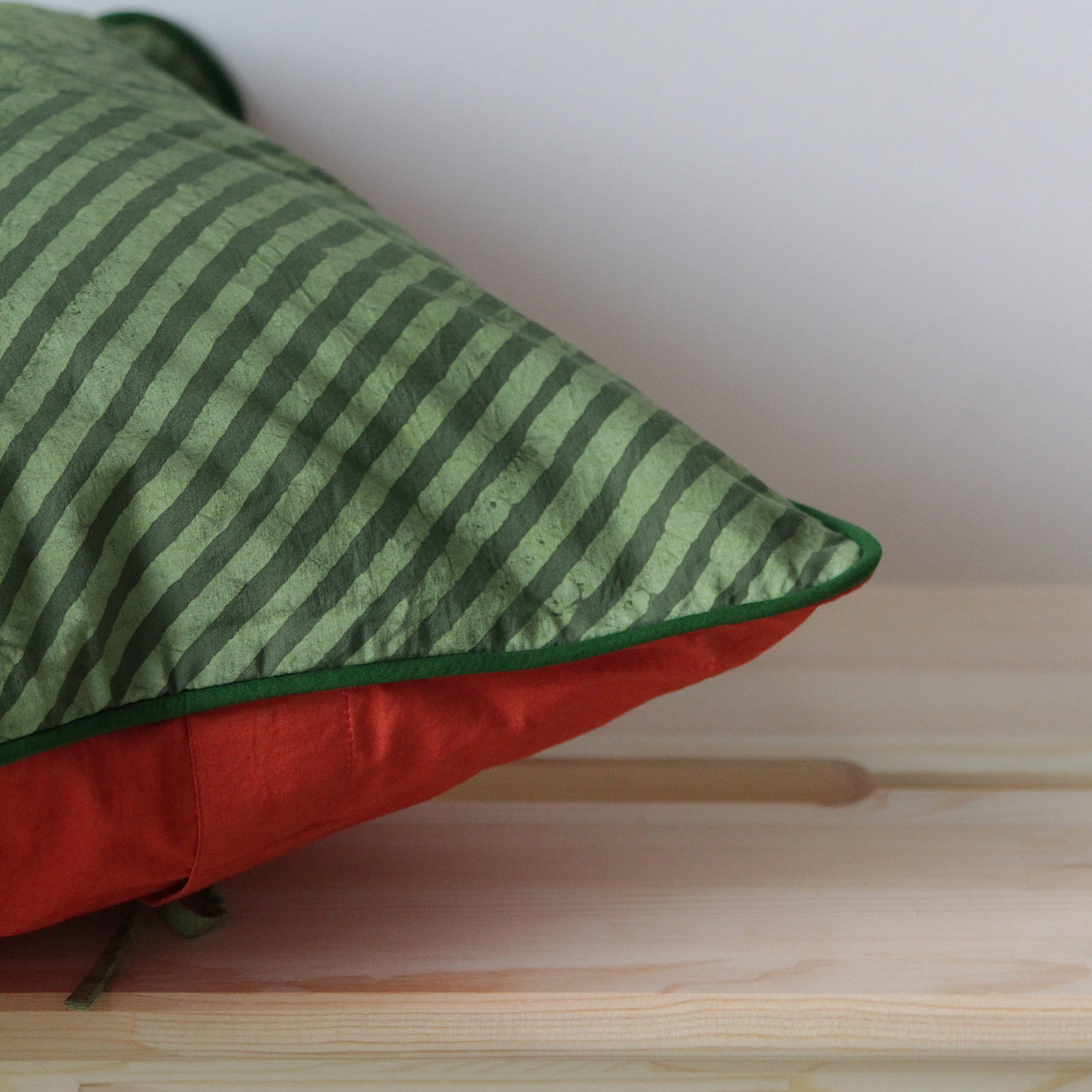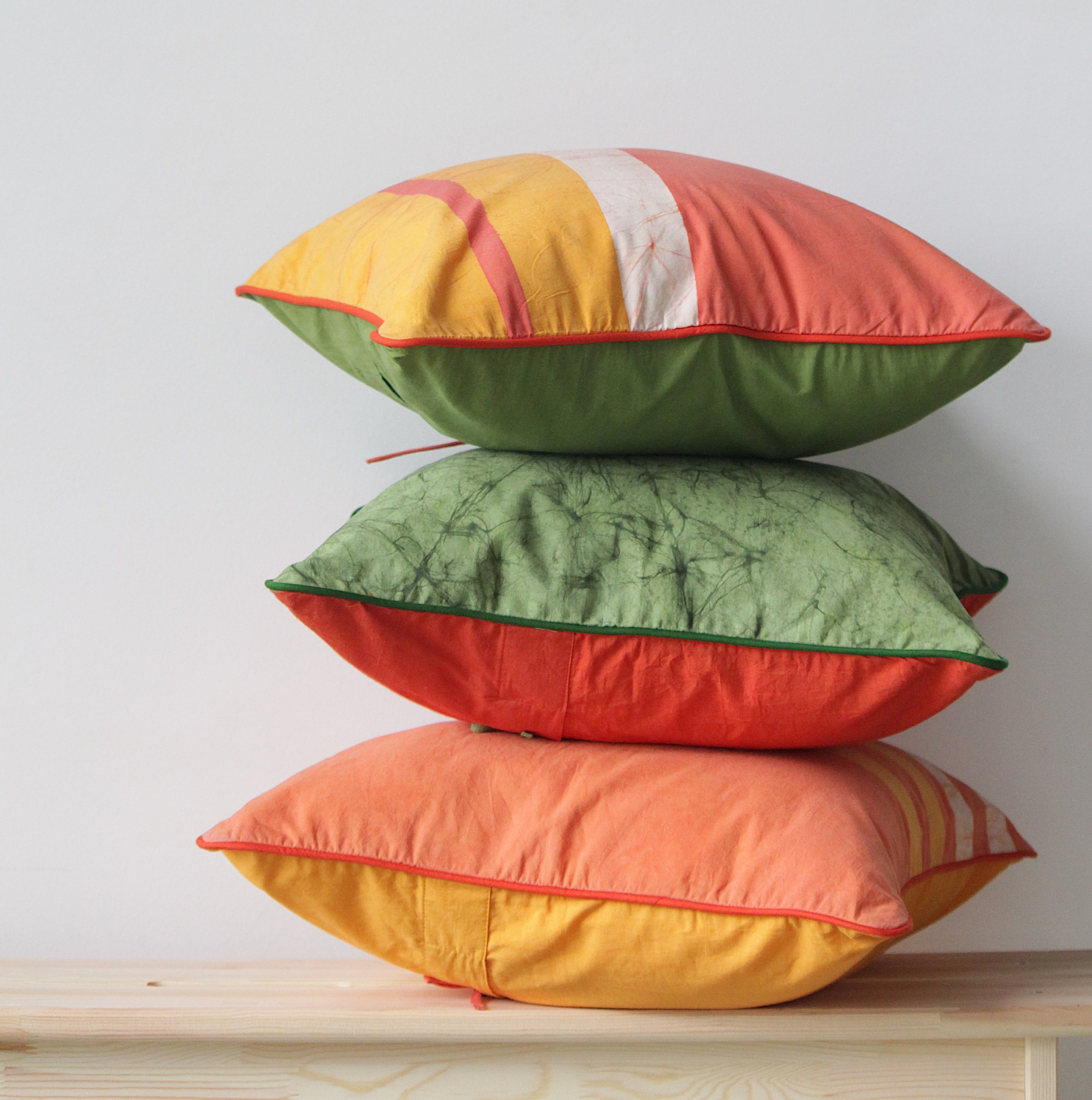 Quaint dwellings lined with beautiful trees big and small, Reminiscent of pot-pourri of fragrant mists, dew and all What more could mother earth ever offer? To walk on pathways graced by flower! Flora is a collection of décor cushions for your blissful spaces, inspired by the earthy palette of flowering trees of India. Hand printed and painted in Batik.