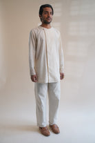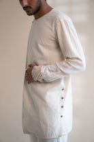 This Dawning Angrakha Long Shirt comes in a calm and soothing colour that we call Kora. Crafted in 100% cotton fibres and natural materials. This 60s cotton shirt is undyed and unbleached. This shirt features Kantha detailing, a form of Indian hand embroidery, running along the cuffs forming an elaborate pattern. The Angrakha-style inspired silhouette comes with a loop button to secure the extended placket.