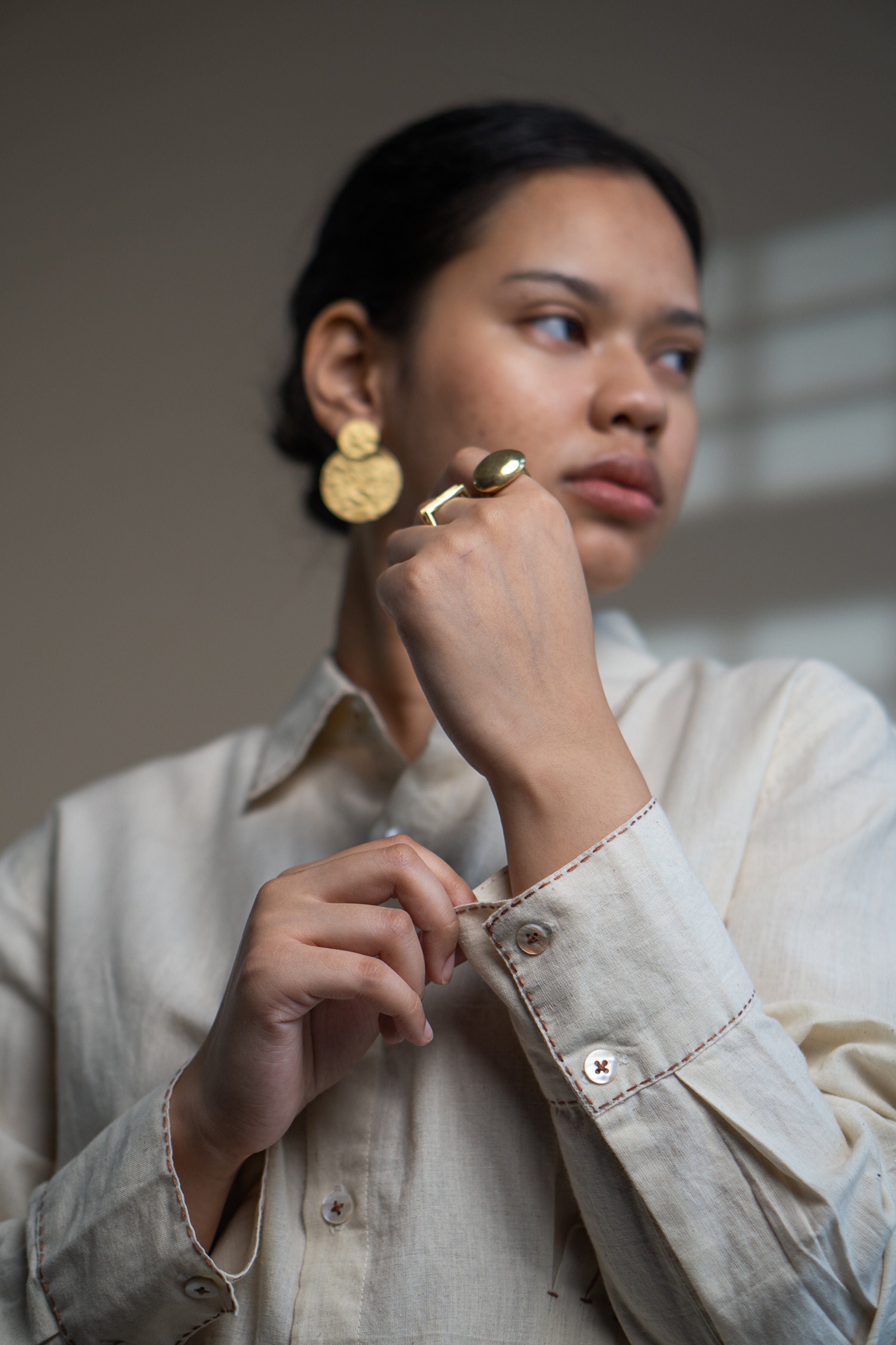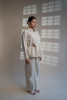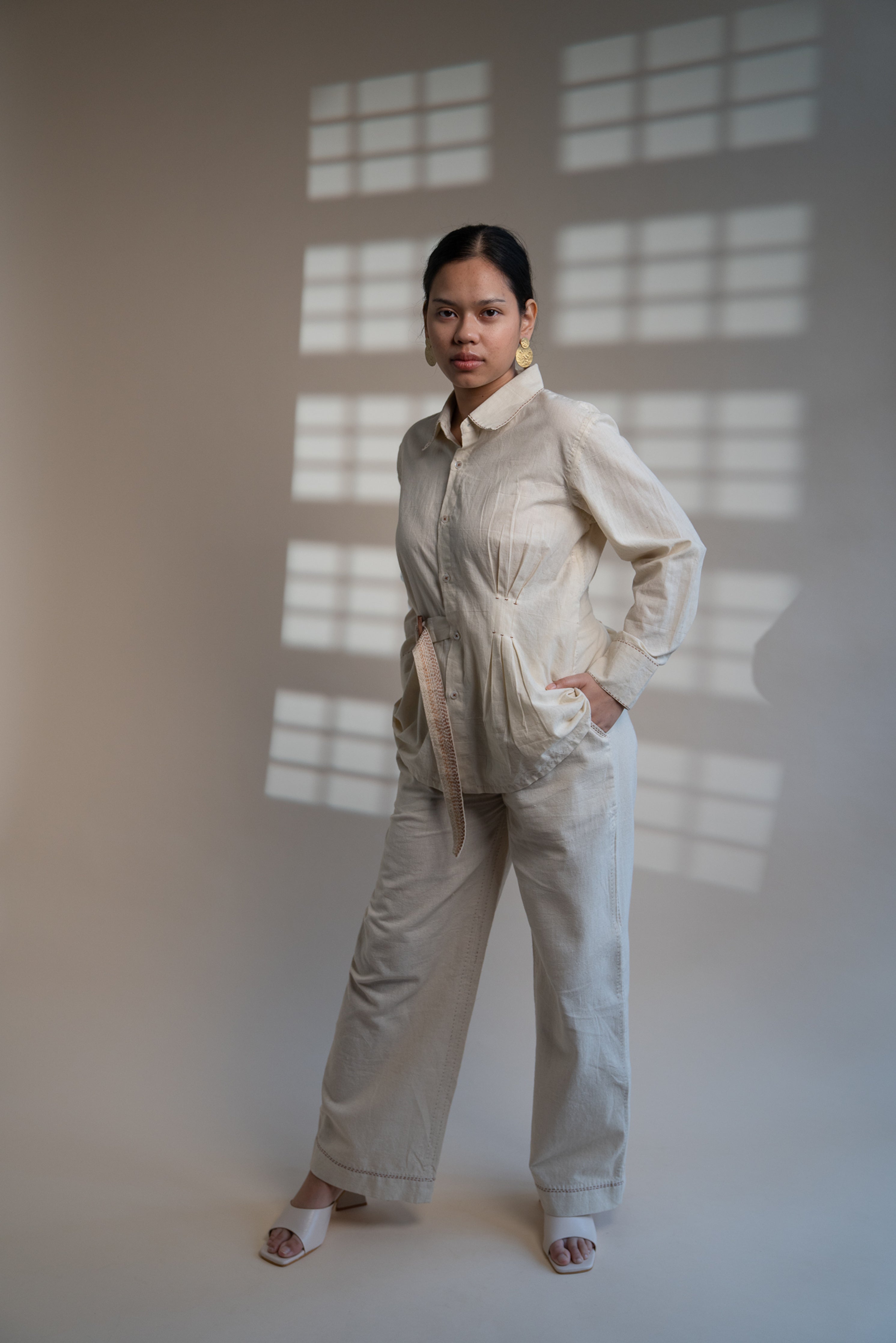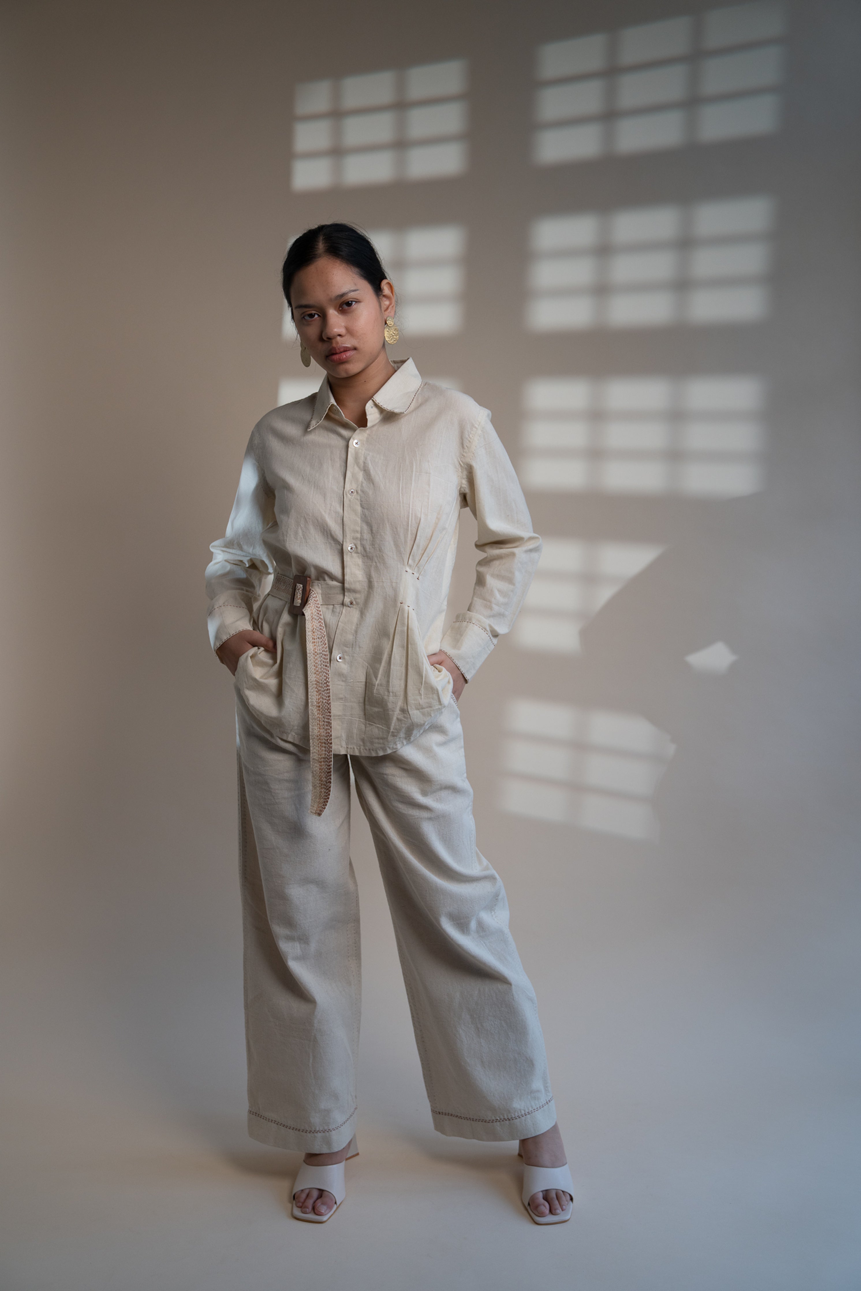 This Dawning Belt Shirt comes in a calm and soothing colour that we call Kora. Crafted in 100% cotton fibres and natural materials. This 60s cotton shirt is undyed and unbleached. This shirt comes with a pleating detail on one side and is adorned with the stitches of Kantha, a form of Indian hand embroidery along the cuffs to create an ombre effect. Practical touches include a side-pocket. It has a side-belt as an element of multi-functionality involving the wearer in the process of choice and interchangeability. The belt can be manipulated in order to achieve a straight fit silhouette or can also be cinched at the waist for a cinched look.