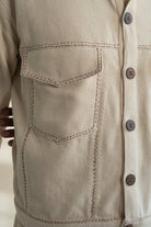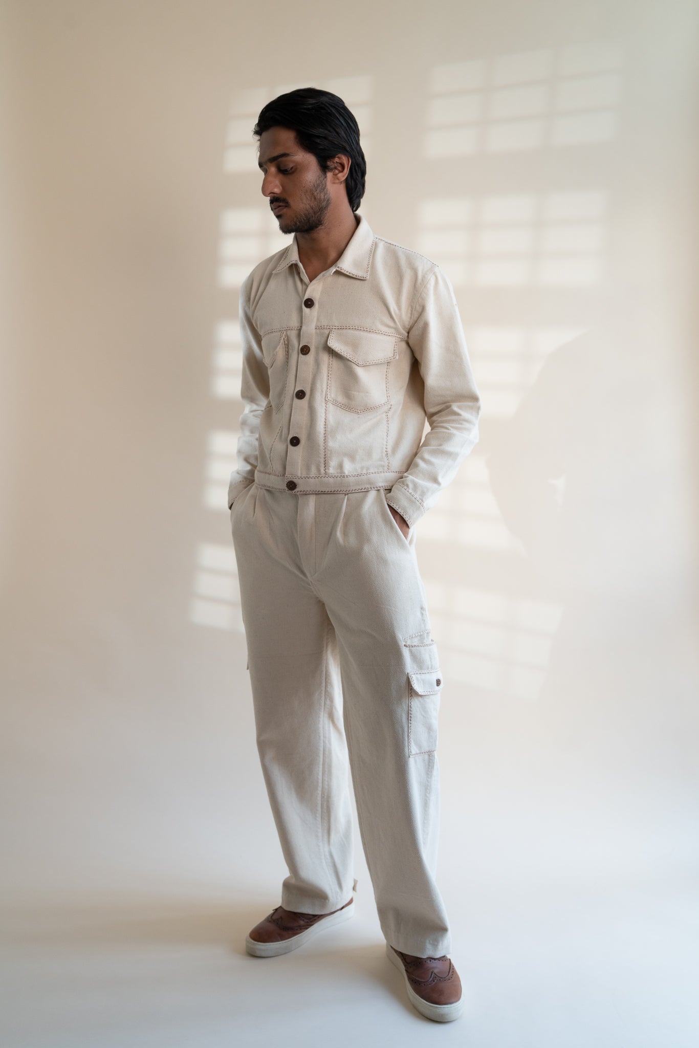 This Dawning Denim Jacket comes in a calm and soothing colour that we call Kora. A classic denim jacket to elevate any outfit. Crafted in 100% cotton fibres and natural materials. This Khadi Denim jacket is undyed and unbleached. It has a shirt collar and flap pockets. The jacket comes with panelling and statement buttons. The seams of the panels and pockets are adorned with the stitches of Kantha, a form of Indian hand embroidery.