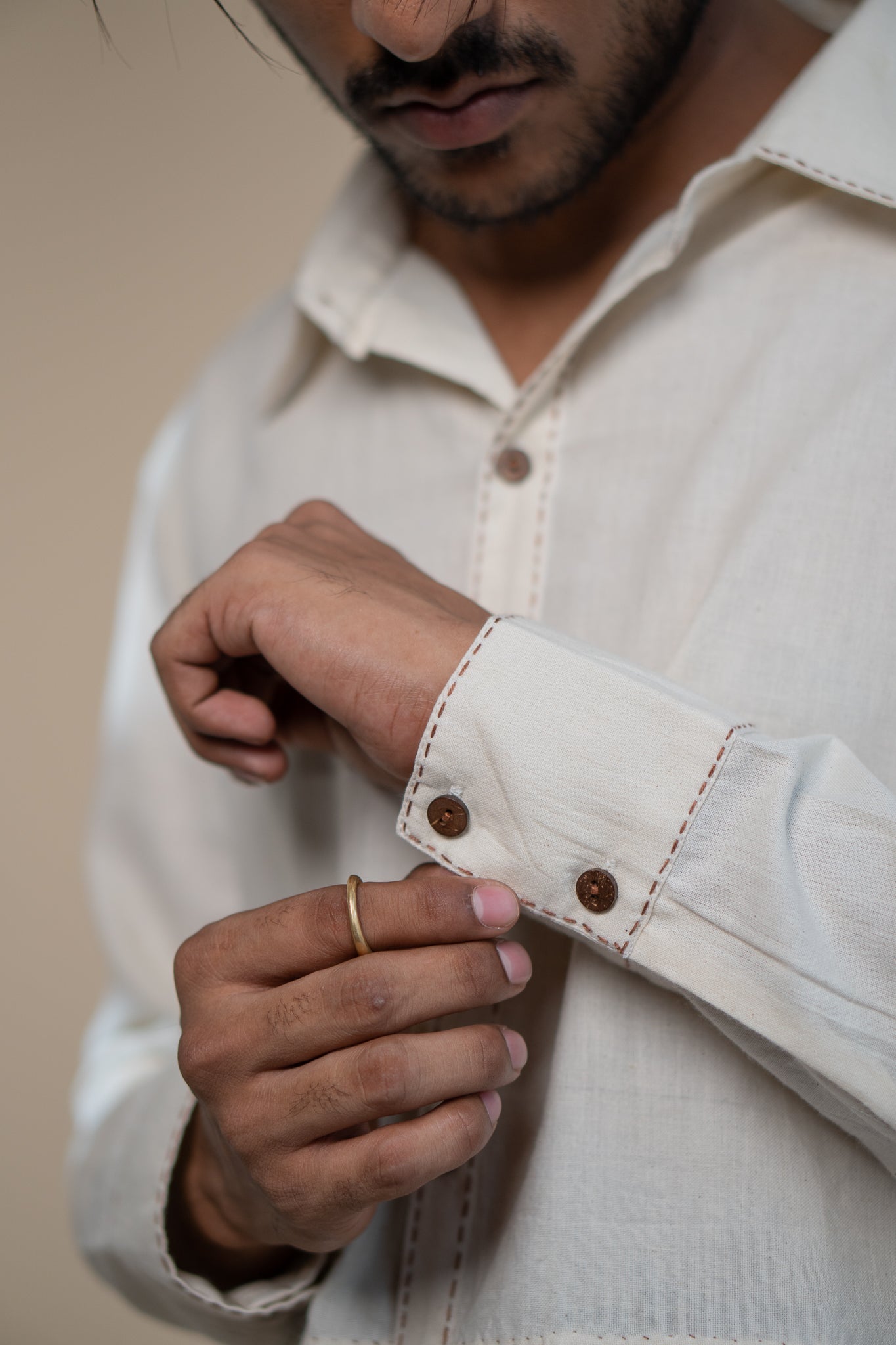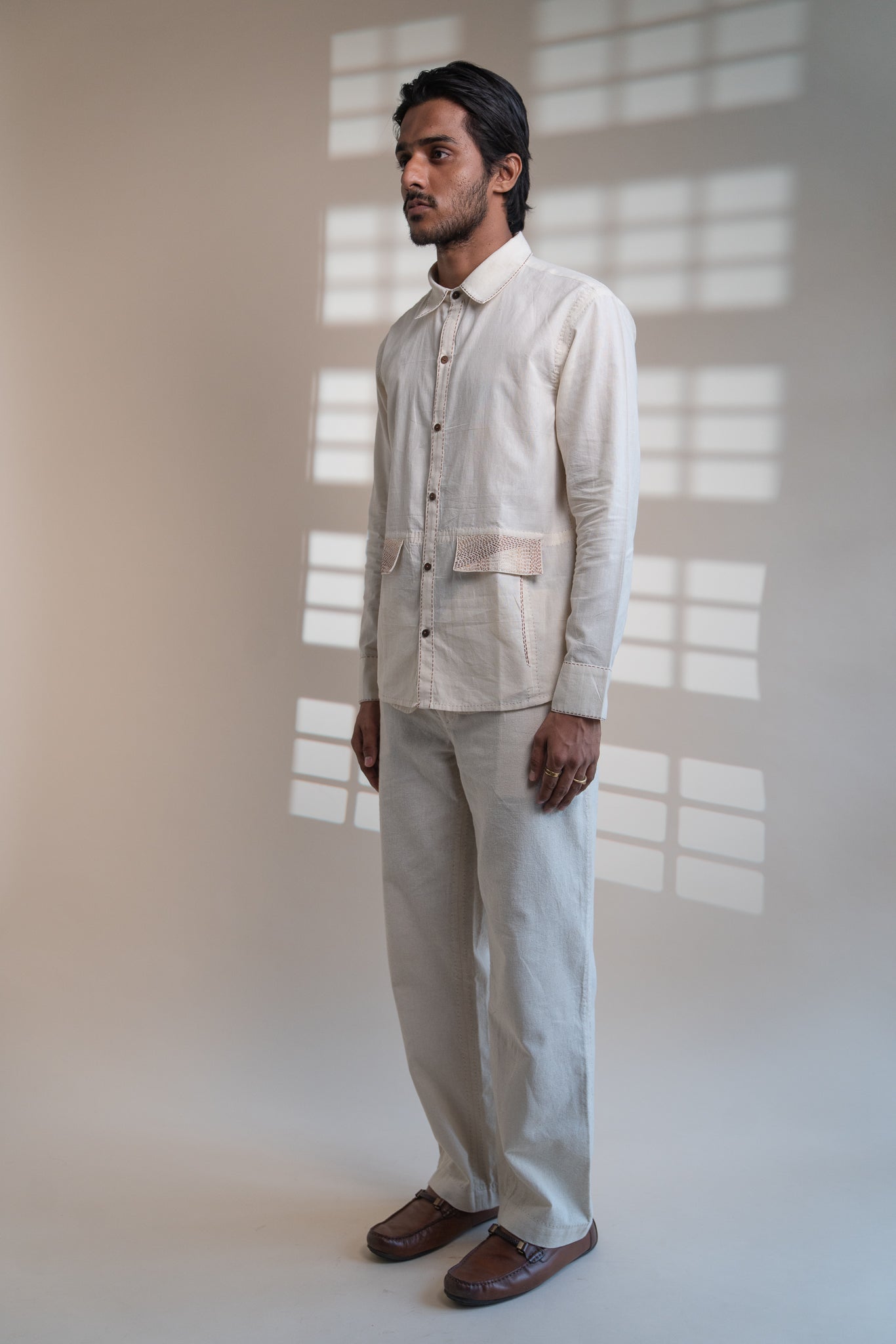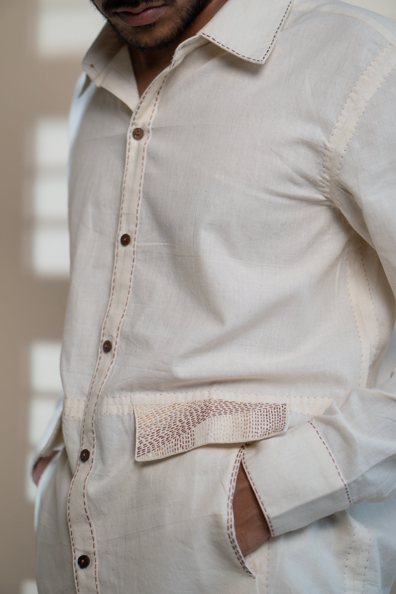 This Dawning Flap Detailed Shirt comes in a calm and soothing colour that we call Kora. A contemporary take on the classic long sleeve shirt. Crafted in 100% cotton fibres and natural materials. This 60s cotton button-down shirt is undyed and unbleached. Details include intricate Kantha stitches, a form of Indian hand embroidery on the faux flaps and pockets.