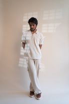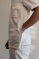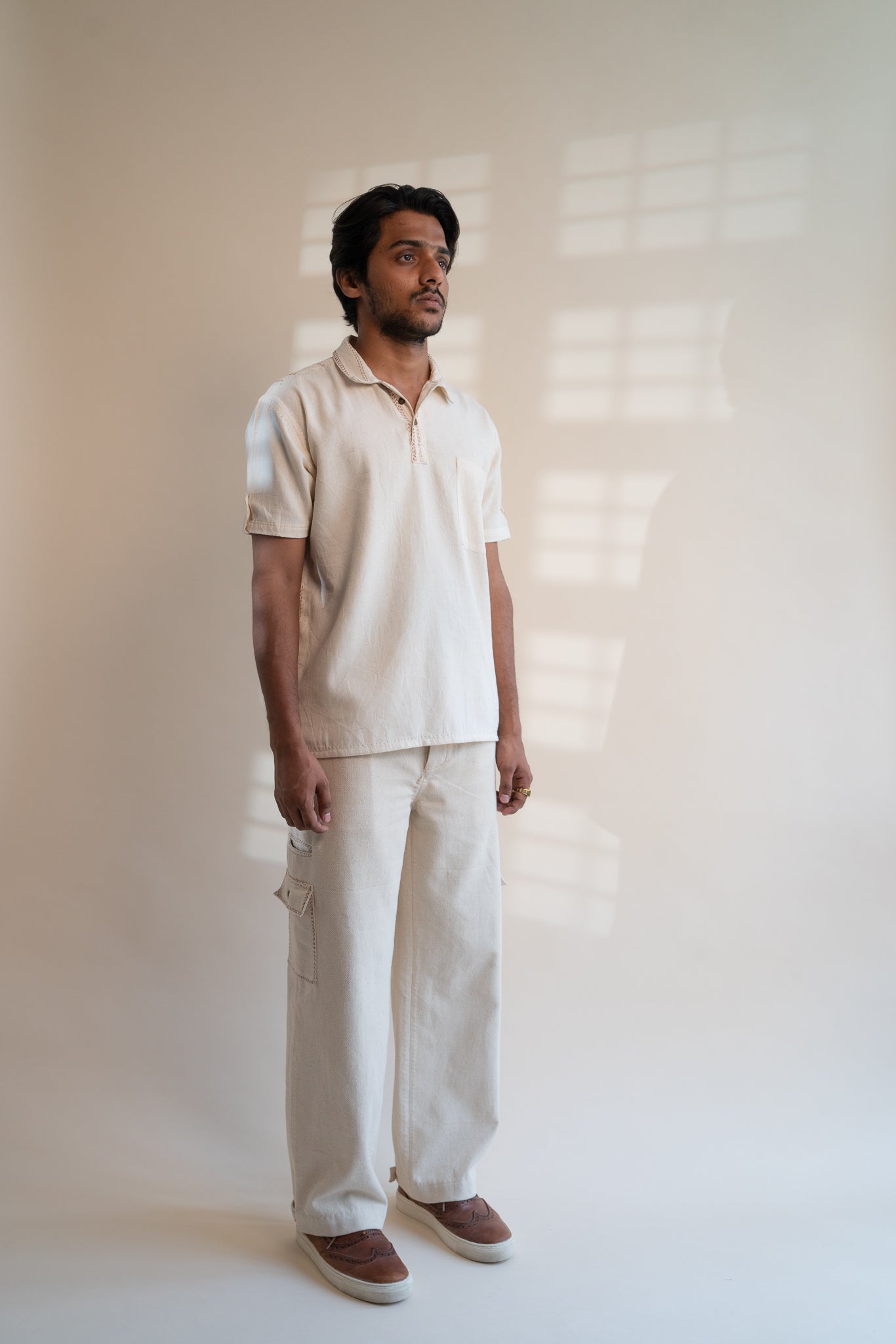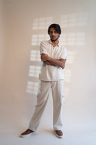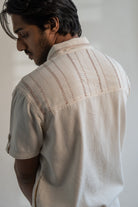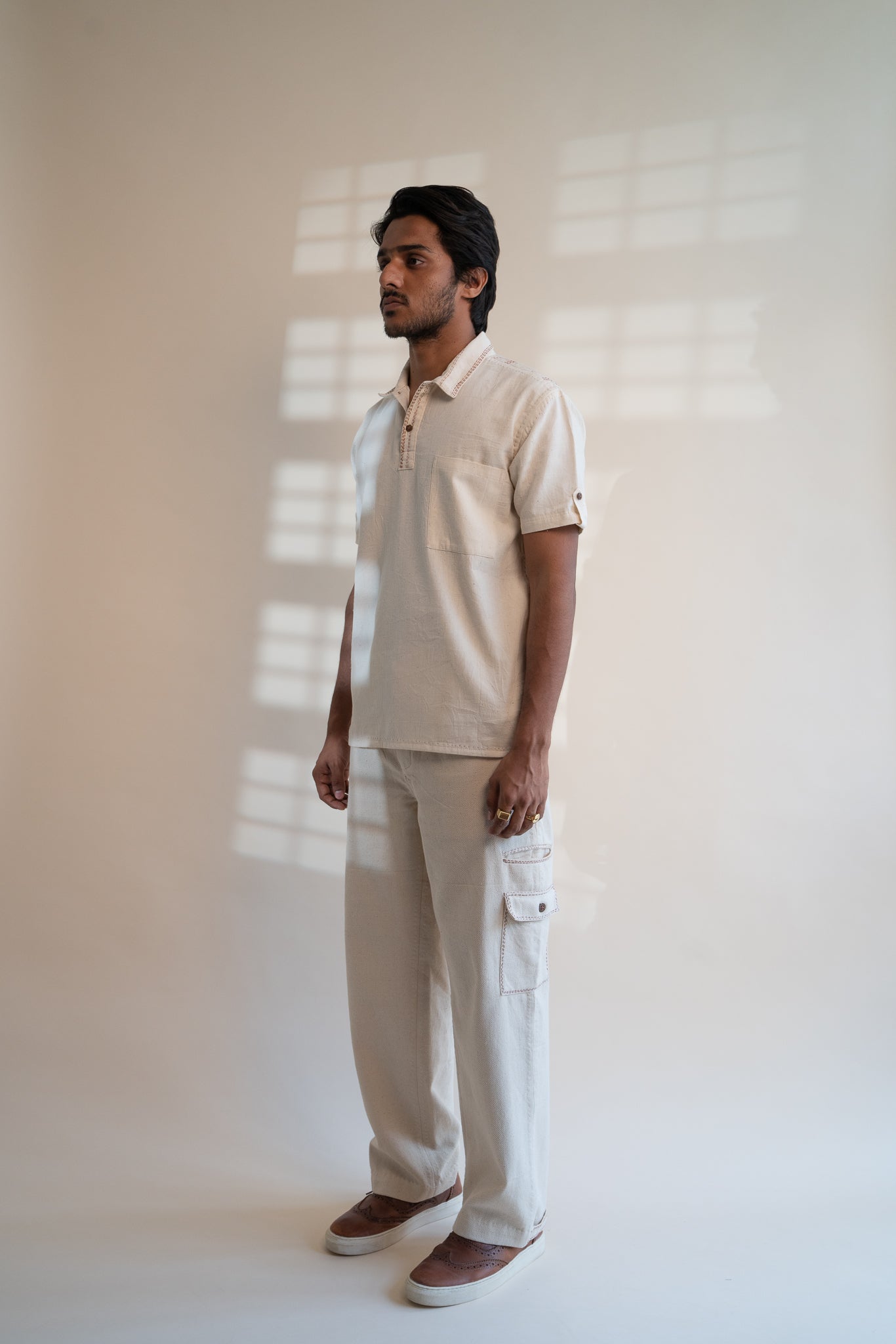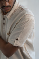 This Dawning Half Sleeve Shirt comes in a calm and soothing colour that we call Kora. Crafted in 100% cotton fibres and natural materials. This Kala Cotton shirt is undyed and unbleached. Replete with a spread collar, this half-sleeve shirt comes with side pockets. Stitches of Kantha, a form of Indian hand embroidery, embellish the back yoke collar and front placket. It has a foldable sleeve hem as an element of multi-functionality involving the wearer in the process of choice and interchangeability.