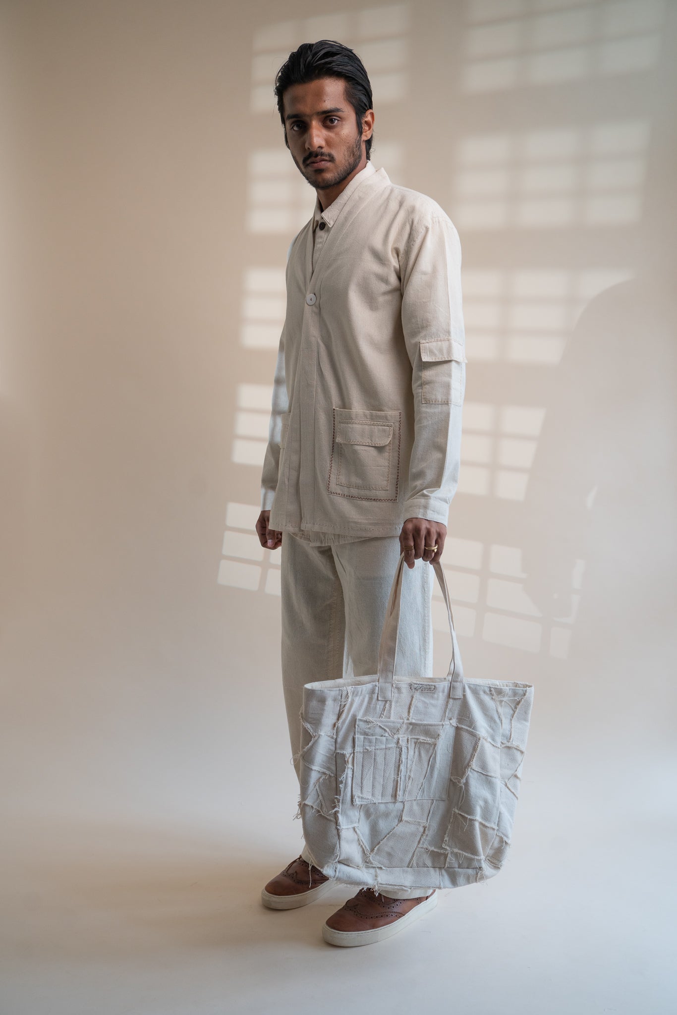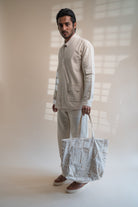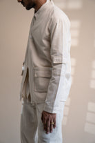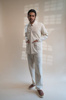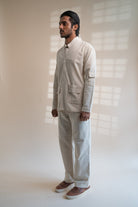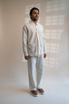 This Dawning Haori Jacket comes in a calm and soothing colour that we call Kora. Crafted in 100% cotton fibres and natural materials. This 30s cotton Jacket is undyed and unbleached. This clean silhouette has a one-button closure and full-length sleeves with stitches of Katha, a form of Indian hand embroidery embellished on the pockets. Practical touches include patch pockets making it a utilitarian piece in your wardrobe.