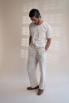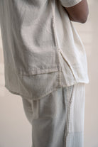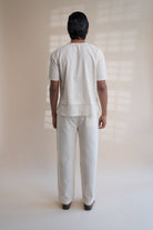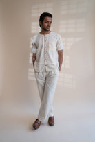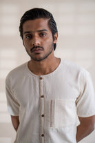 This Dawning Layered Shirt comes in a calm and soothing colour that we call Kora. Crafted in 100% cotton fibres and natural materials. This layered shirt with an interesting play of panelling of two fabrics, Kala cotton and self-checked is undyed and unbleached. Replete with a classic round neck, this half-sleeve shirt comes with two functional pockets. Stitches of Kantha, a form of Indian hand embroidery, line the placket, neckline and pockets.