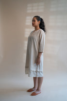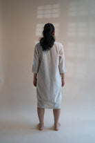 This Dawning Long Shirt comes in a calm and soothing colour that we call Kora. A relaxed fit for more room and freedom of movement. Intricate round neck with button yoke. Practical touches include side pockets. A classic long shirt with a fresh take. With a simple manipulation of adding a self-checked layer of fabric, this long shirt can transform.