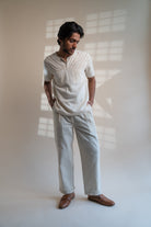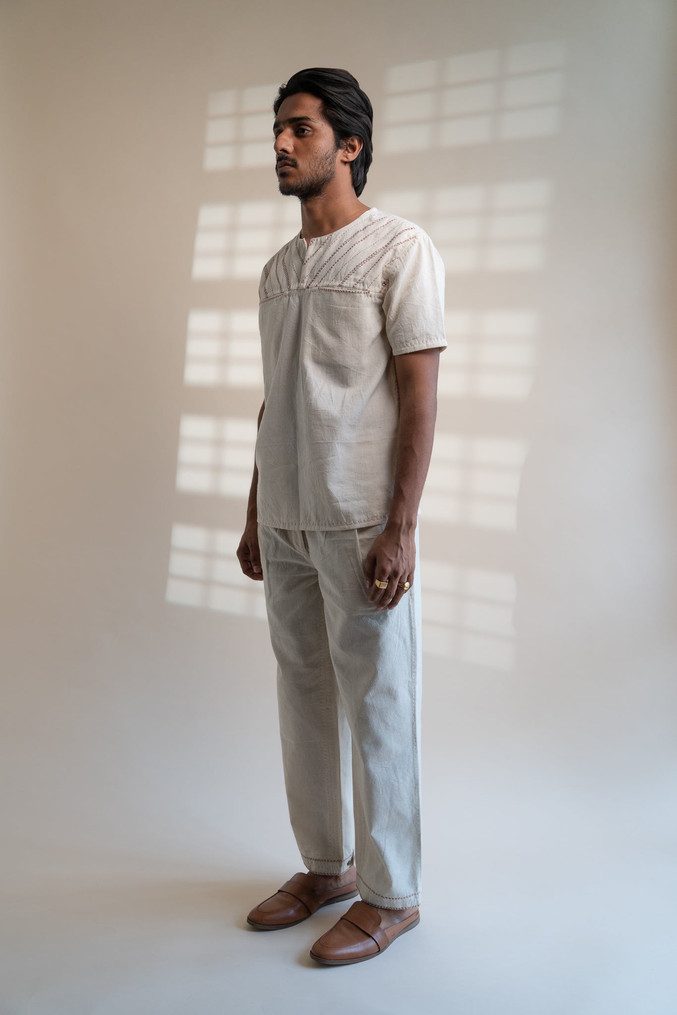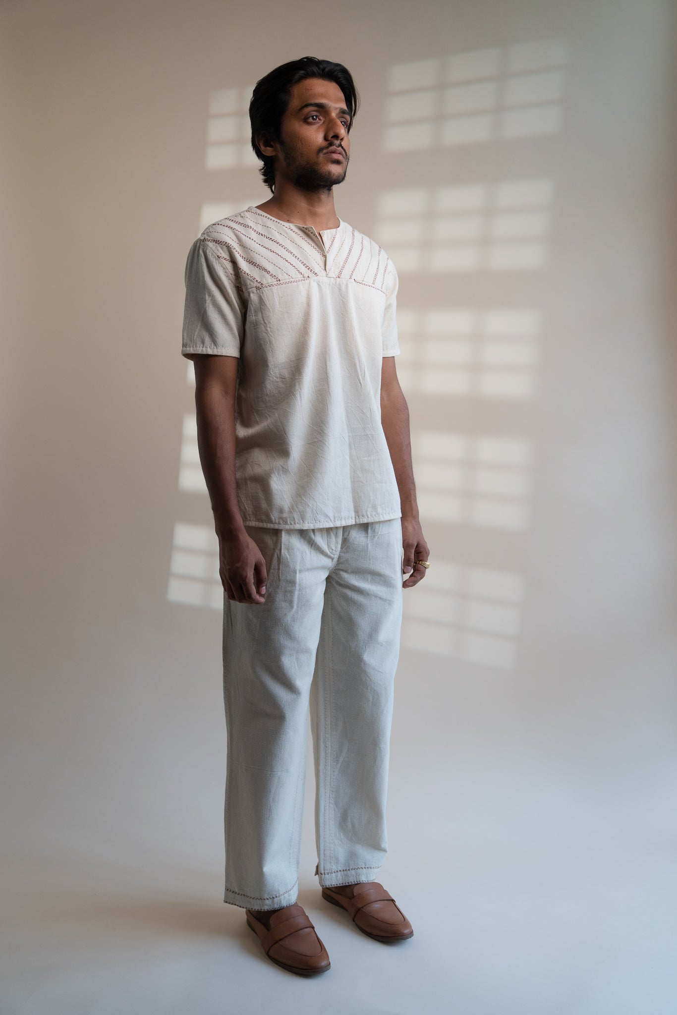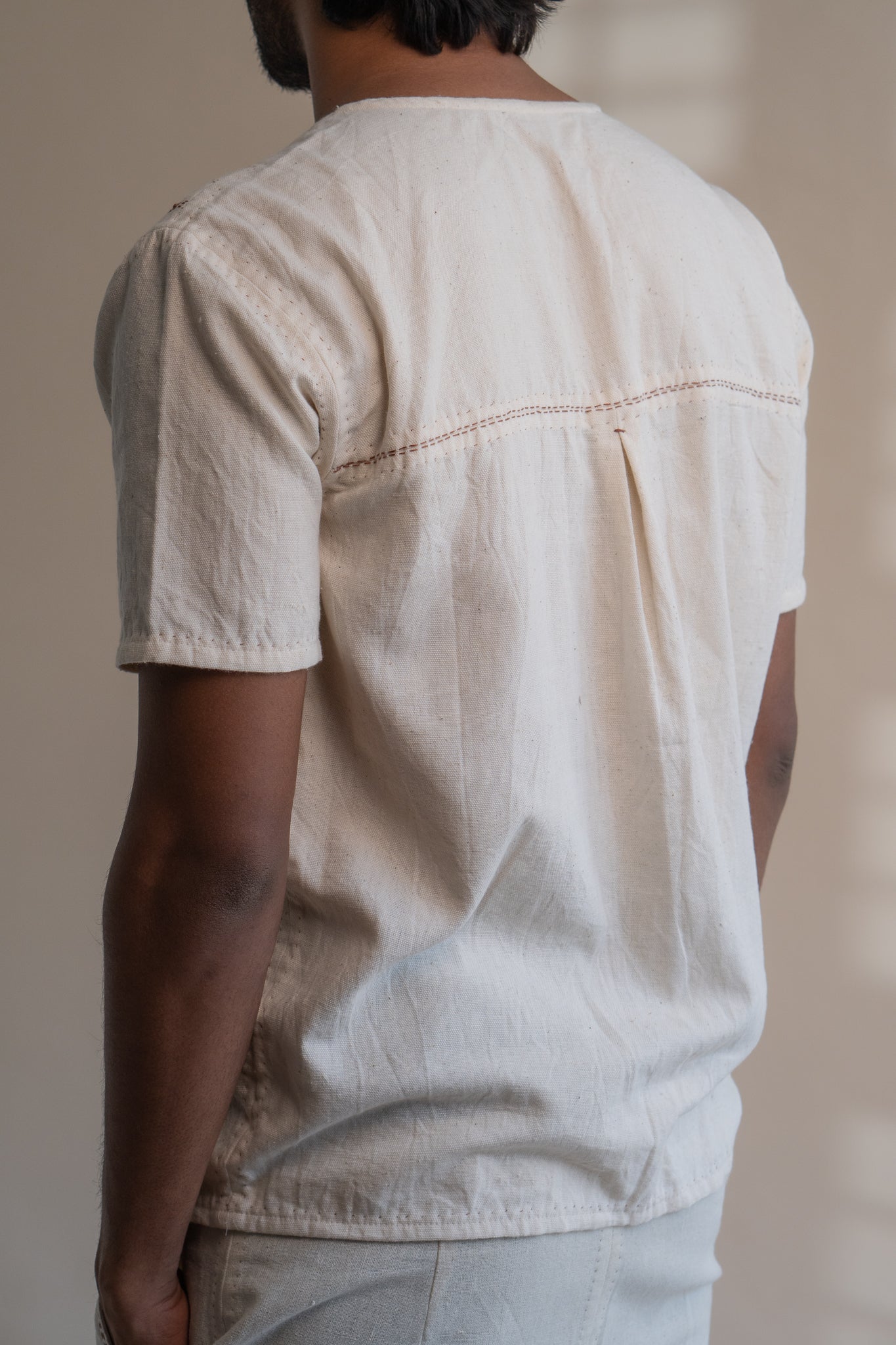This Dawning Overlap Placket Shirt comes in a calm and soothing colour that we call Kora. Crafted in 100% cotton fibres and natural materials. This Kala Cotton shirt is undyed and unbleached. It is adorned with the stitches of Kantha, a form of Indian hand embroidery along the upper front yoke. It has adjustable 2 necklines, as an element of multi-functionality involving the wearer in the process of choice and interchangeability.