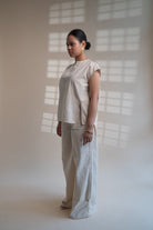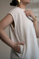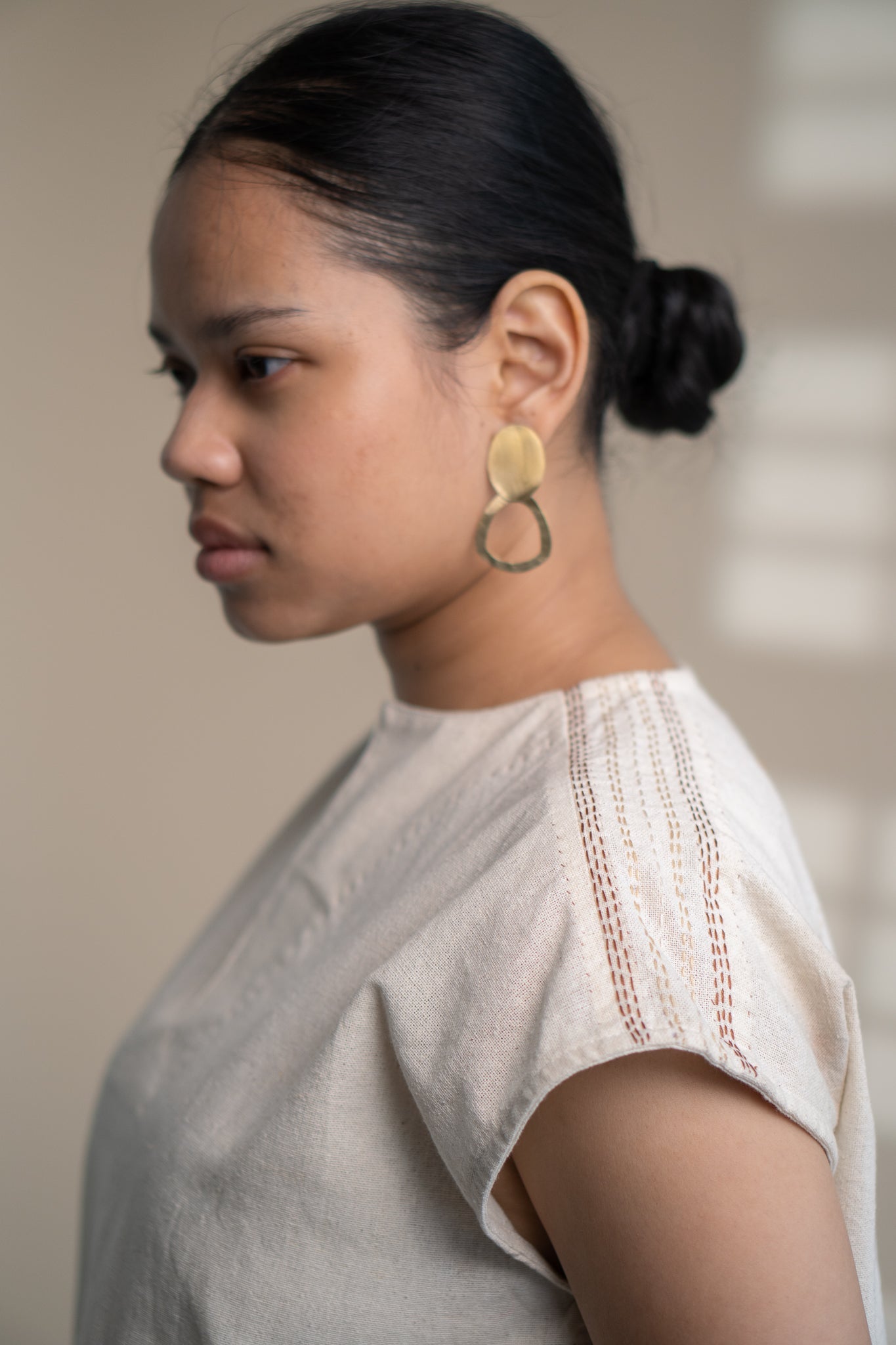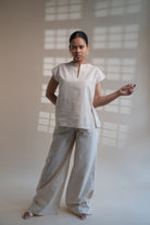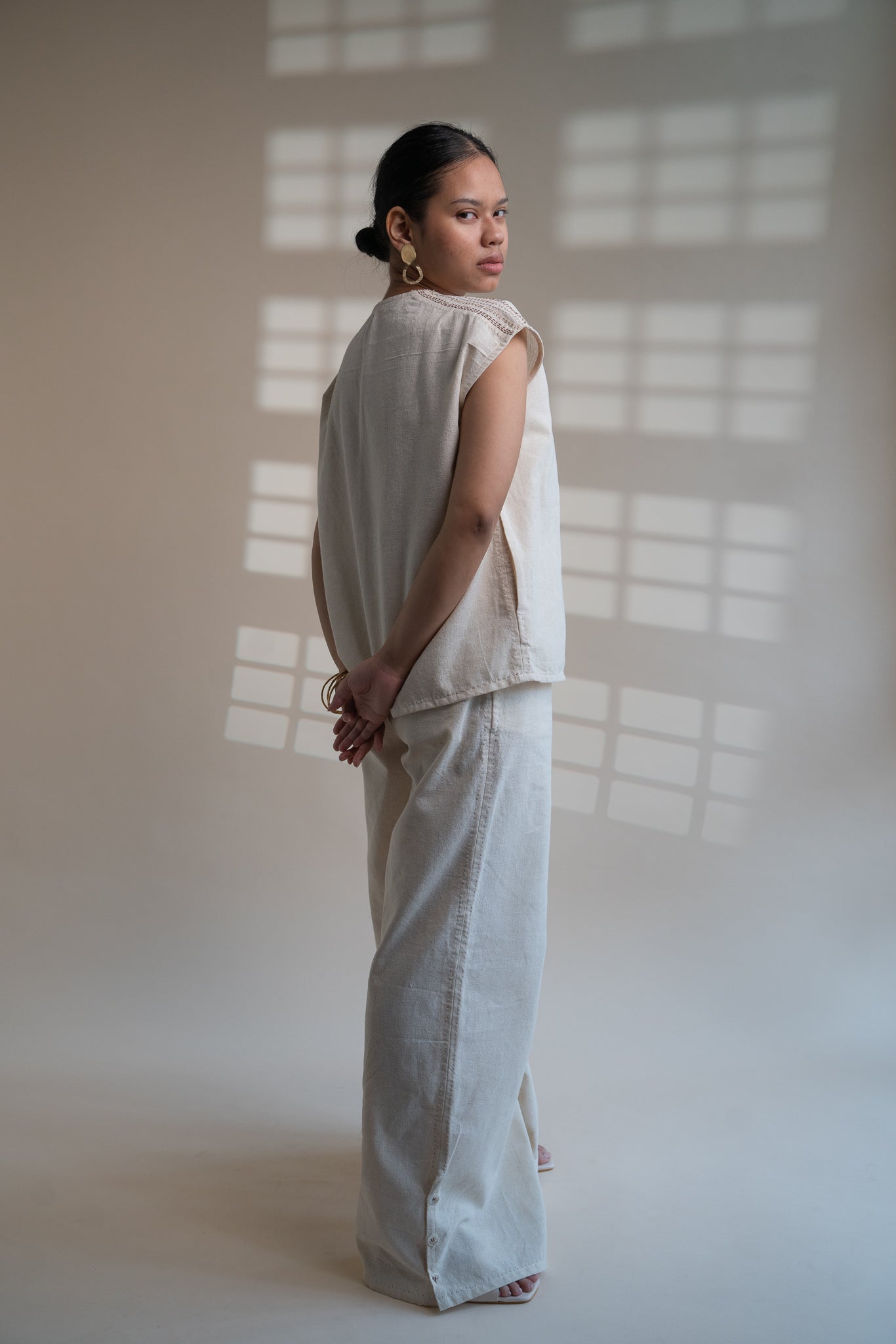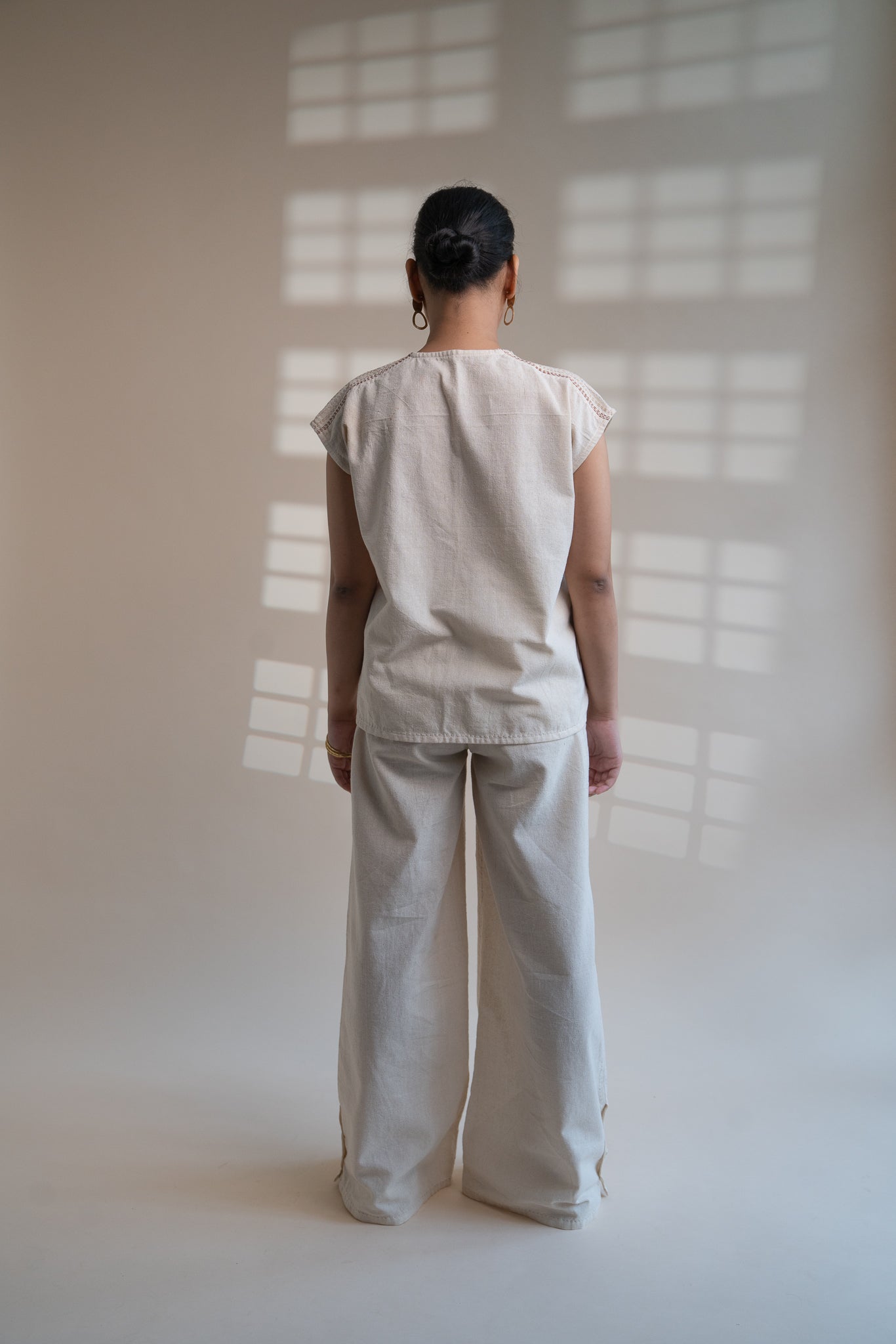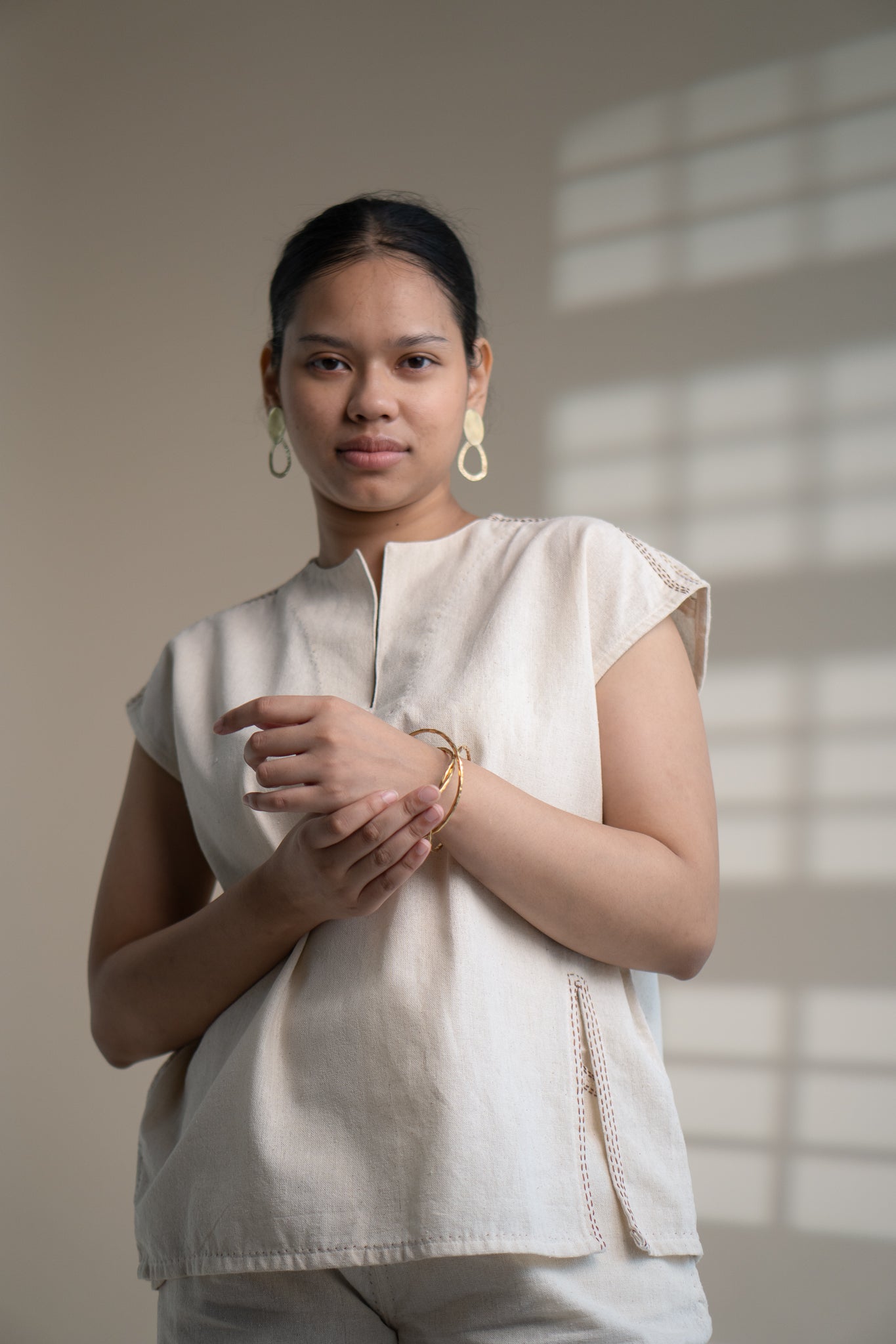 This Dawning Raglan Sleeve Blouse comes in a calm and soothing colour that we call Kora. This elegant silhouette is the perfect piece to elevate your wardrobe. Crafted in 100% cotton fibres and natural materials. This 30s cotton blouse is undyed and unbleached. This shirt comes with a raglan sleeve top and a slightly raised neck. The shoulders are adorned with the stitches of Kantha, a form of Indian hand embroidery.