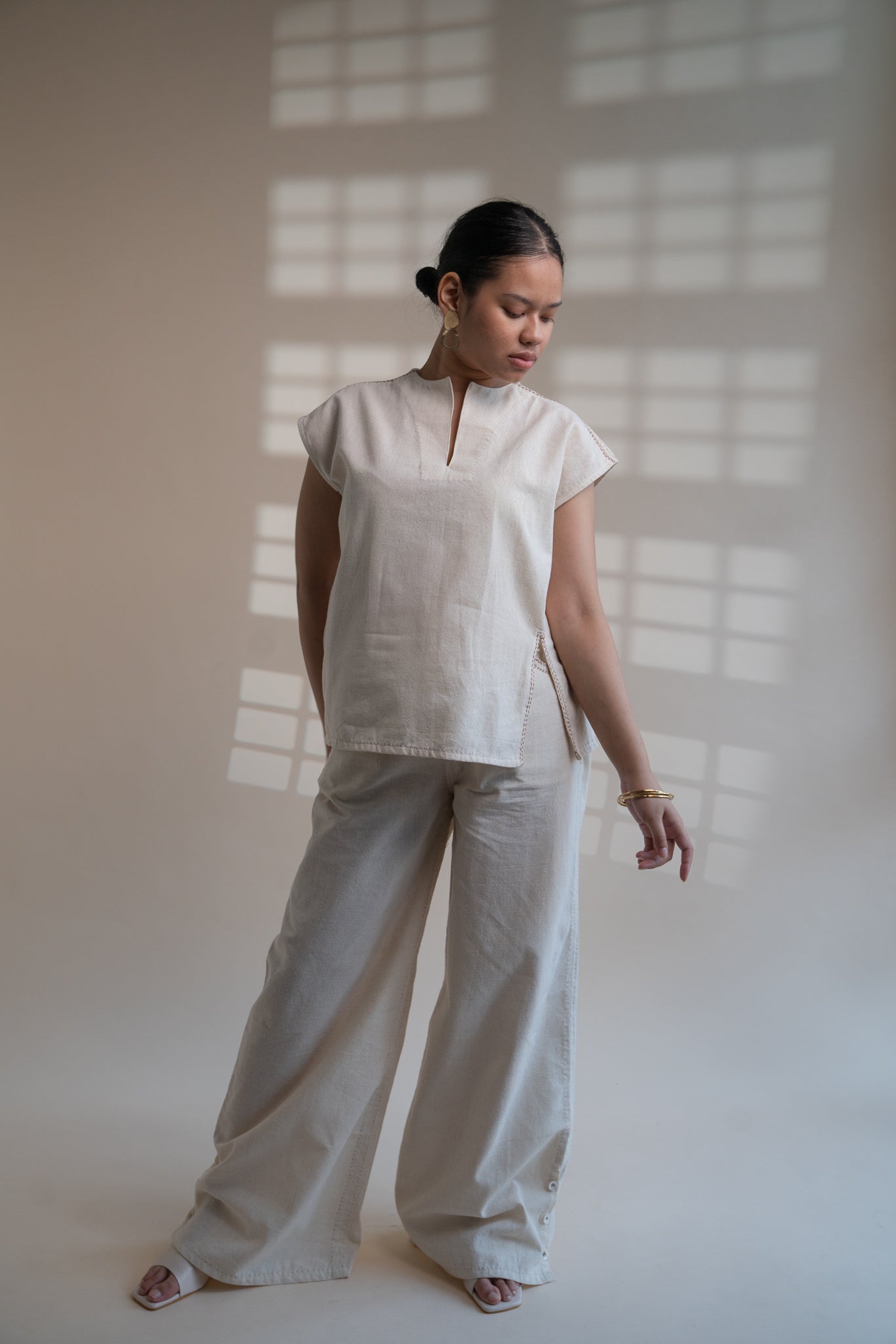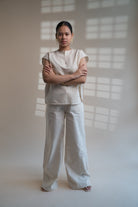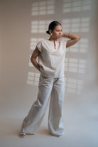 This Dawning Raglan Sleeve Blouse & Slit Pants Set comes in a calm and soothing colour that we call Kora. Featuring an elegant silhouette, the blouse makes the perfect piece to elevate your wardrobe. The crisp raglan sleeve, a slightly raised neck and shoulders adorned with Kantha embroidery, give it a flattering yet powerful appeal. Making a staple piece for any wardrobe, slit pants come with a slight flare at the hem. The cutaway pockets are adorned with diligent hand embroidery. Practical touches include side pockets, button-fly fastening and belt loops. It has a buttoned-up slit as an element of multi-functionality involving the wearer in the process of choice and interchangeability.