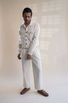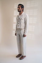 This Dawning Shirt Jacket comes in a calm and soothing colour that we call Kora. Crafted in 100% cotton fibres and natural materials. This 30s cotton shirt jacket is undyed and unbleached. This full-sleeve shirt jacket comes with statement buttons, panelling and side pockets. Stitches of Kantha, a form of Indian hand embroidery, line the pockets and panels.