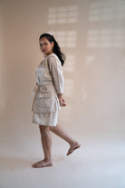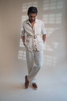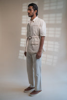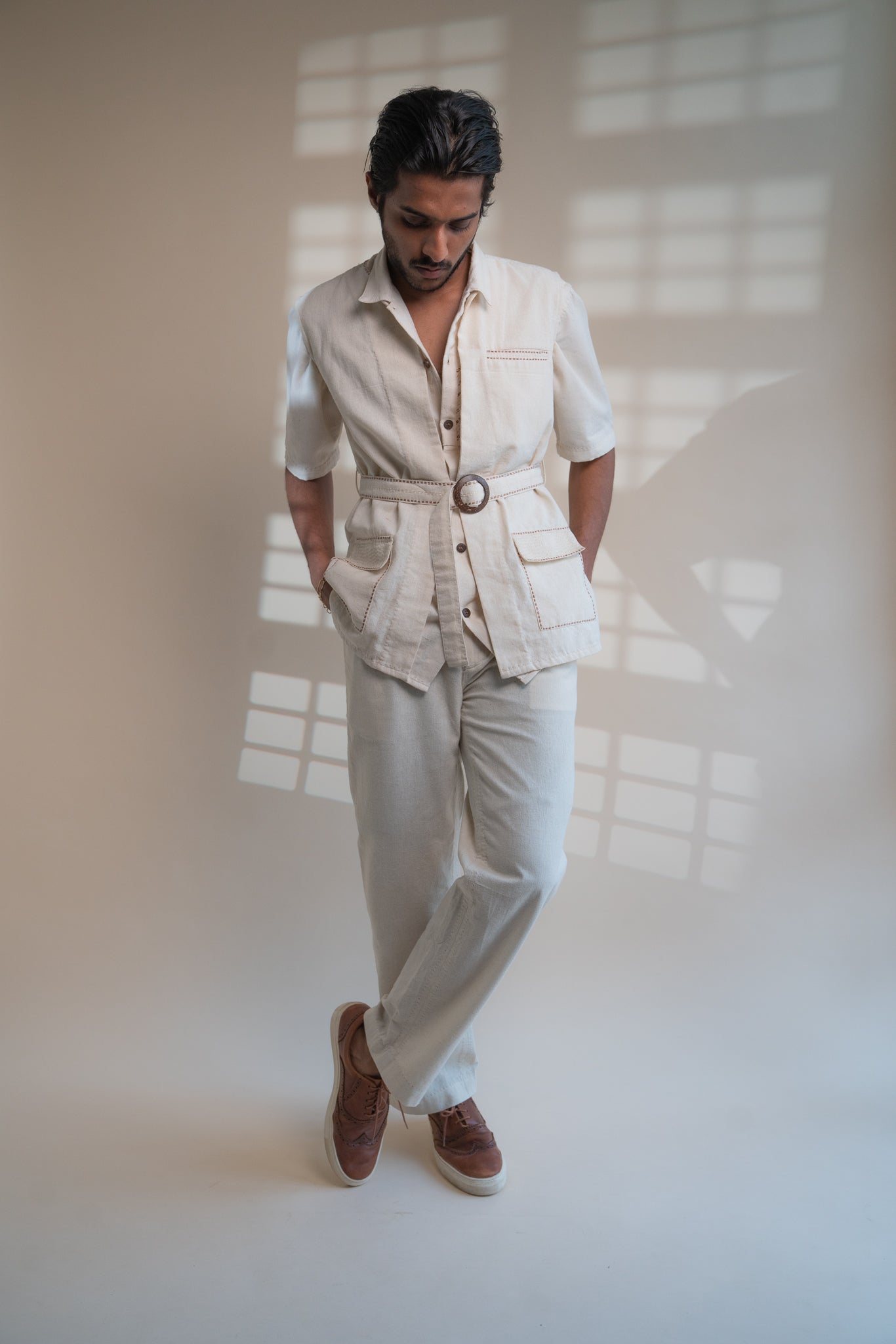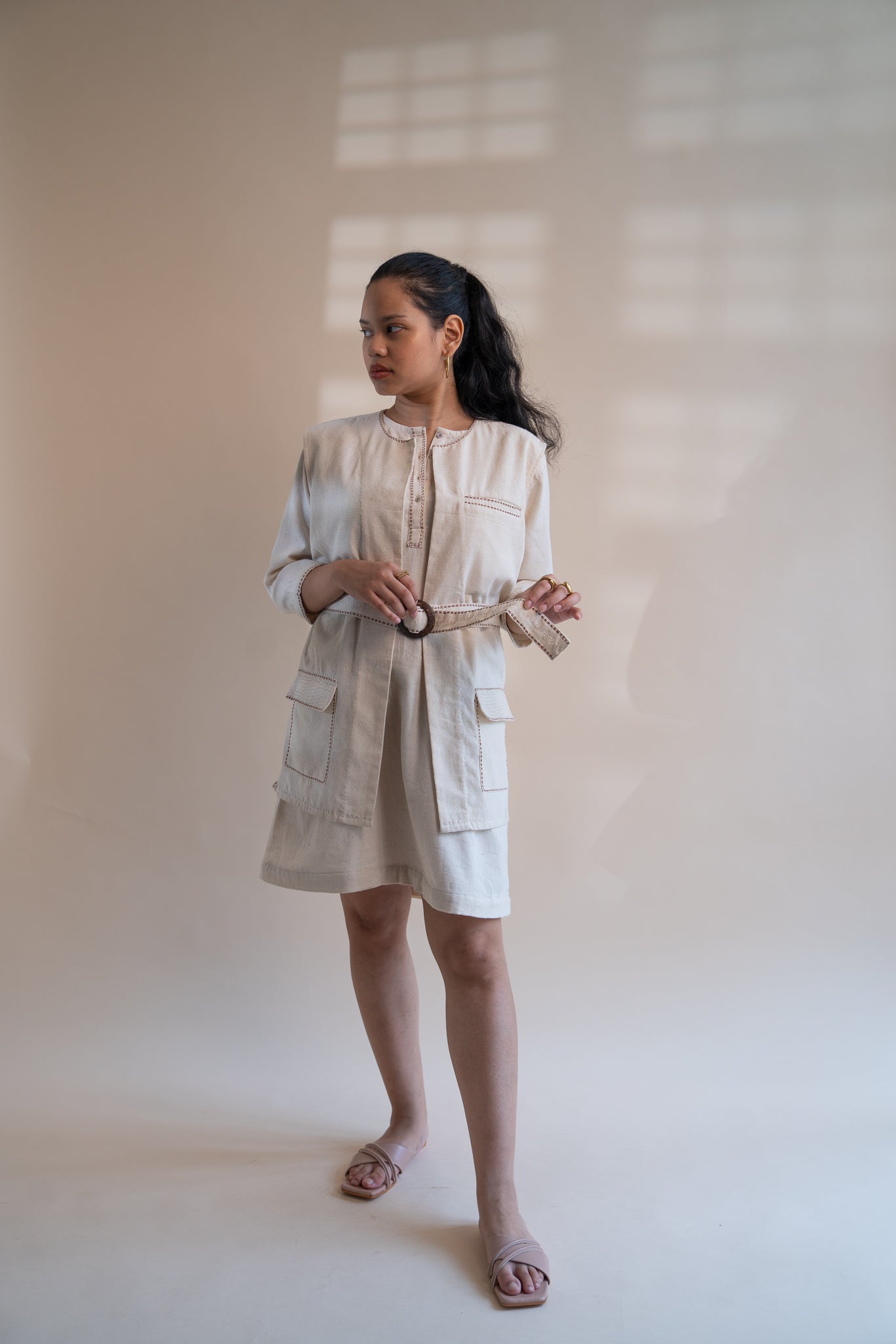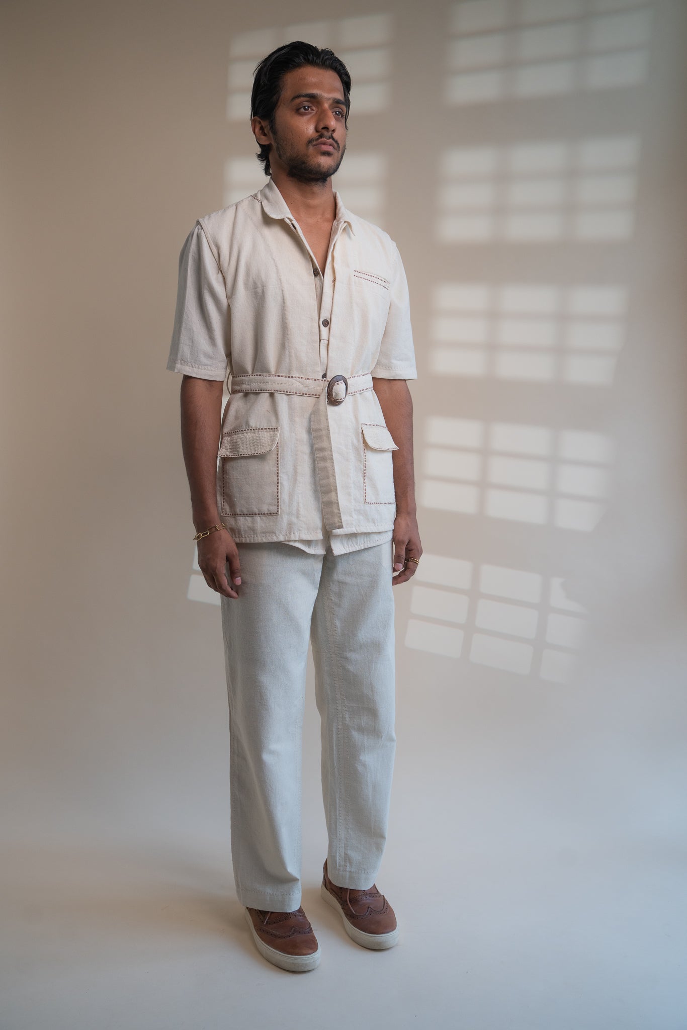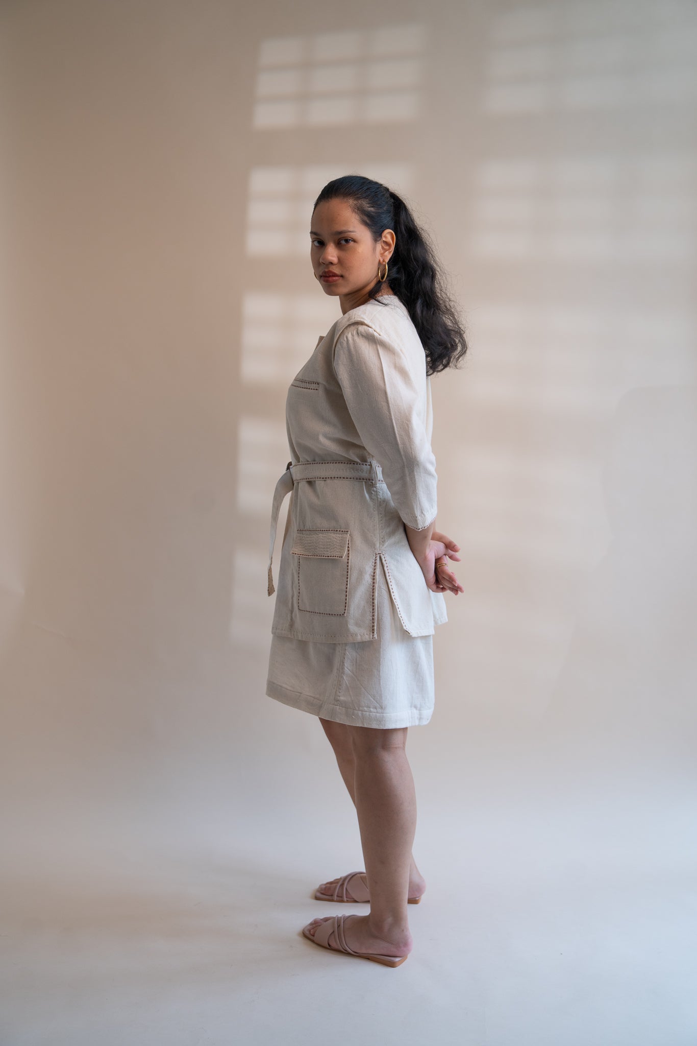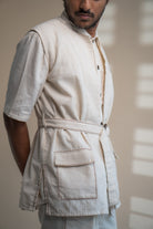 This Dawning Unisex Vest comes in a calm and soothing colour that we call Kora. Crafted in 100% cotton fibres and natural materials. This 30s cotton blazer is undyed and unbleached. This unisex jacket comes with a round neck and patch pockets. It is adorned with the stitches of Kantha, a form of Indian hand embroidery along the patch pocket and belt. It has an adjustable and removable belt as an element of multi-functionality involving the wearer in the process of choice and interchangeability. It is best paired with our Dawning Straight Pants or Dawning Pleated Pants. Please note that this fabric is Ambar Charkha spun, hand woven using traditional weaving techniques, and undyed, so may vary in colour and texture. This garment is 100% biodegradable allowing it to complete its journey. Ethically Made in India from seed to stitch.