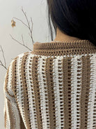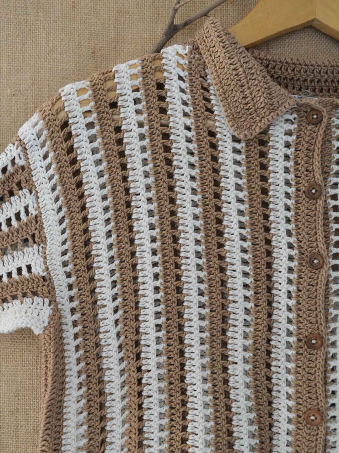 Elevate your wardrobe with the unisex Earth Stripe Crochet Shirt. Featuring a sophisticated brown and white stripe pattern, this made-to-order shirt blends style with a natural, artisanal charm.