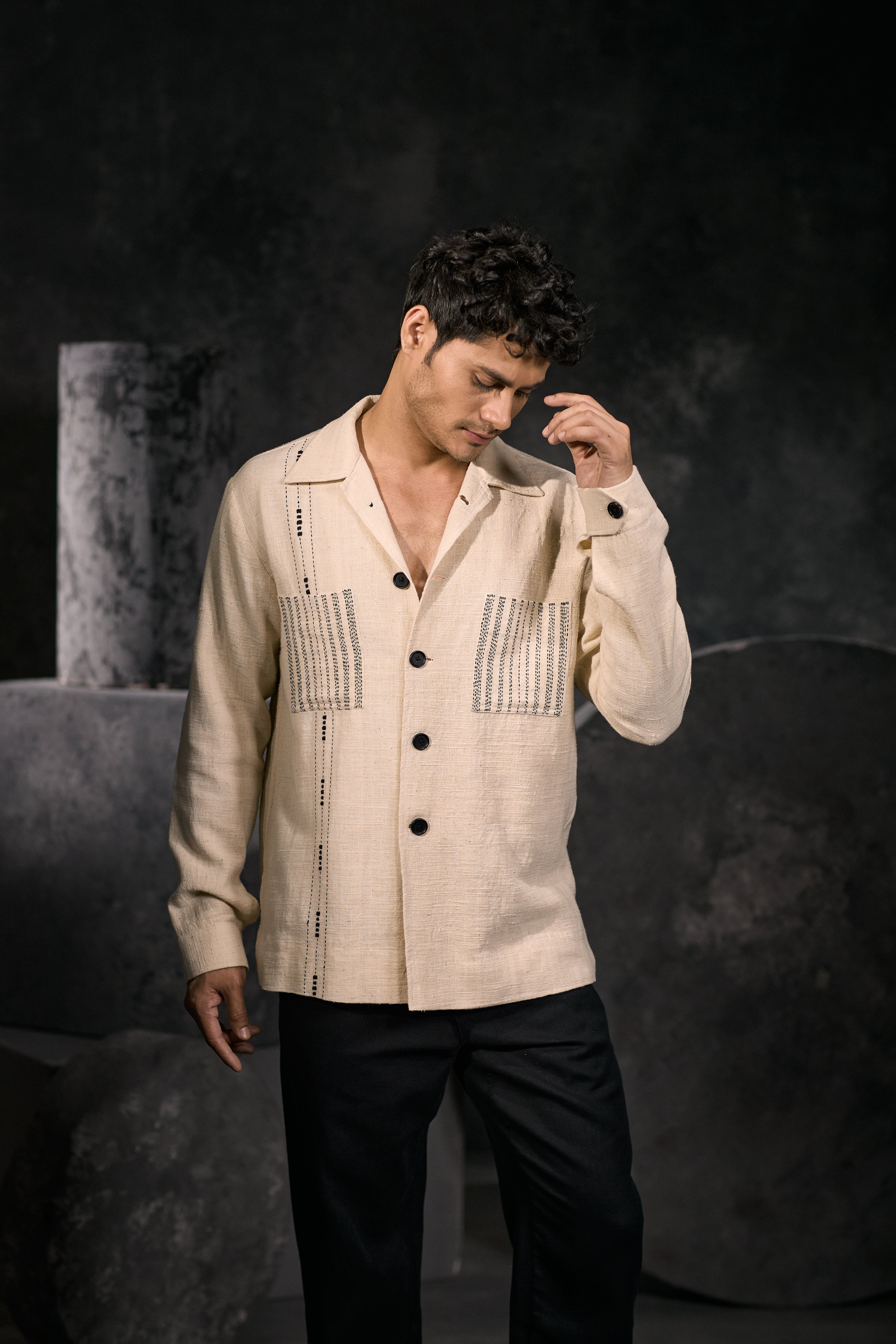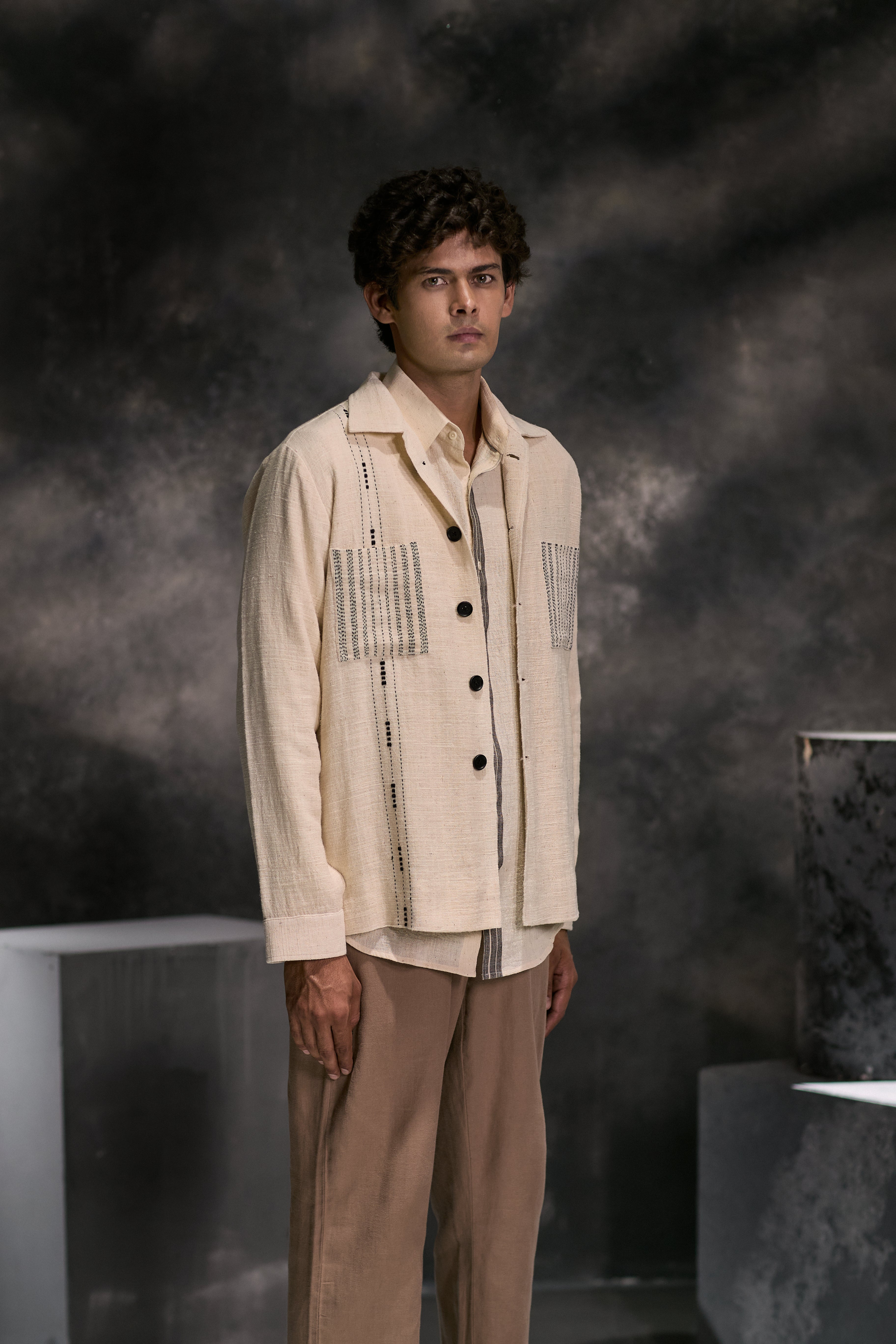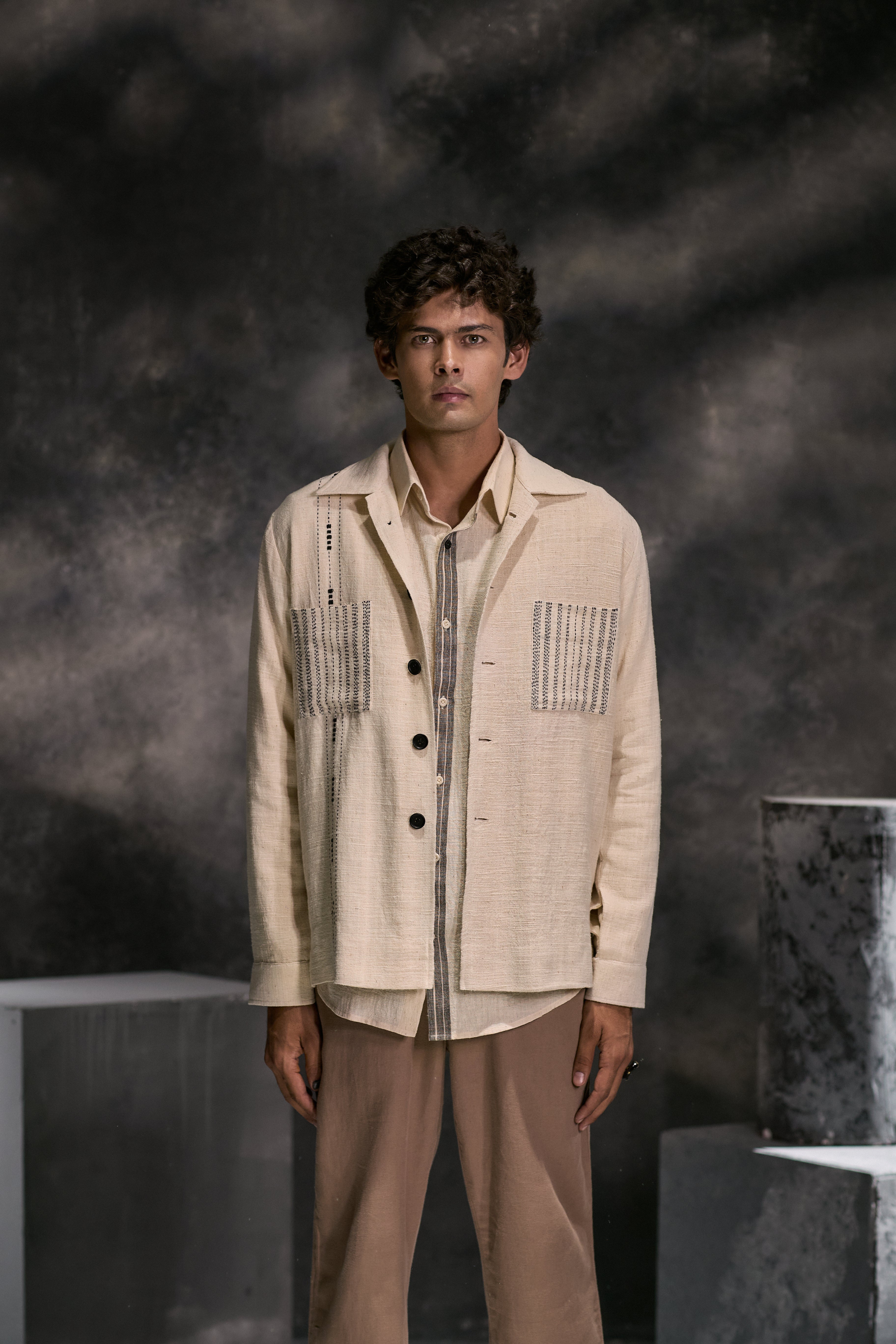 The jacket is made from handwoven organic Kala cotton yarns. The fabric is handspun on a Peti Charkha and has a natural, undyed texture. It is skilfully woven on a traditional handloom by artisans in Kutch, Gujarat. This jacket features Running stitch hand-embroidery, and patch pockets, making it ideal for a relaxed yet stylish look. Its slightly oversized fit allows for layering and is designed to be worn over a t-shirt or shirt. Versatile in style, this jacket is flawlessly tailored and comfortable.