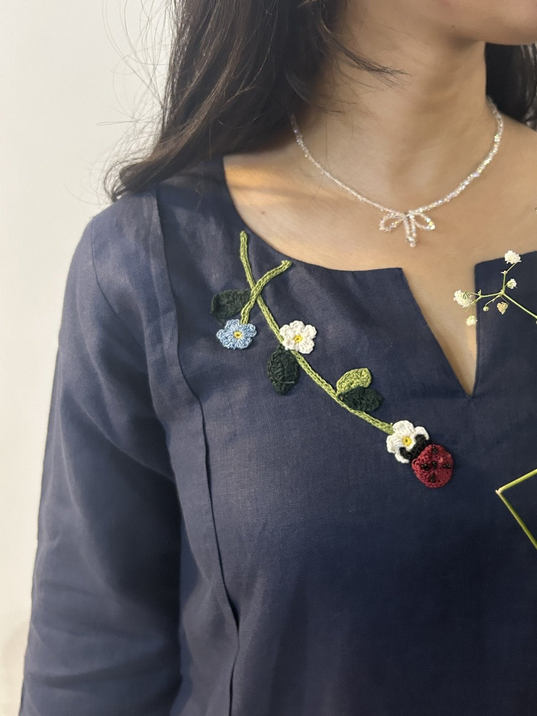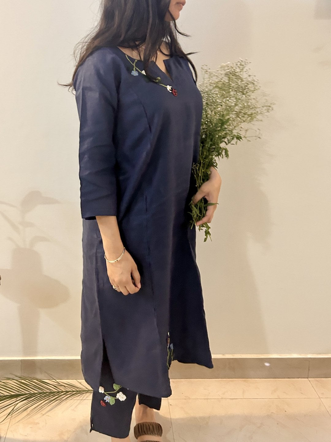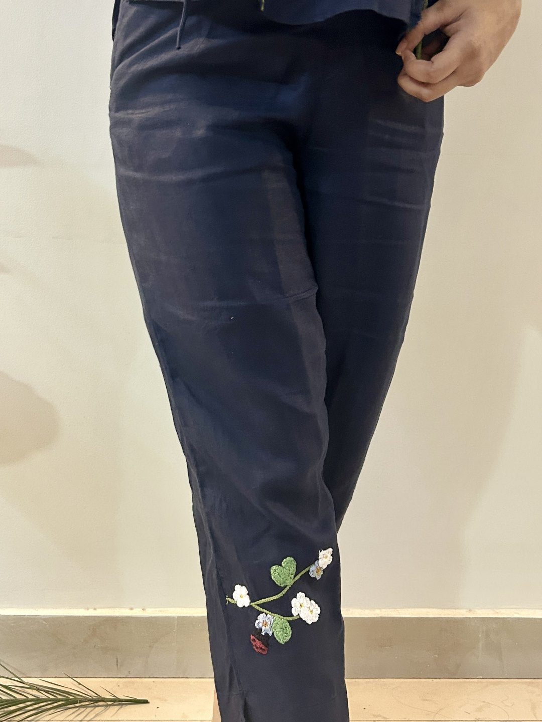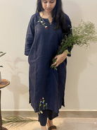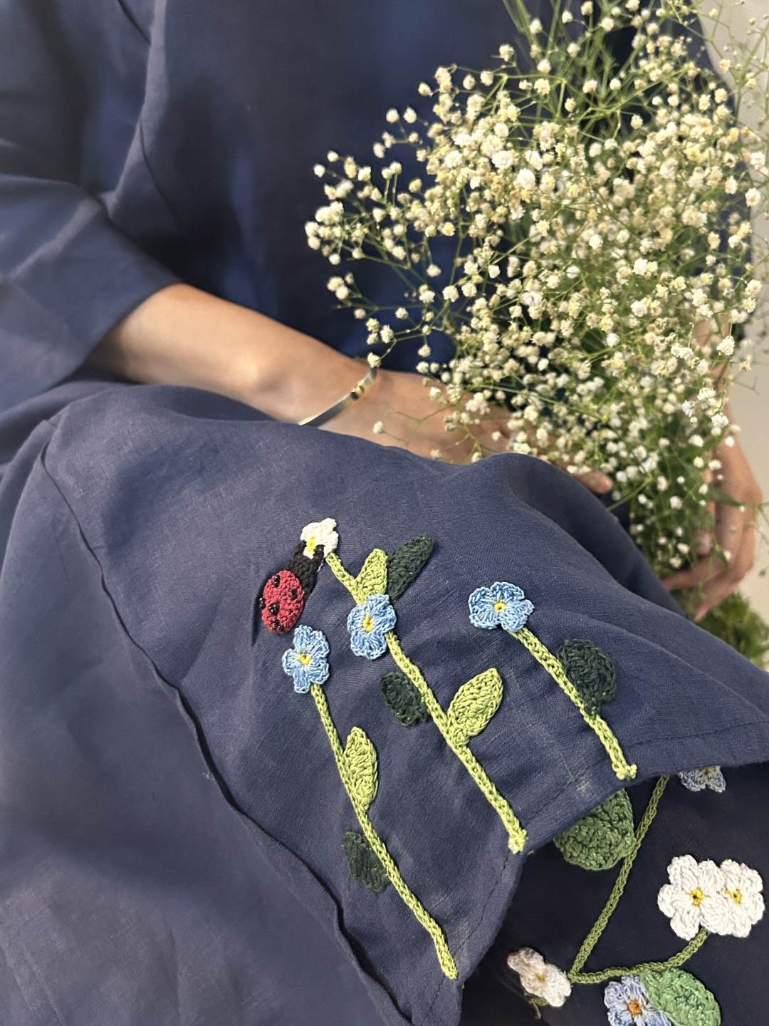 Elevate your wardrobe with the Indigo Bloom Linen Set, featuring the Indigo Bloom Linen Dress and Indigo Serene Stitch Linen Trousers for a coordinated and sophisticated look.