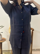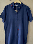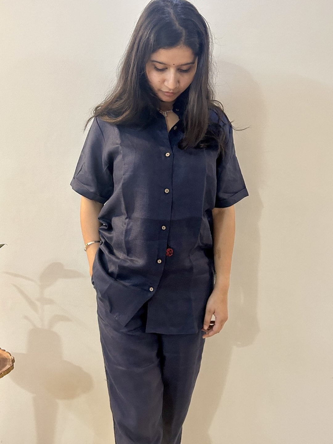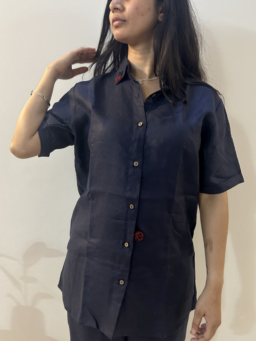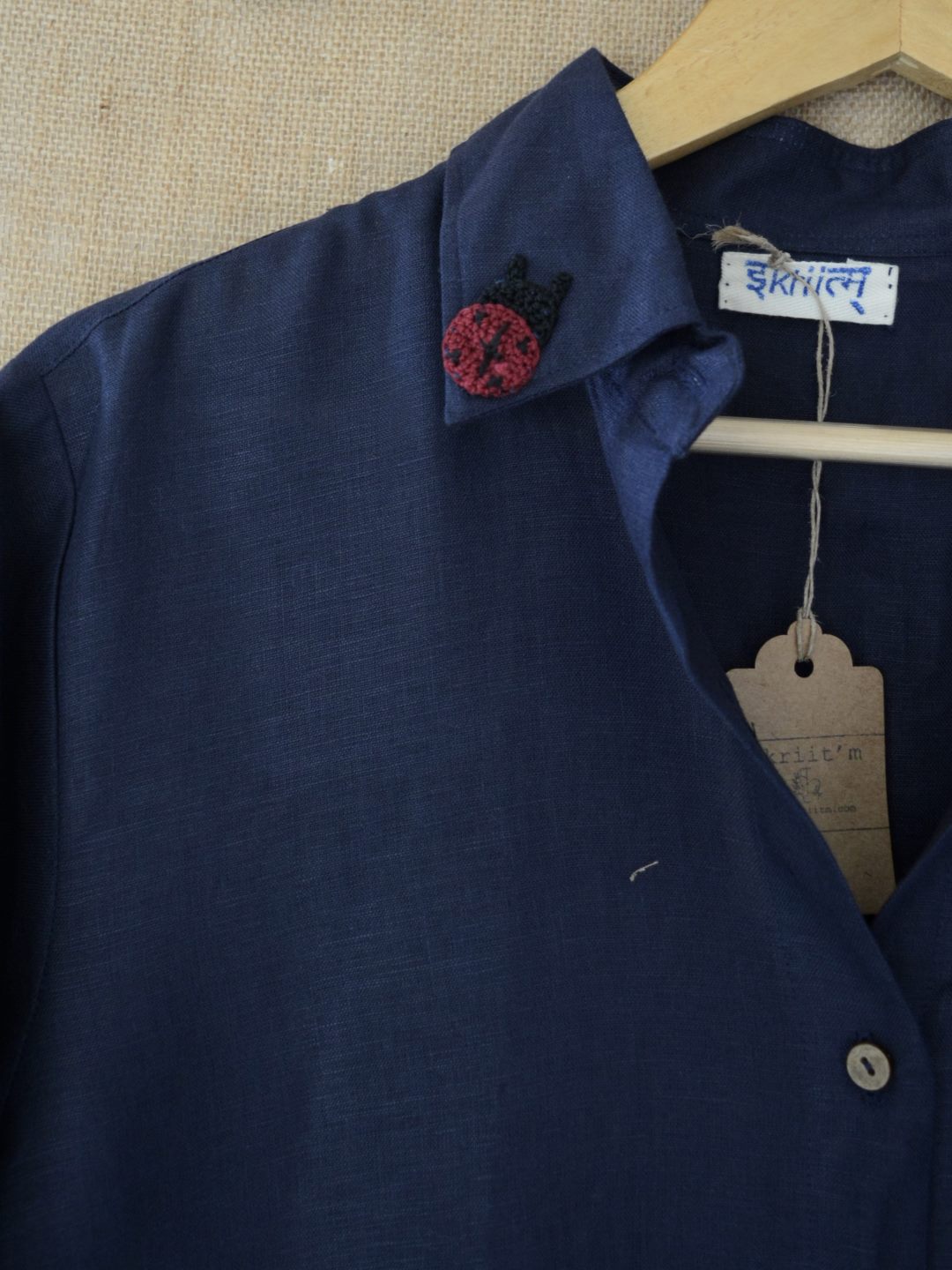 Add a touch of charm to your wardrobe with the Indigo Ladybug Shirt. Made from premium linen, this unisex shirt features a front placket with wooden buttons, a classic shirt collar, and 1/4th sleeves. It is minimally adorned with a crochet ladybug for a subtle, artisanal detail.