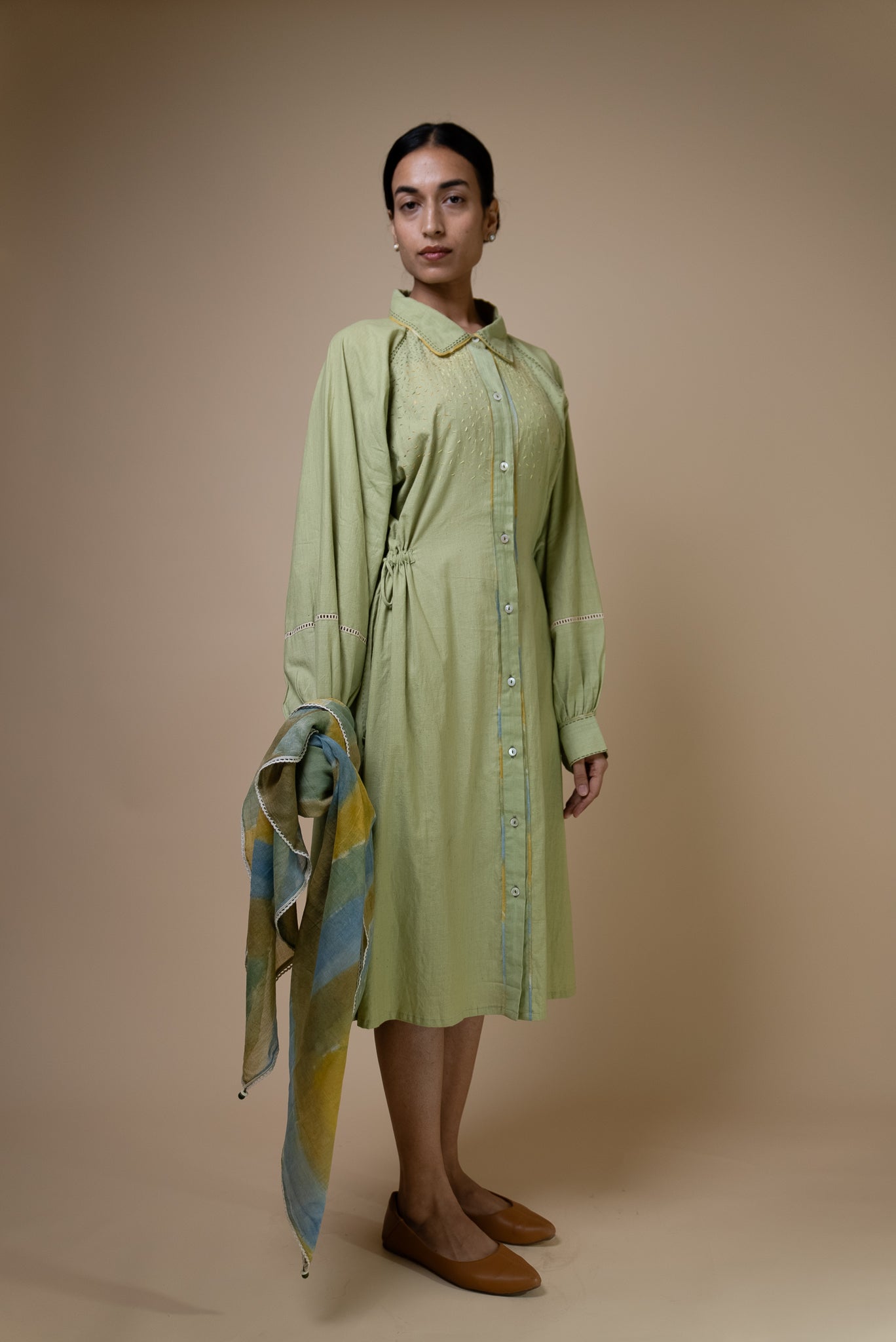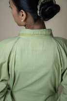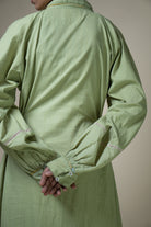 Crafted from 100% cotton fibers and natural materials, the Meadows Embroidered Shirt Dress is made from a sage green handwoven cotton textile, naturally dyed using indigo and pomegranate. The subtle slubbed texture of the fabric gives it a unique character.