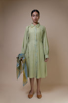 To elevate its design, the dress is adorned with our signature scattered Kantha stitches in tonal shades of yellow and green, cascading gracefully from the shoulders. This thoughtful detailing captures the spirit of the changing seasons, making it a timeless silhouette that seamlessly transitions through any occasion.