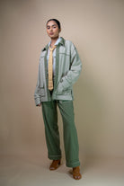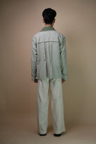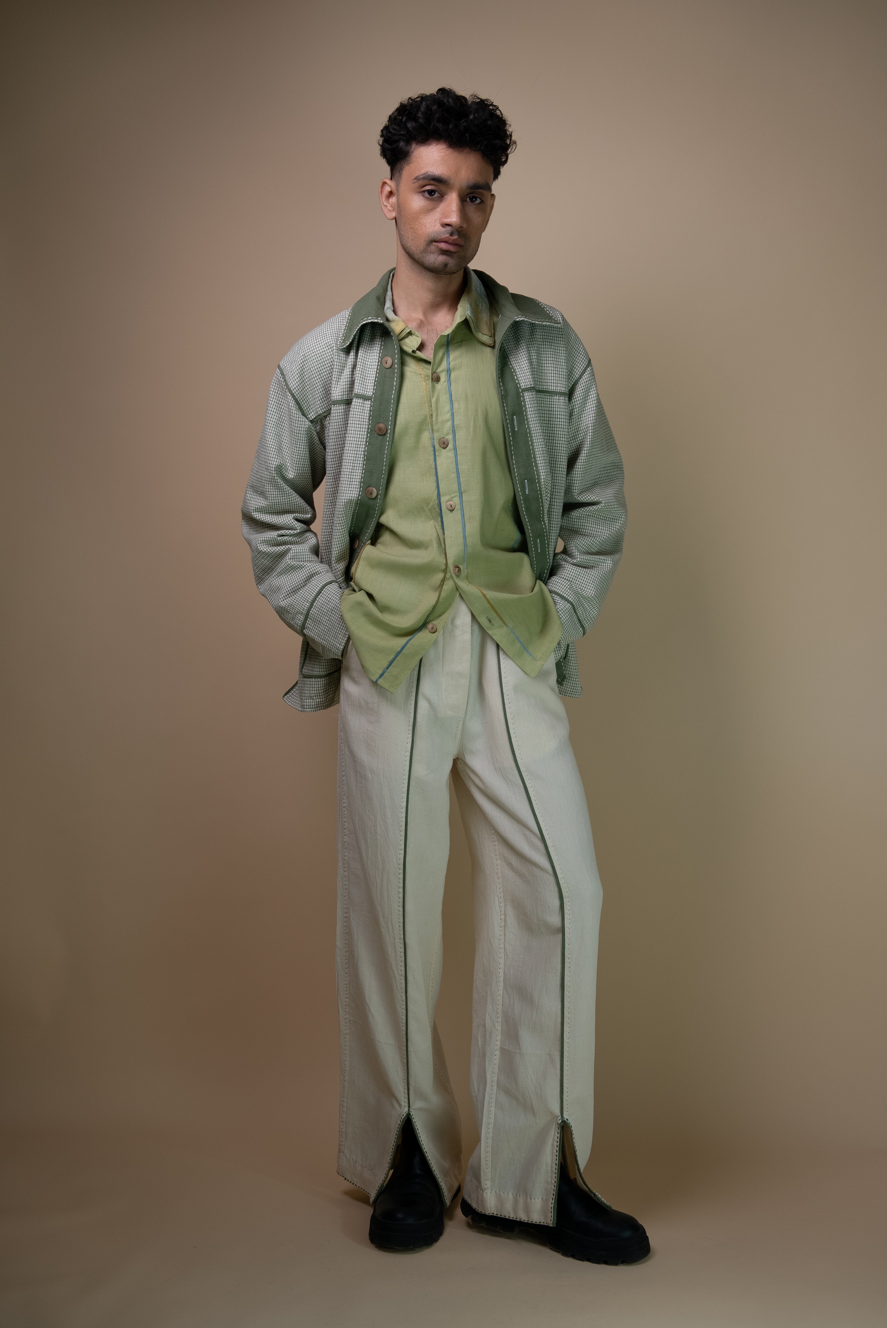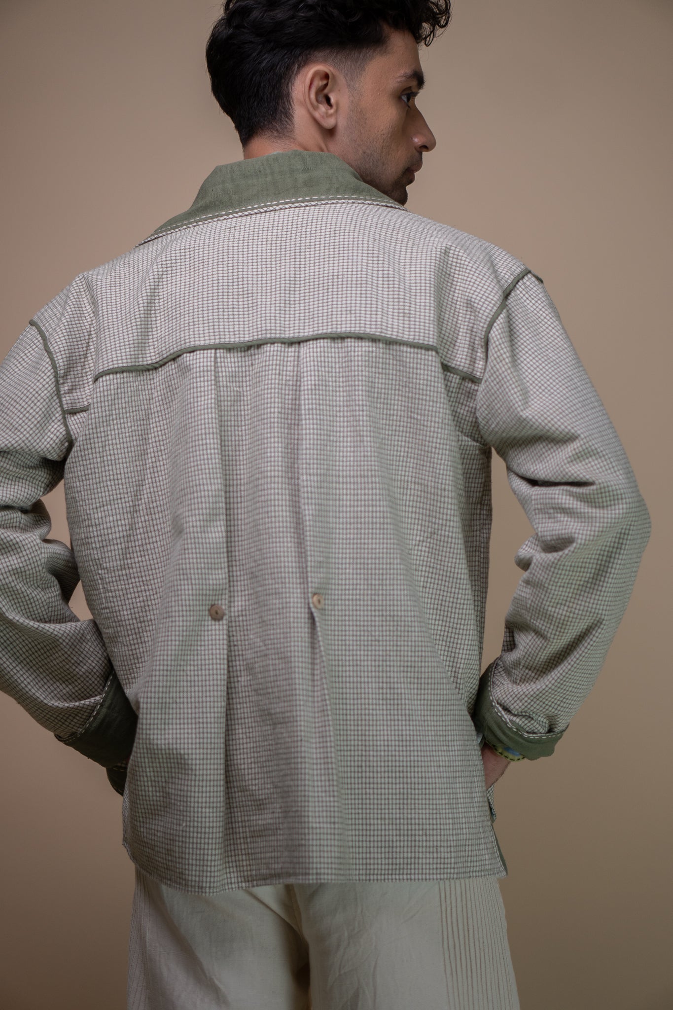 This oversized unisex shirt jacket features drop-shoulder sleeves, accented with olive piping along the panels and patch pockets. The foldable cuffs and colour-blocked placket add distinct style. Versatile and chic, this piece transitions effortlessly between seasons, providing a fresh yet cozy aesthetic that complements any minimalist wardrobe. Kantha lines accentuate the clean contours of the jacket