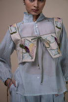 Intricate hand embroidery techniques such as wooden bead embellishments, French knots, bullion knots, lazy daisy stitches, and traditional Kantha lines. Flowing organically from the neckline and cascading downward, the embroidery mimics the natural flow of moss thriving on a shaded forest floor, reflecting the gentle, uneven textures and rich, earthy colours.