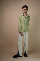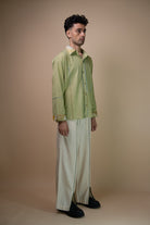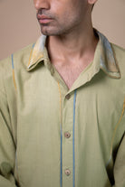 Designed in a relaxed-fit silhouette, it features a layered shirt collar accented with hand-painted Mulmul. Matching details on the cuffs and delicate mulmul piping along with Kantha lines bring an elegant finish to this thoughtfully crafted shirt.