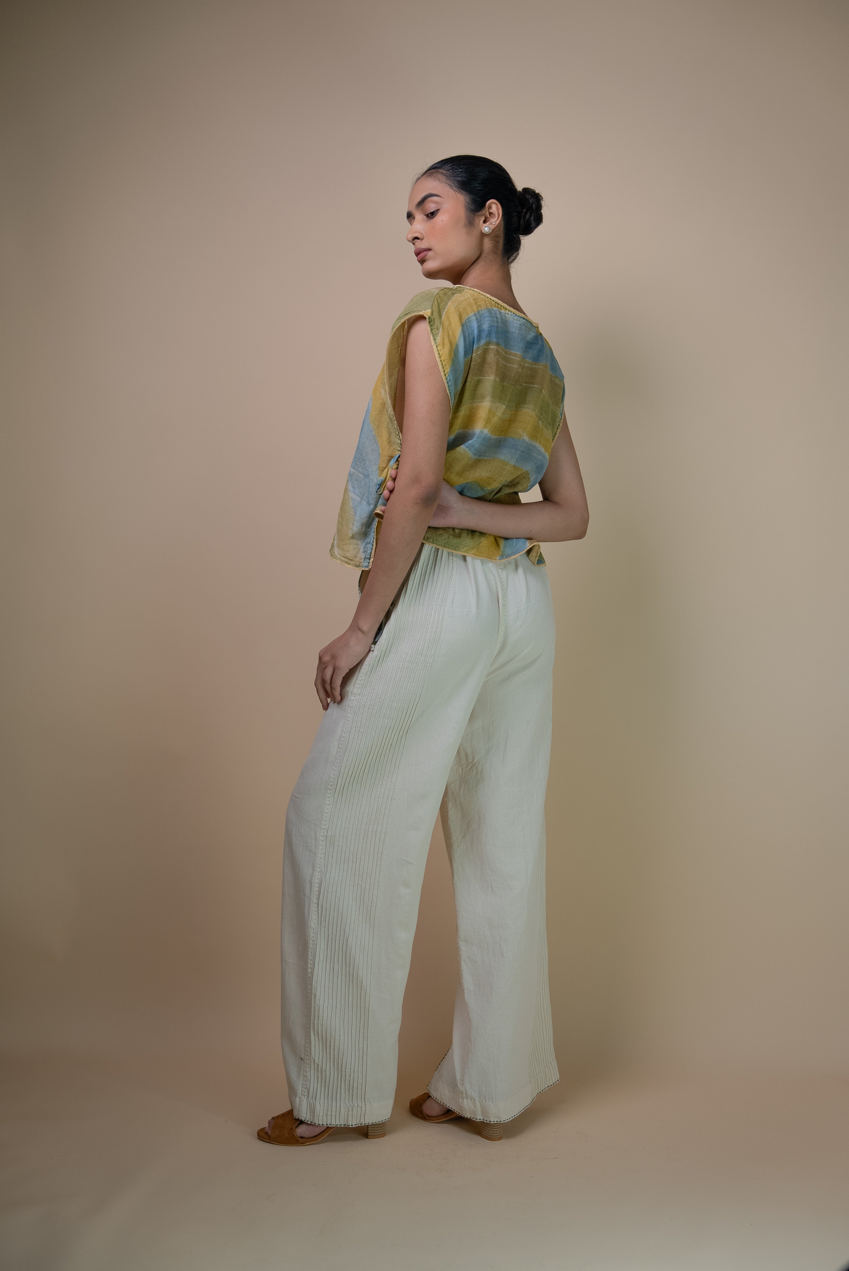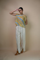 This straight-fit silhouette features a high-waist design with front slits at the hem, accented by olive green piping along the centre and on the cutaway side-pockets. Discreet drawstrings ensure an adjustable fit, while pintucked panels at the back add texture and structure. Subtle Kantha detailing along the hem brings a touch of hand-embroidered detail to these off-white pants.