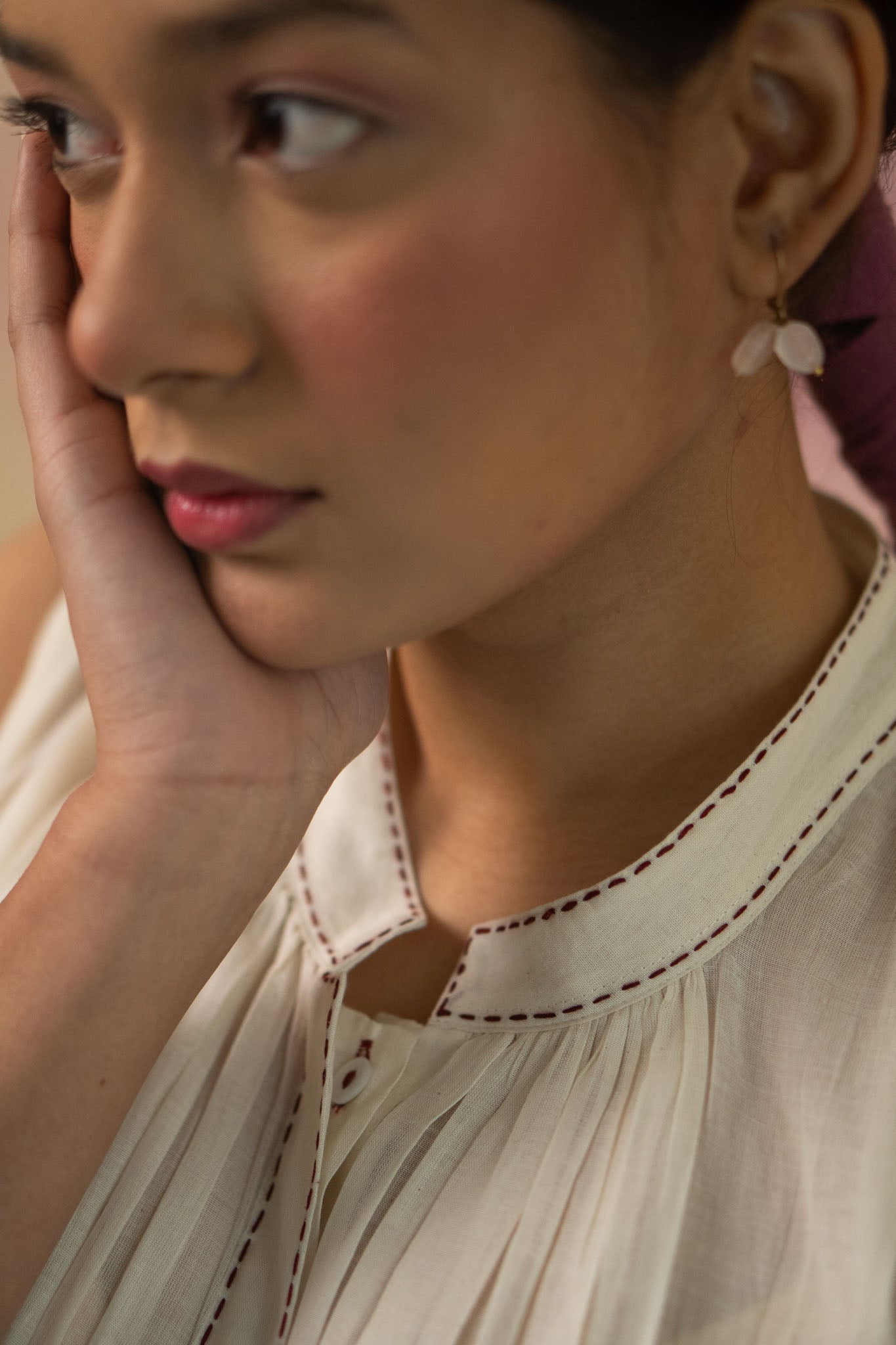 The sheer and weightless texture of the light Mul Mul fabric allows the delicate gathers to cascade gracefully around the yoke, creating a visual symphony of style. The hidden placket & mandarin collar is accentuated with stitches of Kantha, a form of Indian hand embroidery.