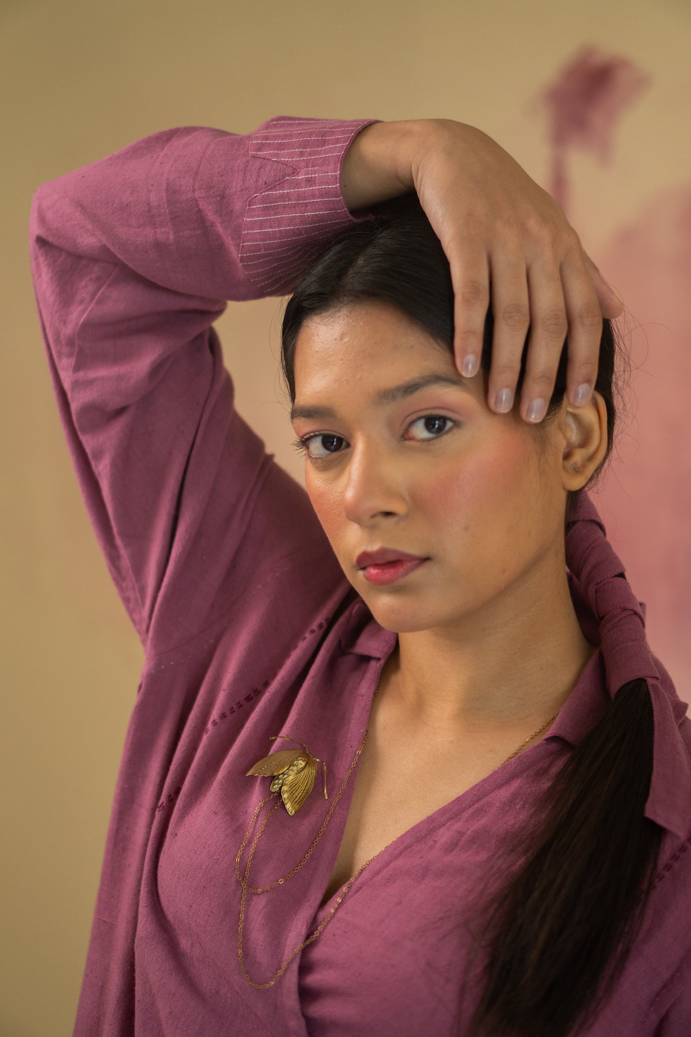 Effortless elegance meets asymmetry in this plum overlay. Enclosed with tie-ups, its easy silhouette boasts spacious pockets and stitch line detailing in a striking contrast of white, creating a look that blends functionality and style.The cuffs, embellished with stitch lines and MOP buttons also serve as a captivating highlight.