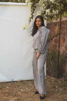 This co-ord set is characterized by its sheer simplicity and yarn dyed diagonal lines, which are created by an offset in the warp threads.