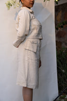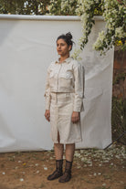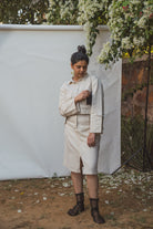 The Sonder Cropped Jacket & Front Slit Skirt come in a calm and soothing colour that we call Kora. Crafted in 100% cotton fibres and natural materials. This co-ord set is undyed and unbleached. Focused on achieving a timeless yet contemporary design the cropped jacket silhouette is simple yet chic, a design that never goes out of fashion. The front and the sleeves of the Kala cotton jacket are tailored with a mix of patch and welt pockets adorned with black stitch lines. An experimental take on a classic summer skirt, the Twill Kora midi-skirt comes with a front mid-slit and features patch pockets attached to the belt. The pockets are highlighted with neat black stitch lines.